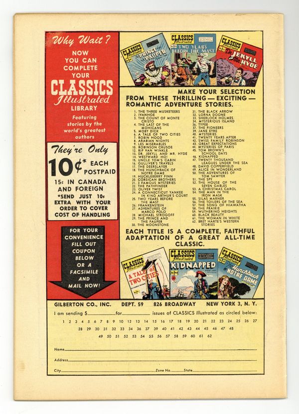Published 1946 by Classics Illustrated.$59.00The Corsican Brothers, 5th Printing, Line Drawing Cover. Edition 5A has Classics Illustrated logo at top of interior pages. (HRN 62, no price, original 6/44 date). Cover price $0.15.