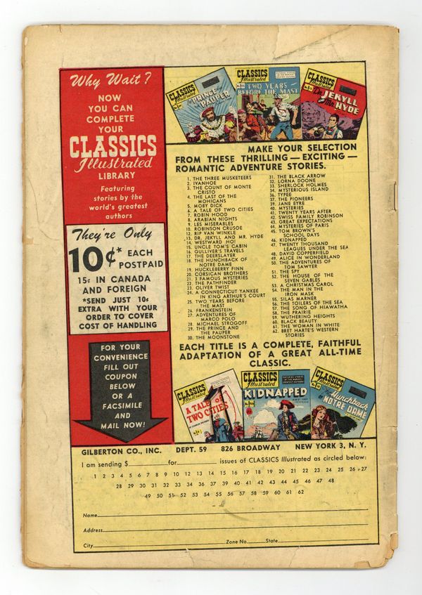 Published 1947 by Classics Illustrated.$13.50- Centerfold detached. Cover and interior oxidation. Interior chipping.