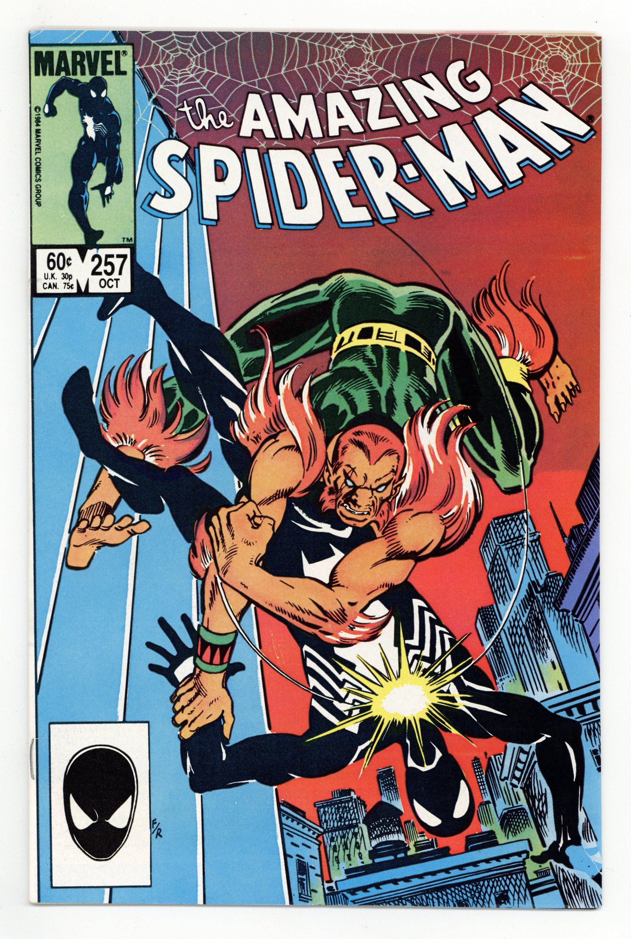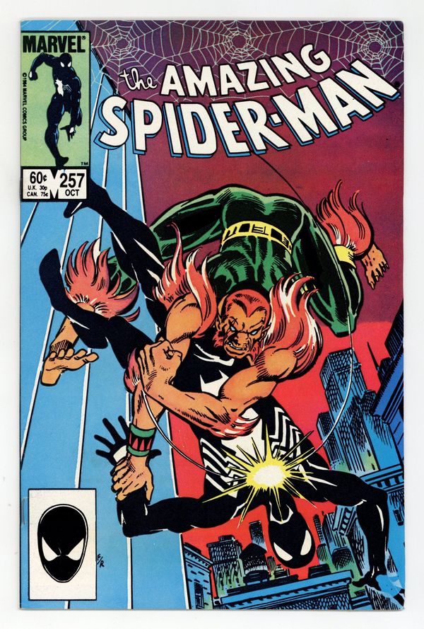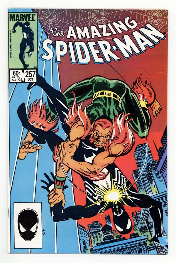 Tags: Marvel Legacy Numbering: Amazing Spider-Man (part 257), Spider-Man$19.50Direct Edition. "Beware the Claws of Puma!" Part 2 of 2. Script by Tom DeFalco. Pencils by Ron Frenz. Inks by Joe Rubinstein. Cover by Ron Frenz and Joe Rubinstein. On a Manhattan rooftop, Puma lines up the wounded wall-crawler for the kill shot, but the Black Cat intervenes at the last possible moment! With a brilliant display of her powers, the cat fights off Puma! And helps the web-slinger limp back to his apartment! After Felicia leaves Peter's pad, Mary Jane walks through the door! And then Puma smashes through the window! Wow, how is Peter going to save Mary Jane much less himself from the wrath of Puma? And so much for the whole secret identity bit! Everything is coming apart at the seams for your friendly neighborhood Spider-Man (including his new costume)! Cameo appearances by the Rose, Kingpin, and Arranger. (Note: In this issue Mary Jane tells Peter that she knows...he is the Amazing Spider-Man.) 36 pgs. Cover price $0.60.
