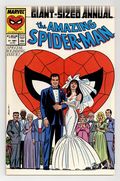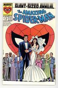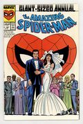 Tags: Spider-Man The Wedding Saga (part 7), Spider-Man$31.50Direct Edition. The marriage of Peter Parker and Mary Jane Watson in "The Wedding." Plot by Jim Shooter. Script by David Michelinie. Pencils by Paul Ryan. Inks by Vince Colletta. Cover by John Romita Sr. Direct Edition. At long last wedding bells ring for Peter Parker and Mary Jane Watson! What an exciting day! The blushing bride will need something old, something new, something borrowed, and something blue! While the Amazing Spider-Man will need to take care of two things before the big day! First, the easy task...short circuit Electro's latest scheme! And second, the tough one...put the memory and heartache of Gwen Stacy in the past forever. Will another trip to the Brooklyn Bridge bring peace to the wondrous wall-crawler? Or will the ghosts of days gone by derail a bright future with Mary Jane? Carpe diem, web-slinger! Appearances by Flash Thompson, Harry Osborn, Liz Osborn, Betty Leeds, Aunt May, Anna Watson, Joe Robertson, J. Jonah Jameson, and Willi Smith. Flashback cameos by the Green Goblin, Gwen Stacy, and Uncle Ben. (Notes: Peter and Mary Jane go on their honeymoon in Spectacular Spider-Man Annual 7. The Direct Edition cover features Peter Parker's friends and family. The Newsstand Edition depicts Spider-Man's friends and foes. Amazing Spider-Man Annual 21 was one of the first issues Marvel published with two different covers. This story was reprinted in the 1991 trade paperback: the Amazing Spider-Man - The Wedding.) 52 pages. Cover price $1.25.