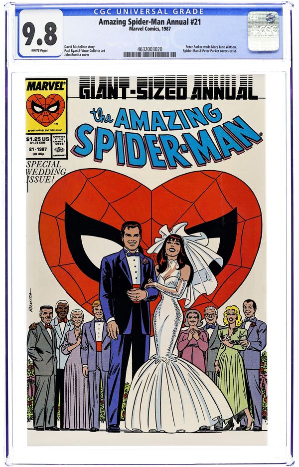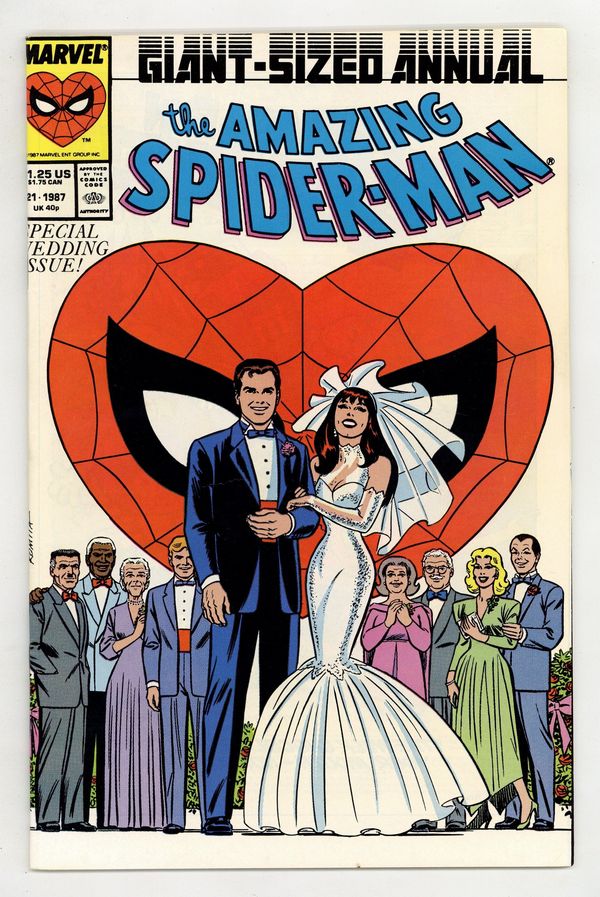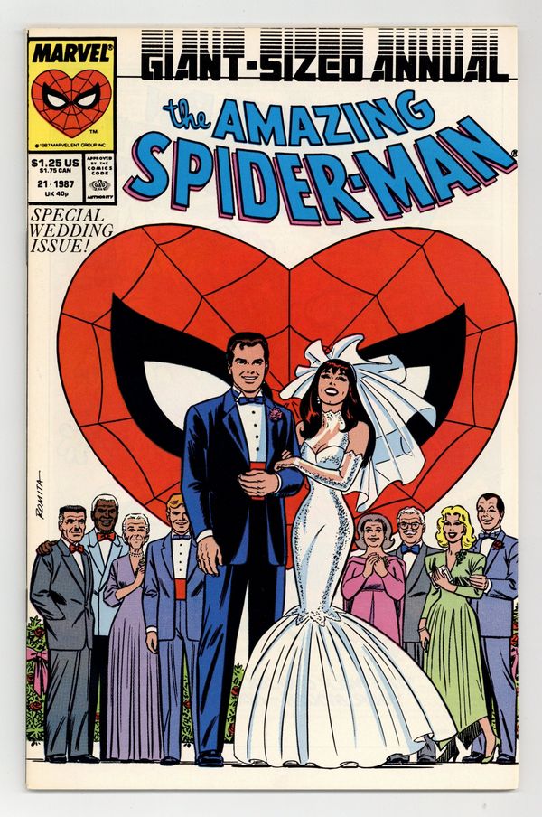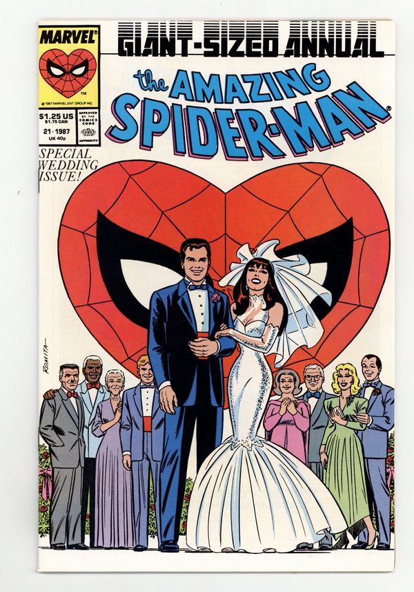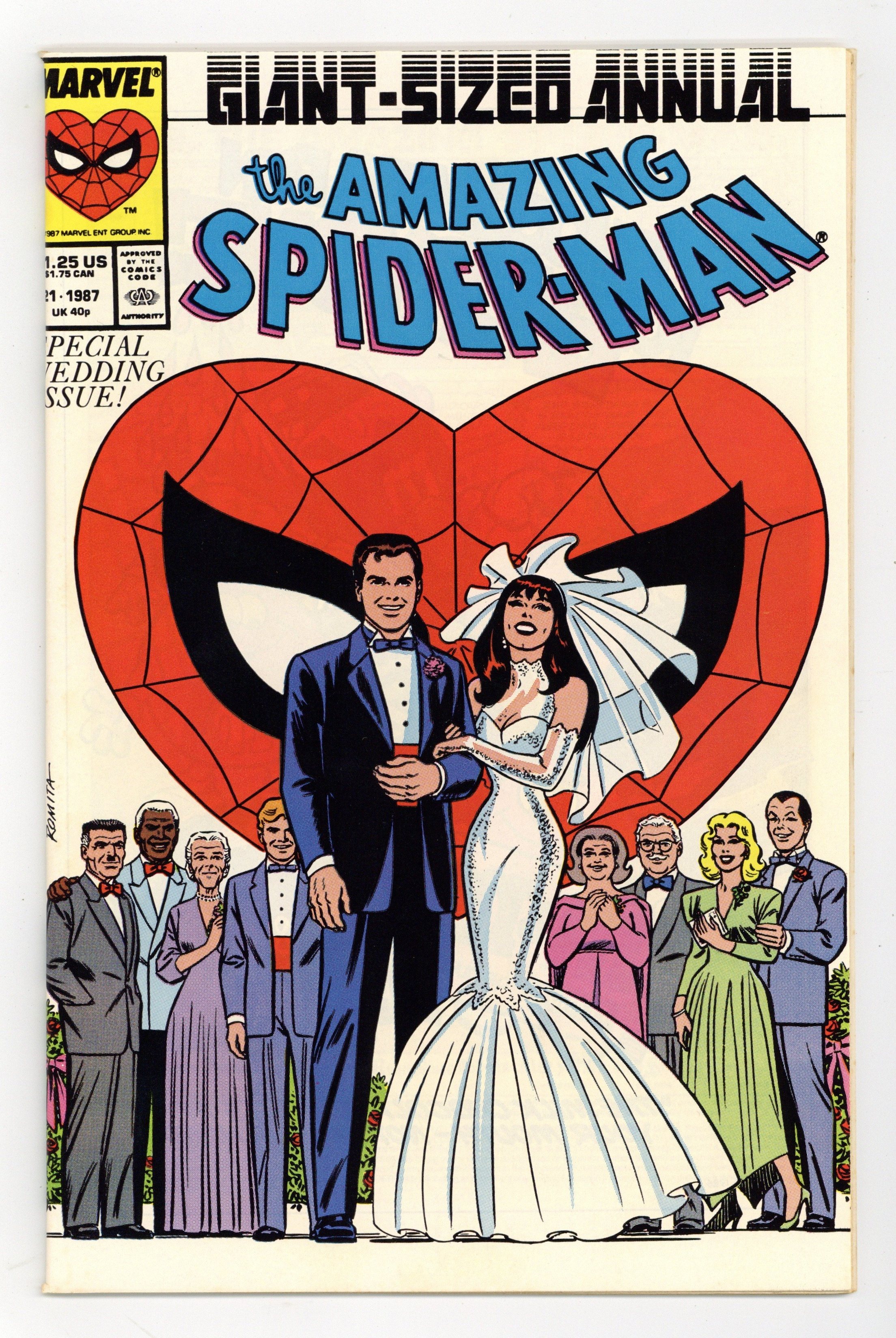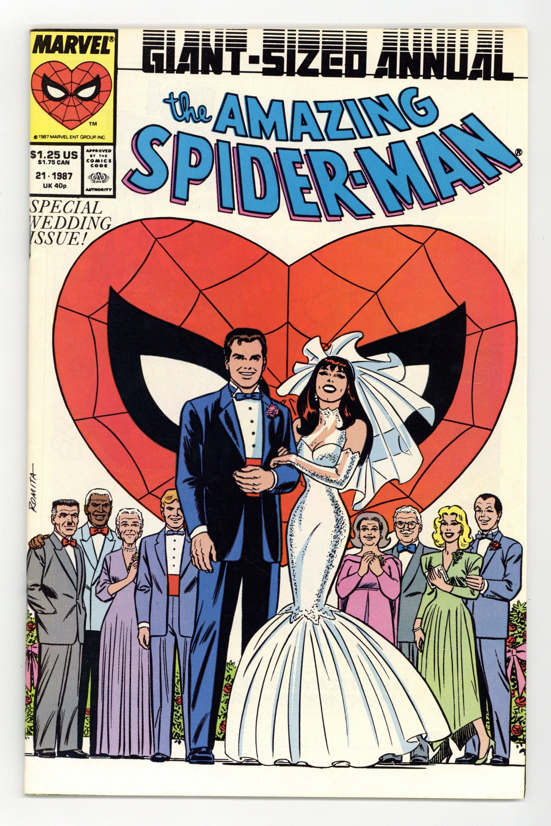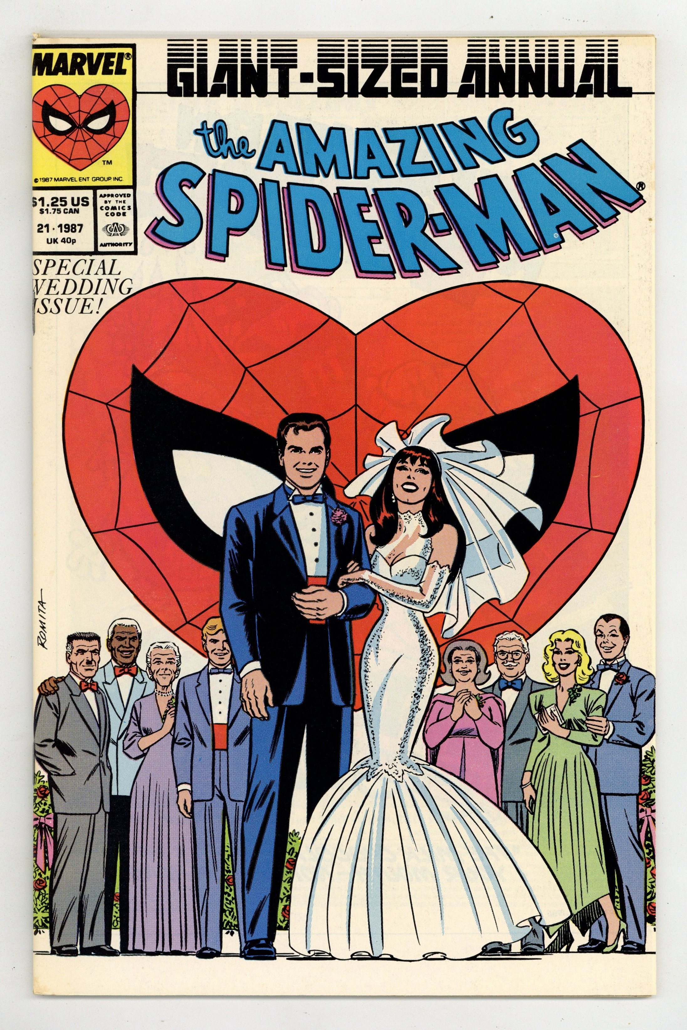 Direct Edition. The marriage of Peter Parker and Mary Jane Watson in "The Wedding." Plot by Jim Shooter. Script by David Michelinie. Pencils by Paul Ryan. Inks by Vince Colletta. Cover by John Romita Sr. Direct Edition. At long last wedding bells ring for Peter Parker and Mary Jane Watson! What an exciting day! The blushing bride will need something old, something new, something borrowed, and something blue! While the Amazing Spider-Man will need to take care of two things before the big day! First, the easy task...short circuit Electro's latest scheme! And second, the tough one...put the memory and heartache of Gwen Stacy in the past forever. Will another trip to the Brooklyn Bridge bring peace to the wondrous wall-crawler? Or will the ghosts of days gone by derail a bright future with Mary Jane? Carpe diem, web-slinger! Appearances by Flash Thompson, Harry Osborn, Liz Osborn, Betty Leeds, Aunt May, Anna Watson, Joe Robertson, J. Jonah Jameson, and Willi Smith. Flashback cameos by the Green Goblin, Gwen Stacy, and Uncle Ben. (Notes: Peter and Mary Jane go on their honeymoon in Spectacular Spider-Man Annual 7. The Direct Edition cover features Peter Parker's friends and family. The Newsstand Edition depicts Spider-Man's friends and foes. Amazing Spider-Man Annual 21 was one of the first issues Marvel published with two different covers. This story was reprinted in the 1991 trade paperback: the Amazing Spider-Man - The Wedding.) 52 pages. Cover price $1.25.