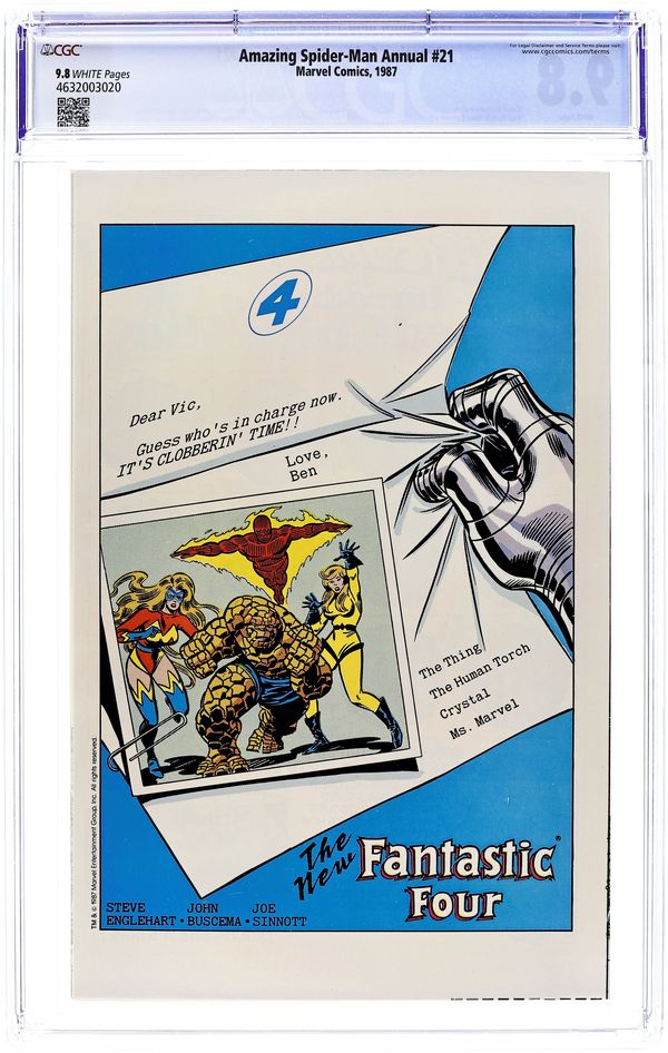 Tags: Spider-Man The Wedding Saga (part 7), Spider-Man$36.00Direct Edition. The marriage of Peter Parker and Mary Jane Watson in "The Wedding." Plot by Jim Shooter. Script by David Michelinie. Pencils by Paul Ryan. Inks by Vince Colletta. Cover by John Romita Sr. Direct Edition. At long last wedding bells ring for Peter Parker and Mary Jane Watson! What an exciting day! The blushing bride will need something old, something new, something borrowed, and something blue! While the Amazing Spider-Man will need to take care of two things before the big day! First, the easy task...short circuit Electro's latest scheme! And second, the tough one...put the memory and heartache of Gwen Stacy in the past forever. Will another trip to the Brooklyn Bridge bring peace to the wondrous wall-crawler? Or will the ghosts of days gone by derail a bright future with Mary Jane? Carpe diem, web-slinger! Appearances by Flash Thompson, Harry Osborn, Liz Osborn, Betty Leeds, Aunt May, Anna Watson, Joe Robertson, J. Jonah Jameson, and Willi Smith. Flashback cameos by the Green Goblin, Gwen Stacy, and Uncle Ben. (Notes: Peter and Mary Jane go on their honeymoon in Spectacular Spider-Man Annual 7. The Direct Edition cover features Peter Parker's friends and family. The Newsstand Edition depicts Spider-Man's friends and foes. Amazing Spider-Man Annual 21 was one of the first issues Marvel published with two different covers. This story was reprinted in the 1991 trade paperback: the Amazing Spider-Man - The Wedding.) 52 pages. Cover price $1.25.