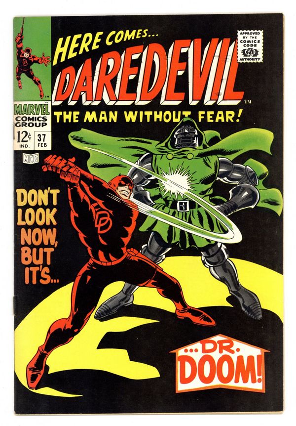 Tags: Marvel Legacy Numbering: Daredevil (part 37), Daredevil$90.00Cover pencils by Gene Colan, inks by Frank Giacoia. Don't Look Now, But It's Dr. Doom, script by Stan Lee, pencils by Gene Colan, inks by John Tartaglione; Doom captures Daredevil and switches bodies with our hero; cameo flashback featuring Mr. Fantastic, Invisible Girl, Human Torch, and Galactus. 36 pgs. Cover price $0.12. Cover price $0.12.