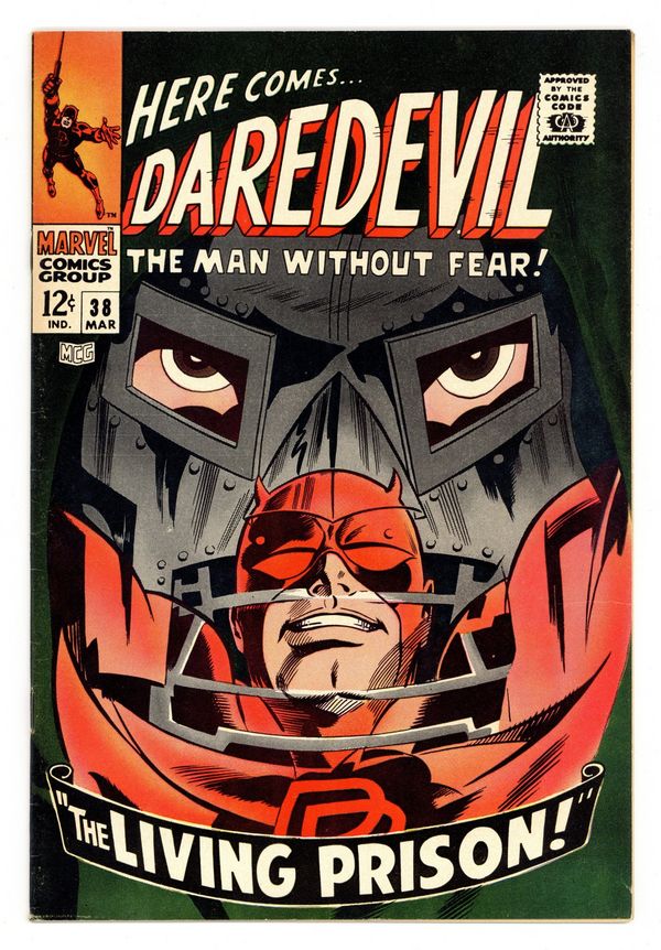 Tags: Marvel Legacy Numbering: Daredevil (part 38), Daredevil$45.00Cover pencils by Gene Colan, inks by Frank Giacoia. The Living Prison!, script by Stan Lee, pencils by Gene Colan, inks by Frank Giacoia; After a few battles and not a few episodes of identity confusion, Daredevil and Doctor Doom are reverted back to their original bodies, but the Fantastic Four doesn't know that; story continued in Fantastic Four #73. Letter to the editor from writer Peter Sanderson. 32 pgs. Cover price $0.12. Cover price $0.12.