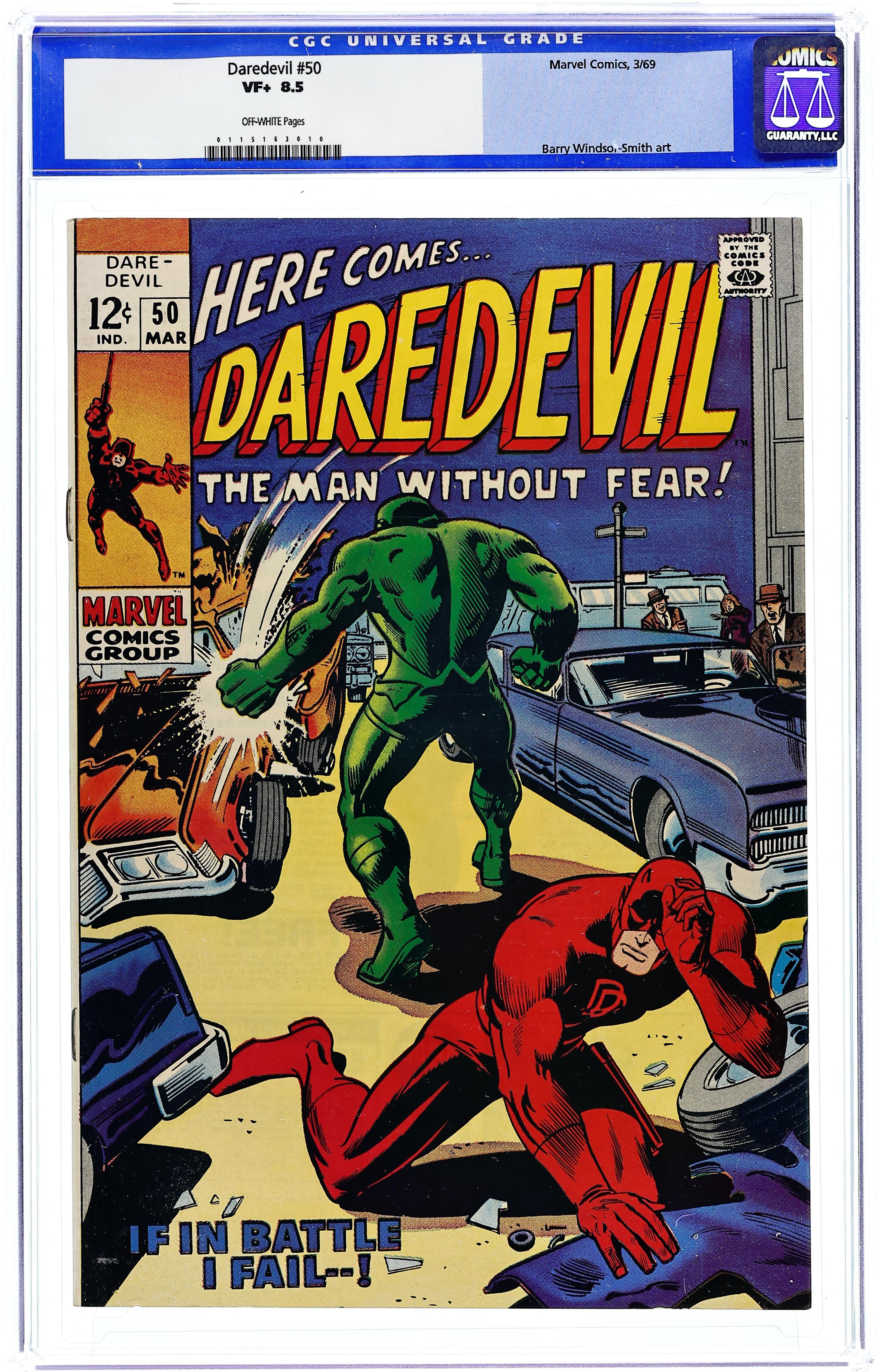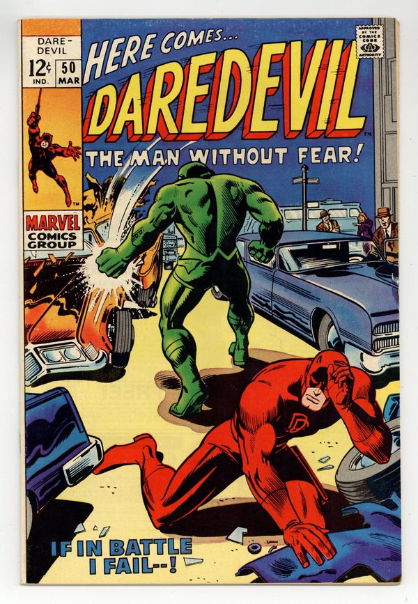 Cover pencils by Barry Windsor-Smith and Gene Colan (Daredevil figure), inks by Johnny Craig. If In Battle I Fall, script by Roy Thomas, pencils by Barry Windsor-Smith, inks by Johnny Craig; The Plastoid and DD duke it out until the giant robot is hurt and returns to his master; In the heat of battle with Hornhead, Starr accidentally sends the robot off to kill the man who hired him, Biggie Benson. Letter to the editor from Carl Gafford. Statement of ownership--average print run 435,200; average paid circulation 292,423. 32 pgs. Cover price $0.12. Cover price $0.12.