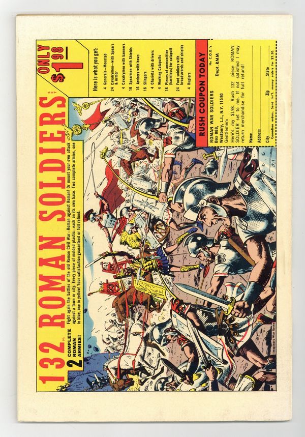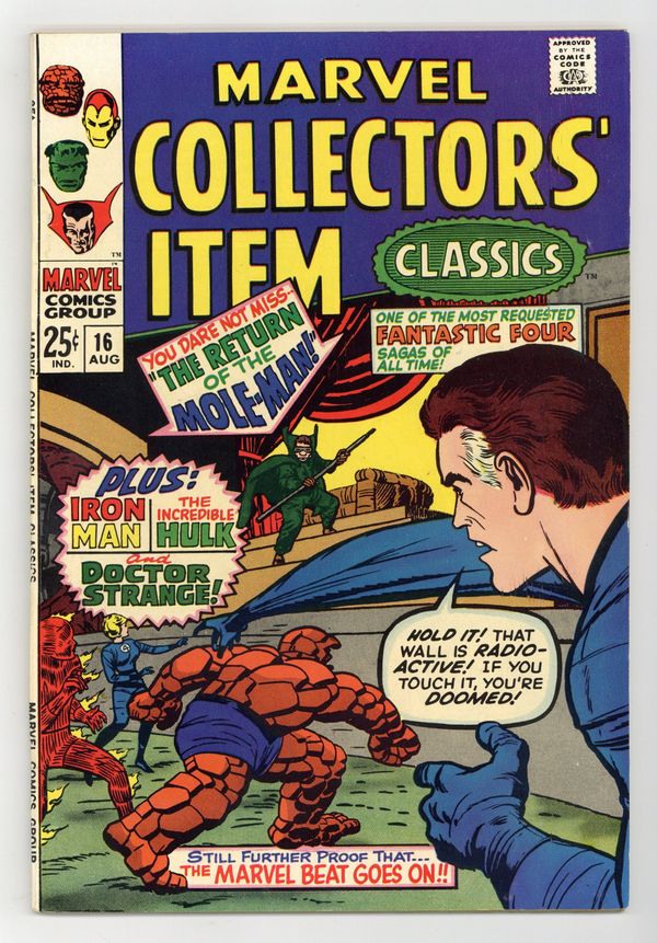 Reprints Fantastic Four 22, Iron Man from Tales of Suspense #59, The Incredible Hulk #1, and Doctor Strange from Strange Tales 125. Cover pencils by Jack Kirby, inks by Dick Ayers. "The Return of the Mole Man!", script by Stan Lee, pencils by Jack Kirby, inks by George Roussos (as G. Bell); The Mole Man arranges for the neighbors of the Fantastic Four to complain about their activities so they will be interested when they receive an ad for an island that is for sale; When they visit the island, the Mole Man is waiting for them. Not Brand Echh ad. Spider-Man ad. Silver Surfer ad. "The Black Knight!", script by Stan Lee, pencils by Don Heck, inks by Chic Stone; Iron Man versus the villainous Black Knight. "Mordo Must Not Catch Me!", script by Stan Lee, pencils by Steve Ditko, inks by George Roussos (as Geo. Bell): Three followers of Mordo attack Strange in his sanctum; After dispatching them, he uses the Eye of Agamotto and his amulet to contact his mentor, but to no avail!; Mordo appears saying he's captured the Ancient One. "The Coming of the Hulk Part 5: The Hulk Triumphant!" featuring Hulk, Rick Jones, Betty Ross, Thunderbolt Ross, Igor, and Gargoyle (Yuri Topolov), script by Stan Lee, pencils by Jack Kirby, inks by Paul Reinman. Medusa ad. 68 pgs., full color. Cover price $0.25.
