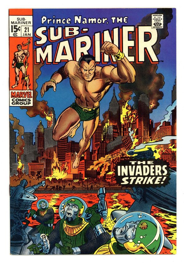 "Invasion from the Ocean Floor!" Script by Roy Thomas. Pencils by Marie Severin. Inks by Johnny Craig. Cover by Marie Severin and Johnny Craig. With Prince Namor trapped in Manhattan, Lady Dorma and Warlord Seth send the Atlantis attack fleet to rescue him! But the Sub-Mariner knows that the imperial fleet's arrival in New York Harbor will start a massive war with the surface people! And to make matters worse Seth blows the Horn of Proteus to summon giant sea creatures to join the attack! Oh my, does the Avenging Son have any hope of stopping all-out war? Cameo appearance by the Thing. 32 pages. Cover price $0.15.