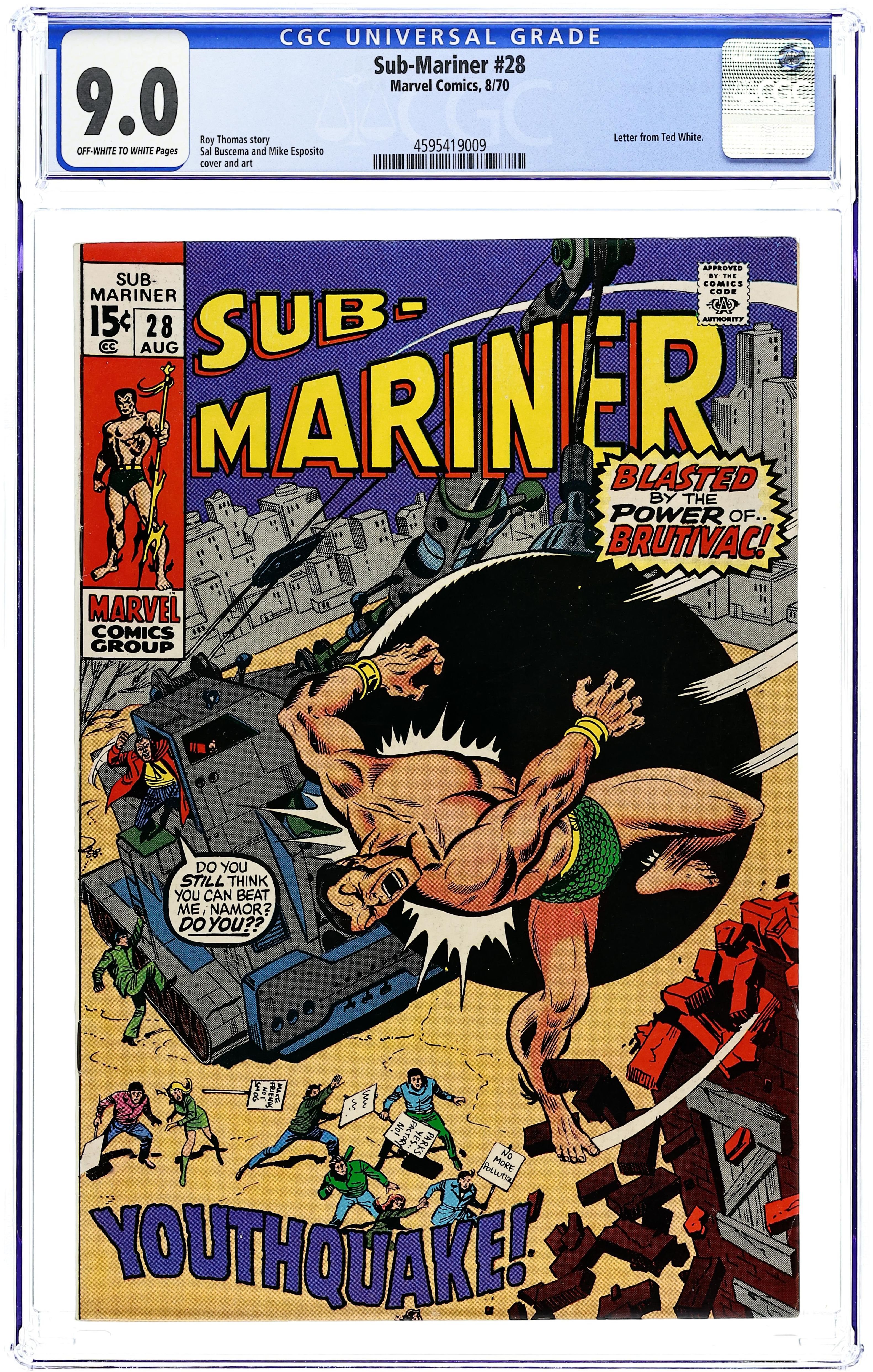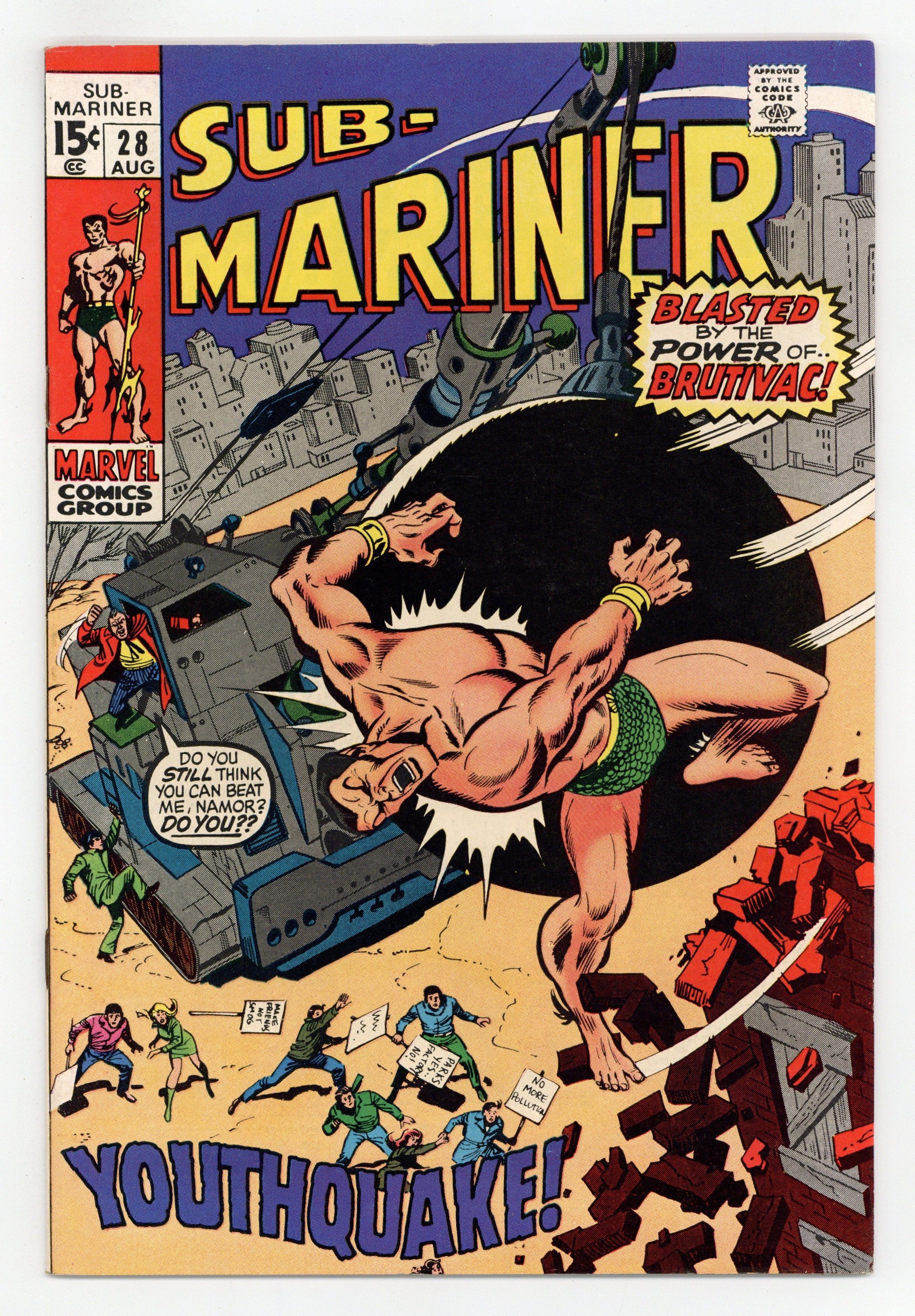 Cover pencils by Sal Buscema, inks by Mike Esposito. "Youthquake!", script by Roy Thomas, pencils by Sal Buscema, inks by Mike Esposito (as Joe Gaudioso); Namor spends some time in New York City with Diane Arliss; Namor gets involved with a youth group protesting against the destruction of a park for more development; Defying the protesters, the head developer, Sam Westman, sets Brutivac, a monstrous mechanical machine, against them; Namor faces off against the Brutivac until Westman realizes that he has endangered his son and is forced to look at this situation from another perspective. Astonishing Tales ad featuring Ka-Zar and Dr. Doom! Amazing Adventures ad featuring The Inhumans. 36 pgs., full color. $0.15. Cover price $0.15.