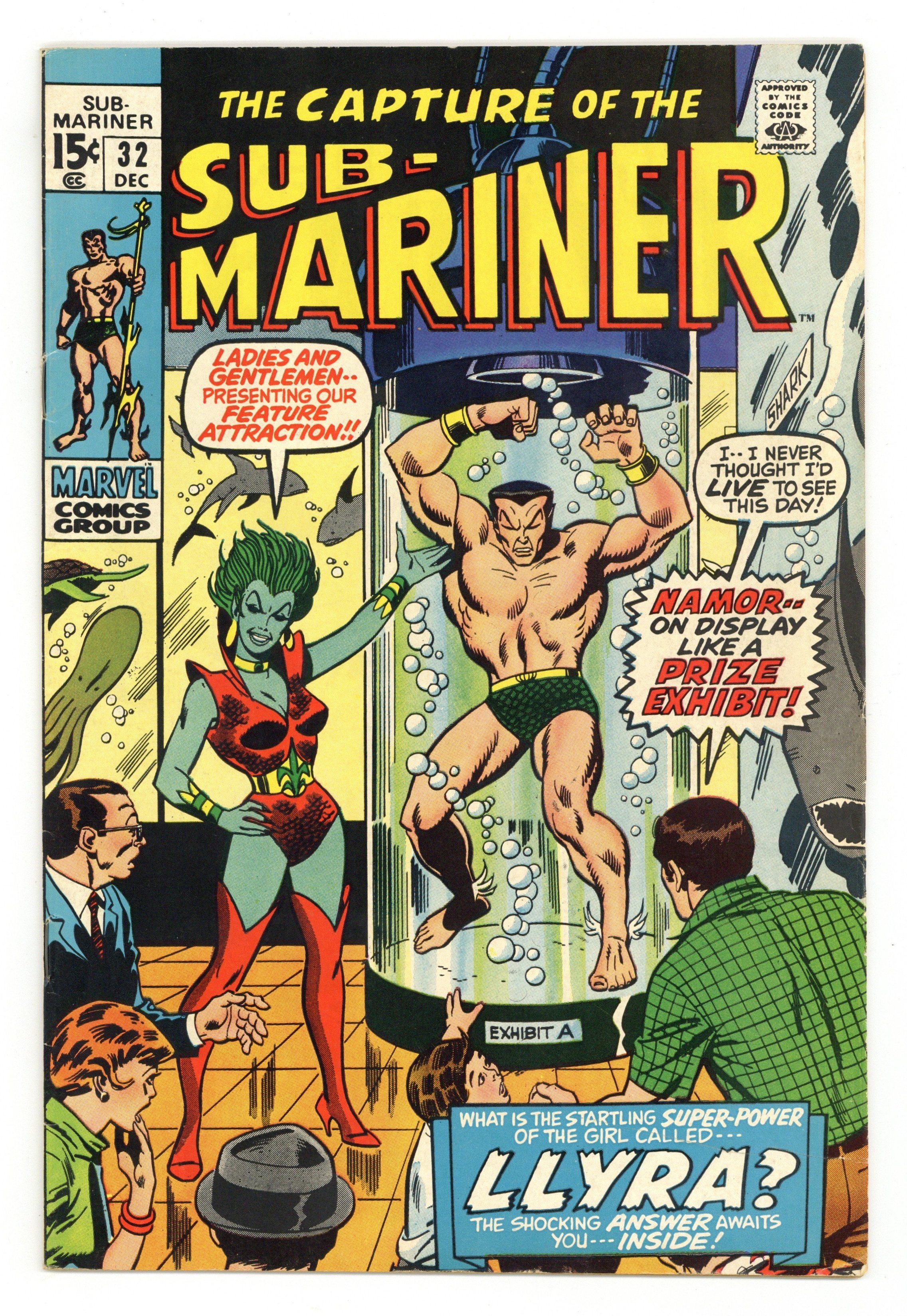 Cover art by Sal Buscema. "Call Her Llyra, Call Her Legend," script by Roy Thomas, pencils by Sal Buscema, inks by Jim Mooney; Seeking an undersea ally, Namor makes his way to the undersea realm of Lemuria; Namor meets Llyra, the empress of Lemuria, who has overthrown Karthon; She tells him of her origin in hopes of persuading him to join her conquest of the sea; Namor wants nothing to do with it and is caught off guard and captured; Namor meets Llyra's sister, Laurie, who frees him; Namor battles with the sea creatures Llyra can control and their battle ends in her death; However, Llyra changes back to Laurie and he realized that they both shared one body; Namor meets her mother and learns that it was her that had actually freed him. 36 pgs., full color. $0.15. Cover price $0.15.