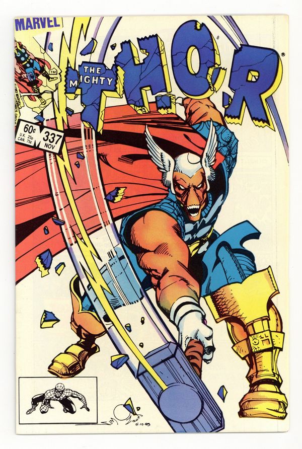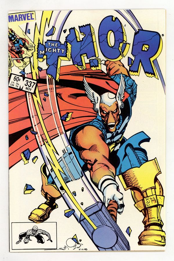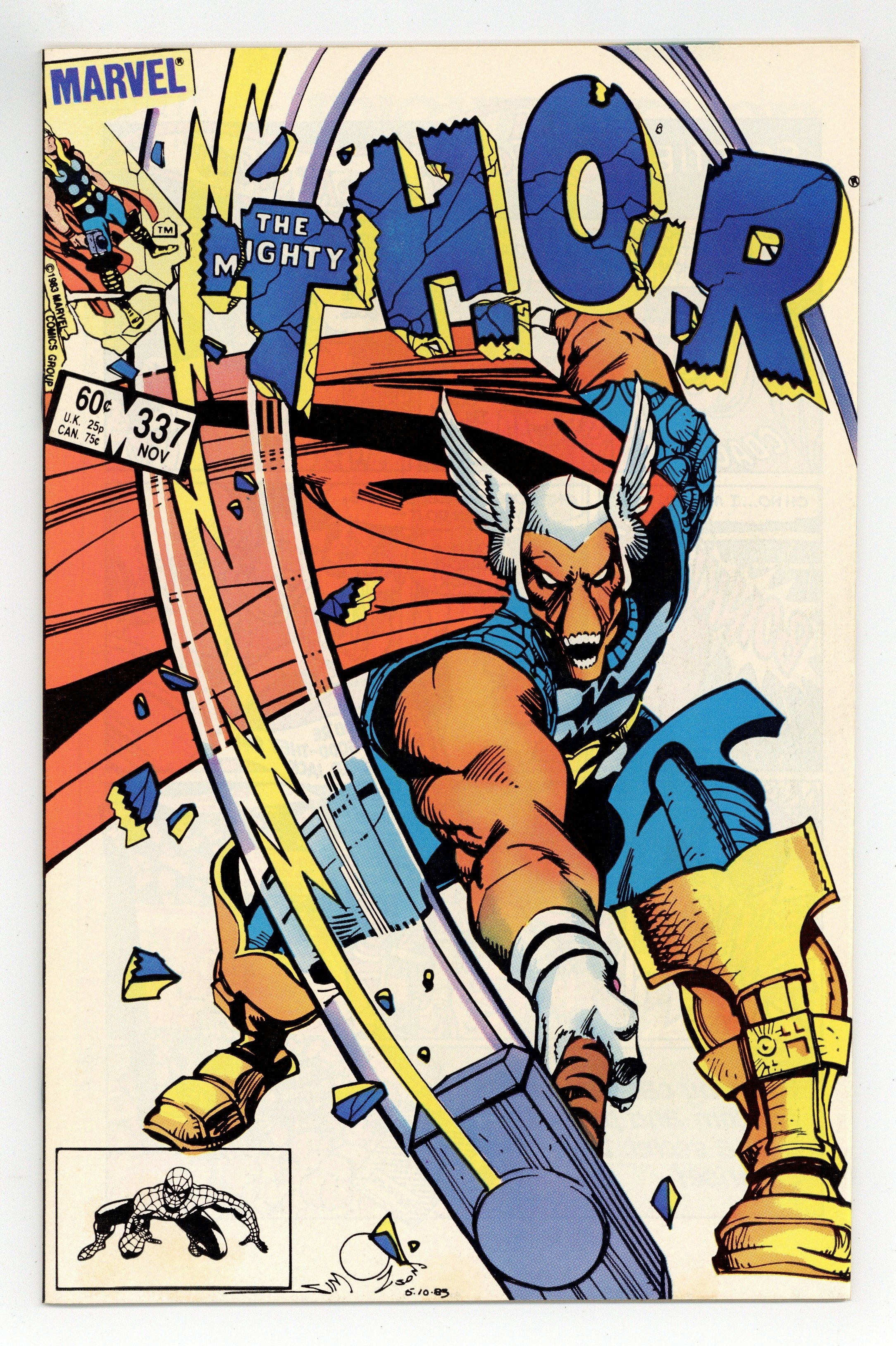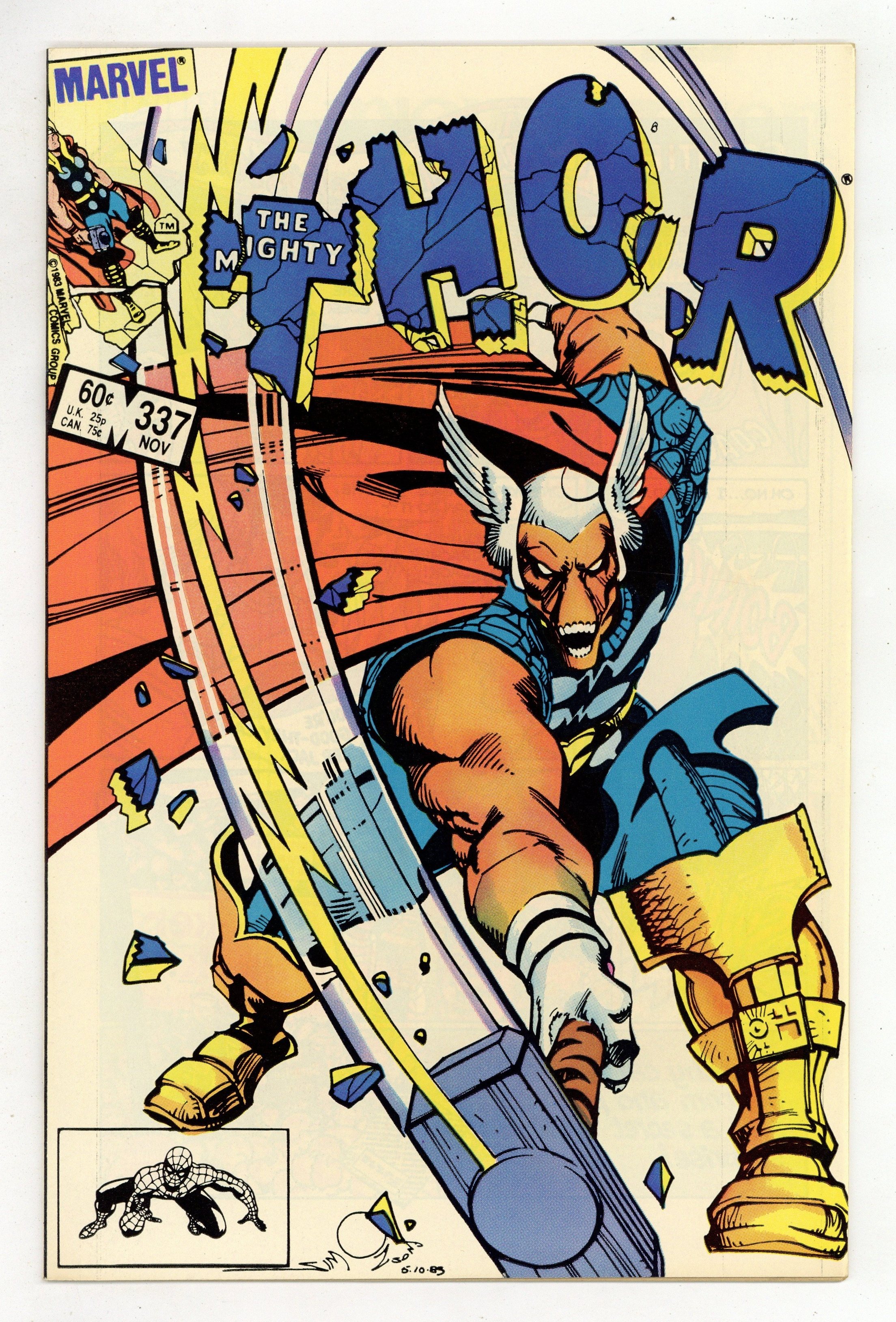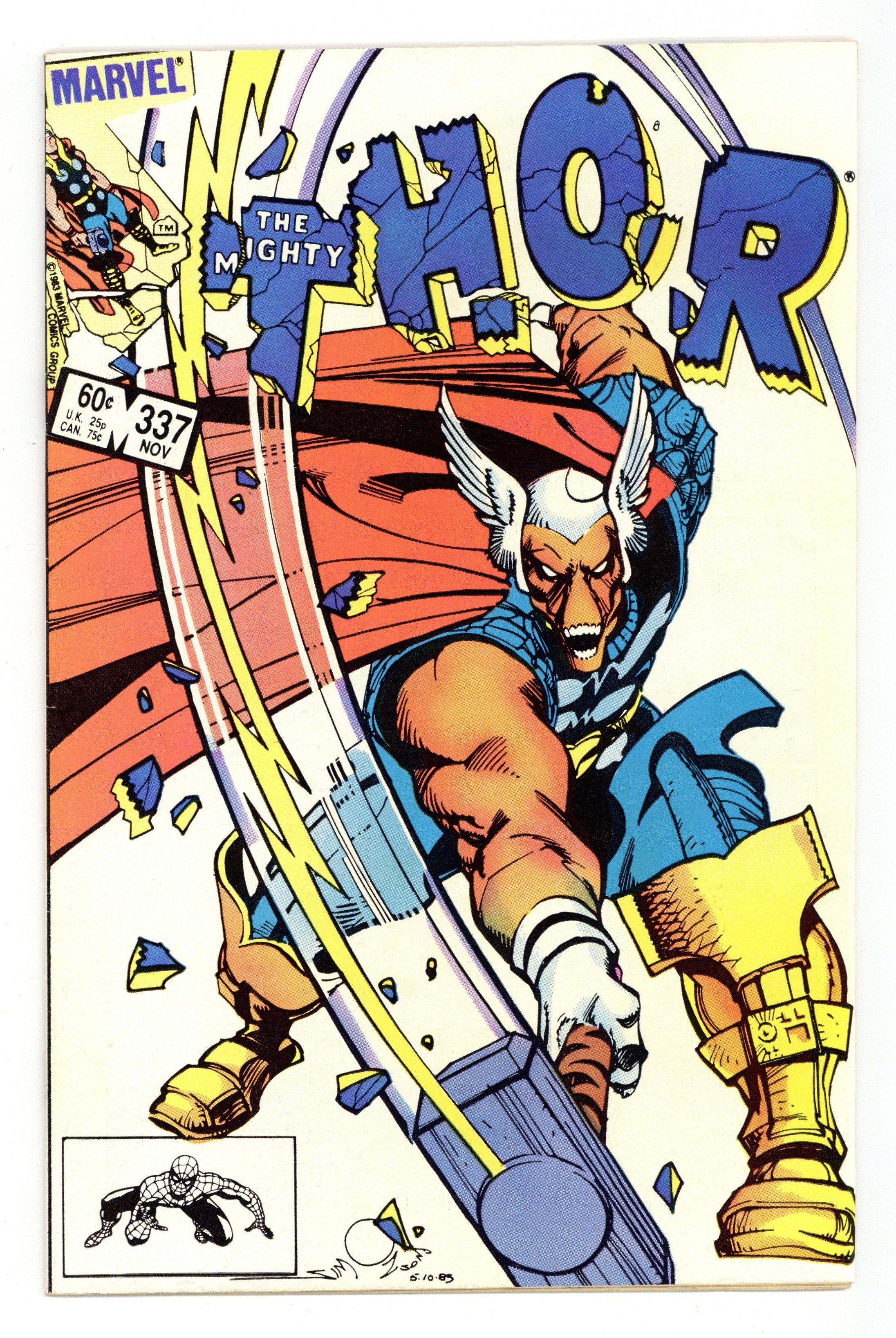Tags: Marvel Legacy Numbering: Thor (part 337), Thor$74.00Direct Edition. Cover by Walt Simonson. Beta Ray Bill (first appearance) becomes Thor in "Doom!", script and art by Walt Simonson; Nick Fury asks Thor's aid in investigating an alien ship heading for earth; Thor arrives and triggers the awakening of an alien protector, Beta Ray Bill; Bill bests Thor and takes up his hammer only to be accidentally summoned to Asgard by Odin who thinks he is summoning Thor. Brief appearances by Nick Fury, Loki, Sif, Balder, Heimdall, Volstagg, and Odin. First appearance of Lorelei (sister of the Enchantress). Begins Walt Simonson's run on Thor (through #382). Bullpen Bulletins. Star Frontiers TSR ad. 36 pgs., full color. $0.60. Cover price $0.60.