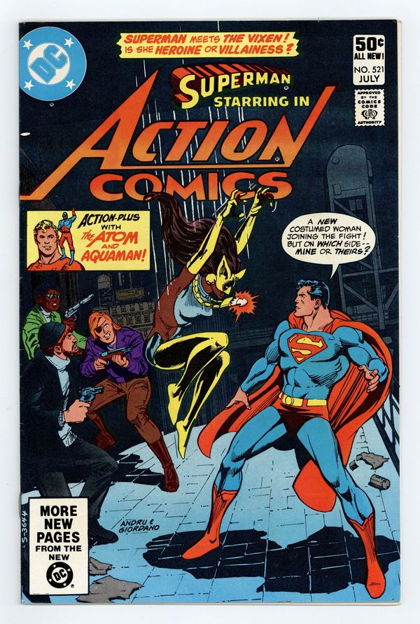 Tags: Superman$35.00Direct Edition. Cover pencils by Ross Andru, inks by Dick Giordano. "The Deadly Rampage of the Lady Fox," script by Gerry Conway, pencils by Curt Swan, inks by Frank Chiaramonte; In New York City, the Vixen steals a van full of furs that belong to entrepreneur Mordecai Mule; Superman, attending a function at Madison Square Garden, learns of the robbery and gives chase; Superman and Vixen team up to stop a horde of elephants. "Grow, Little Growfish!", script by Bob Rozakis, pencils by Alex Saviuk, inks by Vince Colletta; Off the coast of Virginia, Aquaman experiments with his telepathic powers by sending out a routine mental scanning wave; He discovers a large, gelatinous organism that shrinks in size; Aquaman contacts the Atom, who teleports over to investigate. 36 Pages, Full Color, $0.50. Cover price $0.50.
