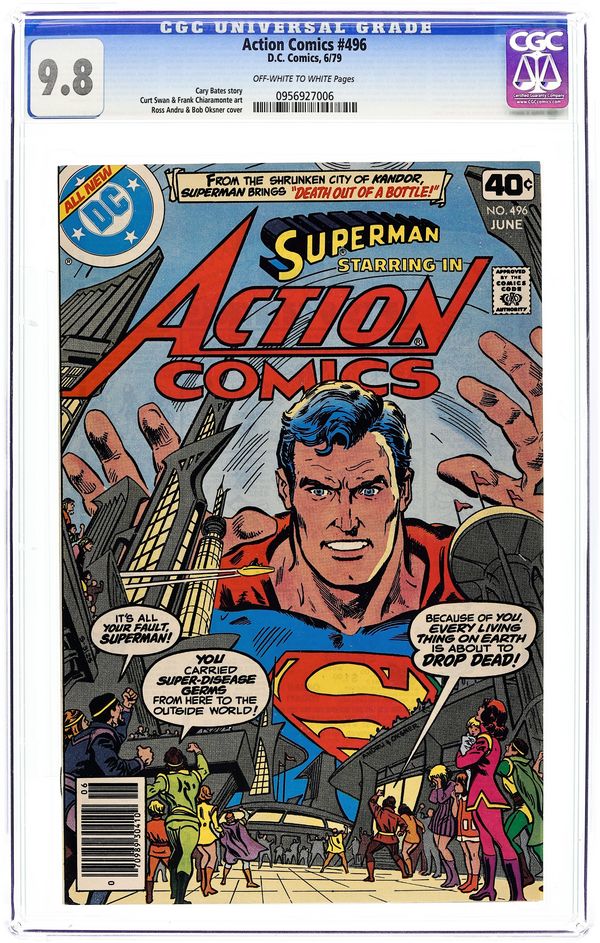 Superman in "Death Out of a Bottle!" with story by Cary Bates with art by Curt Swan and inks by Frank Chiaramonte. An alien plague threatens death and destruction but Superman finds himself helpless to stop it. 36 Pages, Full Color. Cover price $0.40.