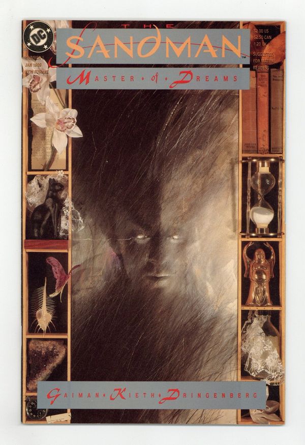 Starts Jan 26 52-page giant. 1st app of Morpheus, the Modern Age Sandman. Sleep of the Just [Master of Dreams Part 1], script by Neil Gaiman, art by Sam Kieth and Mike Dringenberg; Roderick Burgess, seeking to trap Death, snares her brother Dream instead; After many years of captivity, Morpheus is released and takes his revenge. Wesley Dodds (Golden Age Sandman) cameo appearance. (See also Books of Magic, Vertigo Jam, and Vertigo Preview)Catwoman ad, art by Michael Bair. 52 pgs., full color. $2.00. Cover price $2.00.