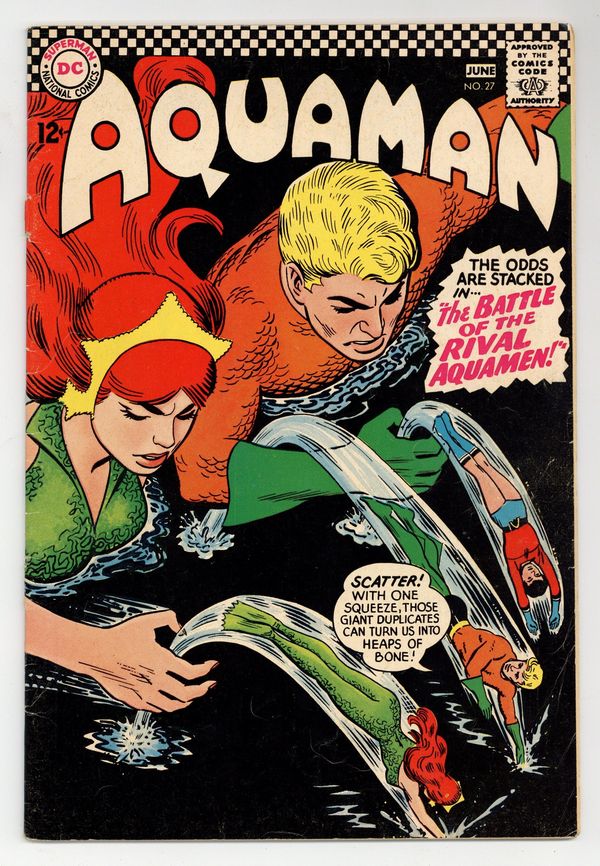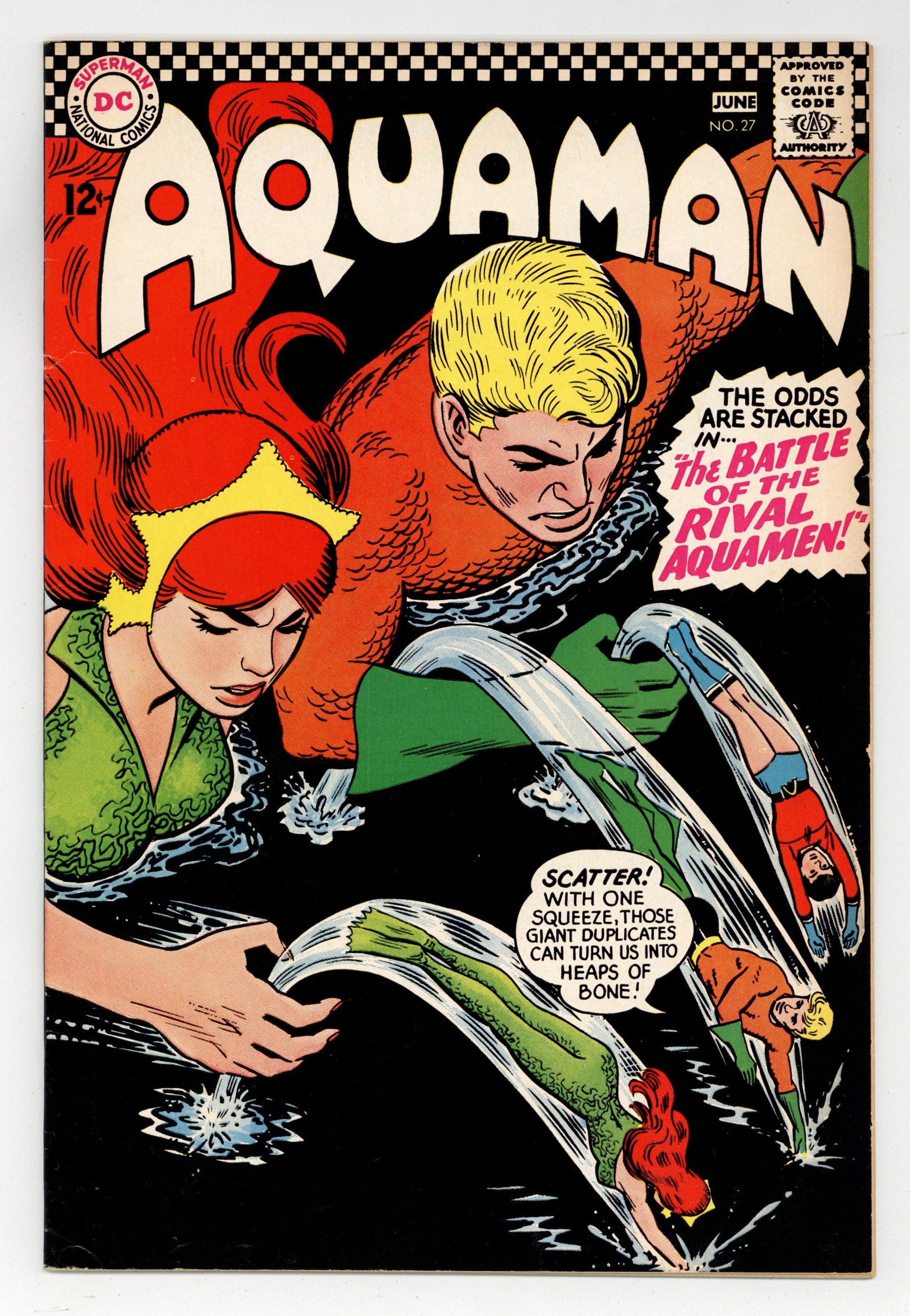 $30.00Cover art by Nick Cardy. The Battle of the Rival Aquamen starring Aquaman, Aqualad, Mera, and Xen, script by Bob Haney, art by Nick Cardy; Aquaman and Mera imposters attack Aqualad. Cap's Hobby Center activity half-page by Henry Boltinoff. 36 pgs. $0.12. Cover price $0.12.