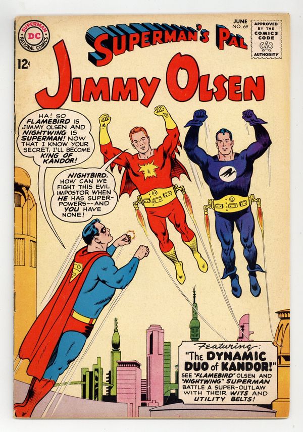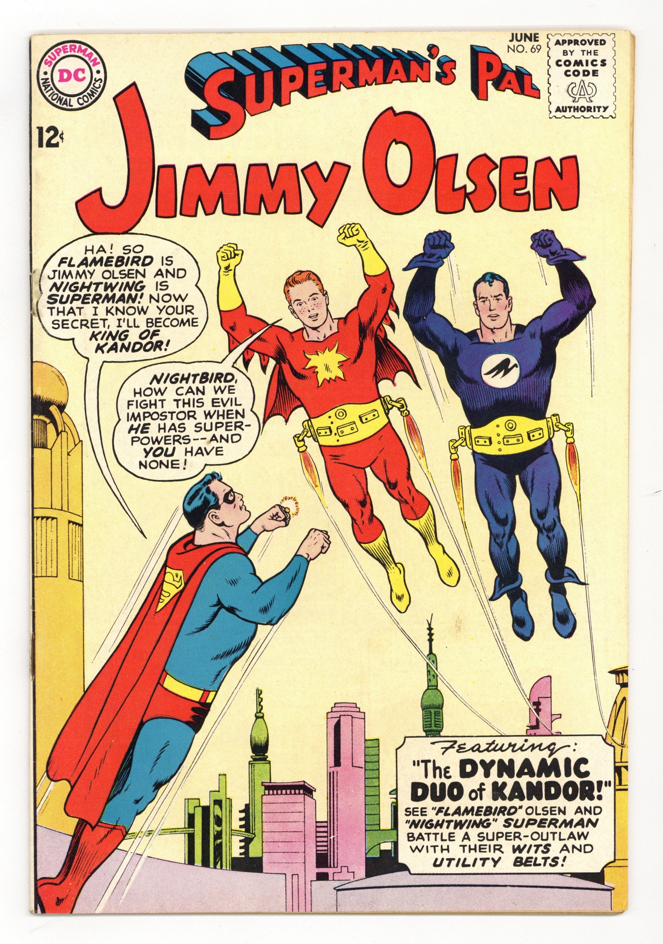 Cover pencils by Curt Swan, inks by George Klein. Not Wanted: High School Dropouts! public service announcement, script by Jack Schiff, art by Sheldon Moldoff. The Caped Crimefighers of Kandor!, script by Edmond Hamilton, pencils by Curt Swan, inks by George Klein; Superman and Jimmy Olsen travel to the Bottle City of Kandor to become Nightwing and Flamebird and stop an outlaw with super-powers who is stealing artifacts. The Super-Showdown in Kandor!, script by Edmond Hamilton, pencils by Curt Swan, inks by George Klein; Nightwing and Flamebird discover the identity of Super-Outlaw, and also find out who is behind his crime spree. Jimmy Olsen's Viking Sweetheart!, script by Leo Dorfman, art by John Forte. Little Pete humor page by Henry Boltinoff. 36 Pages, Full Color. Cover price $0.12.
