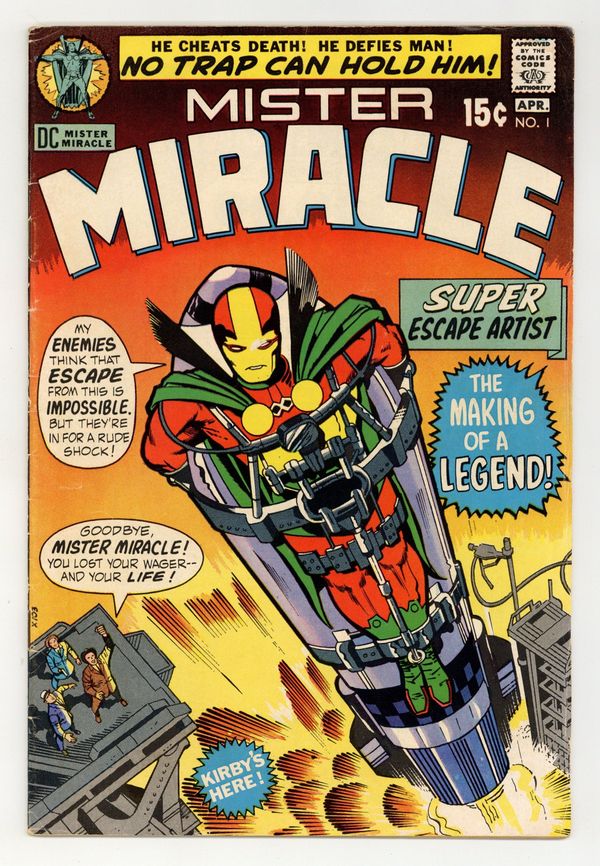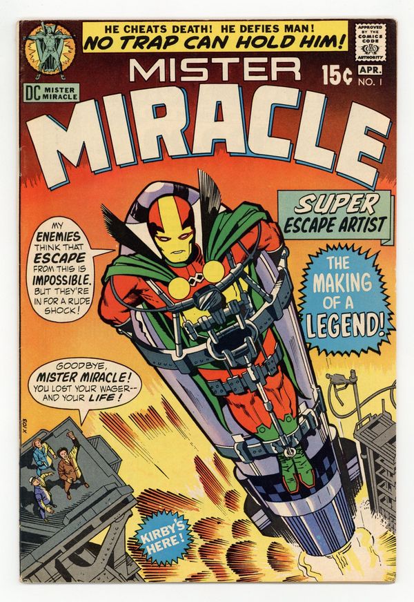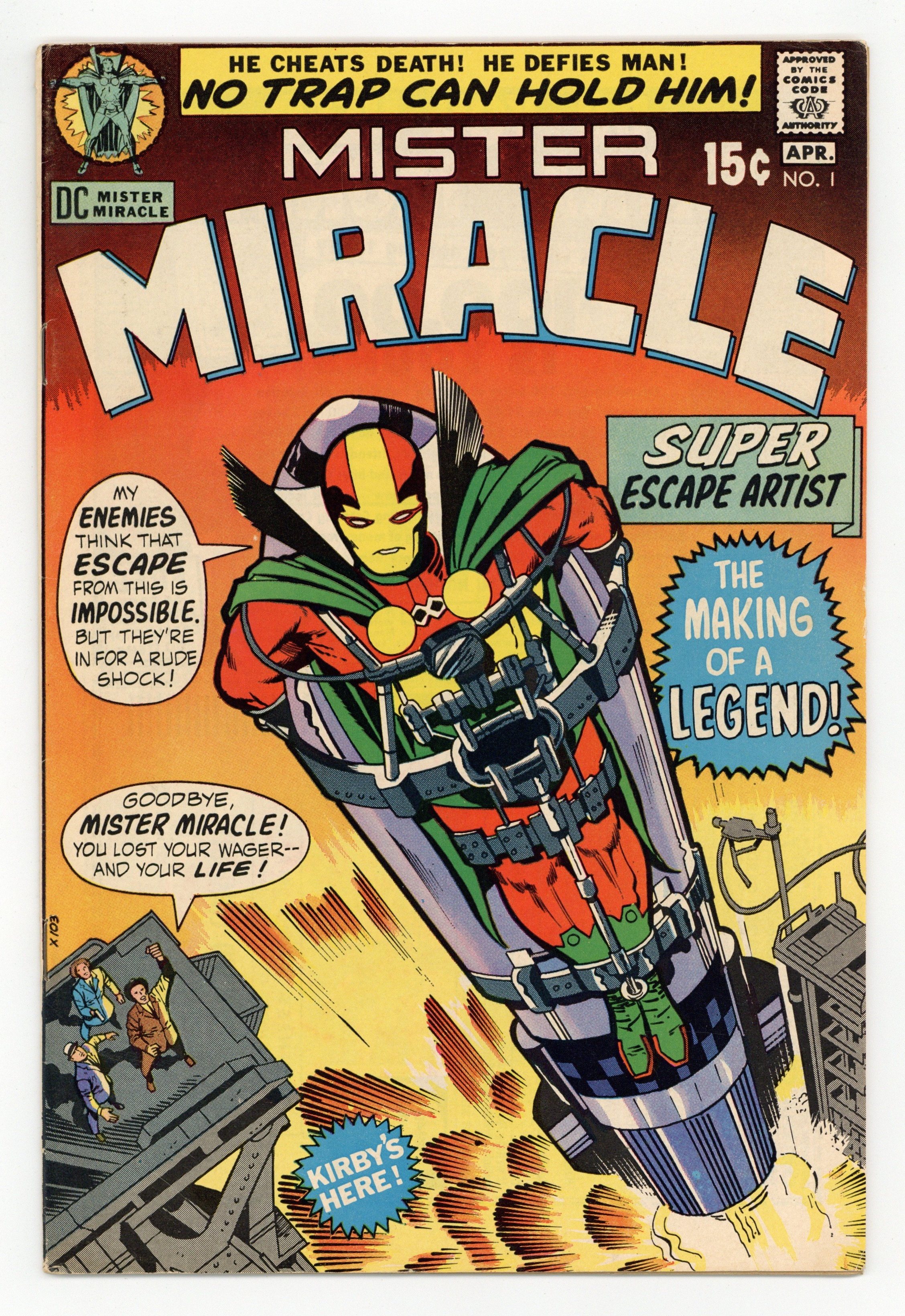 "Murder Missile Trap." Elite soldier Scott Free escapes Apokolips and comes to Earth, where he assumes the role of Mister Miracle. Inspired by the real world exploits of Jim Steranko, who was a magician and escape artist prior to his career in comics, Mister Miracle was created by the great Jack Kirby for his epic Fourth World saga. Script, pencils, and cover by Jack Kirby. Inks by Vince Colletta. Cover price $0.15.