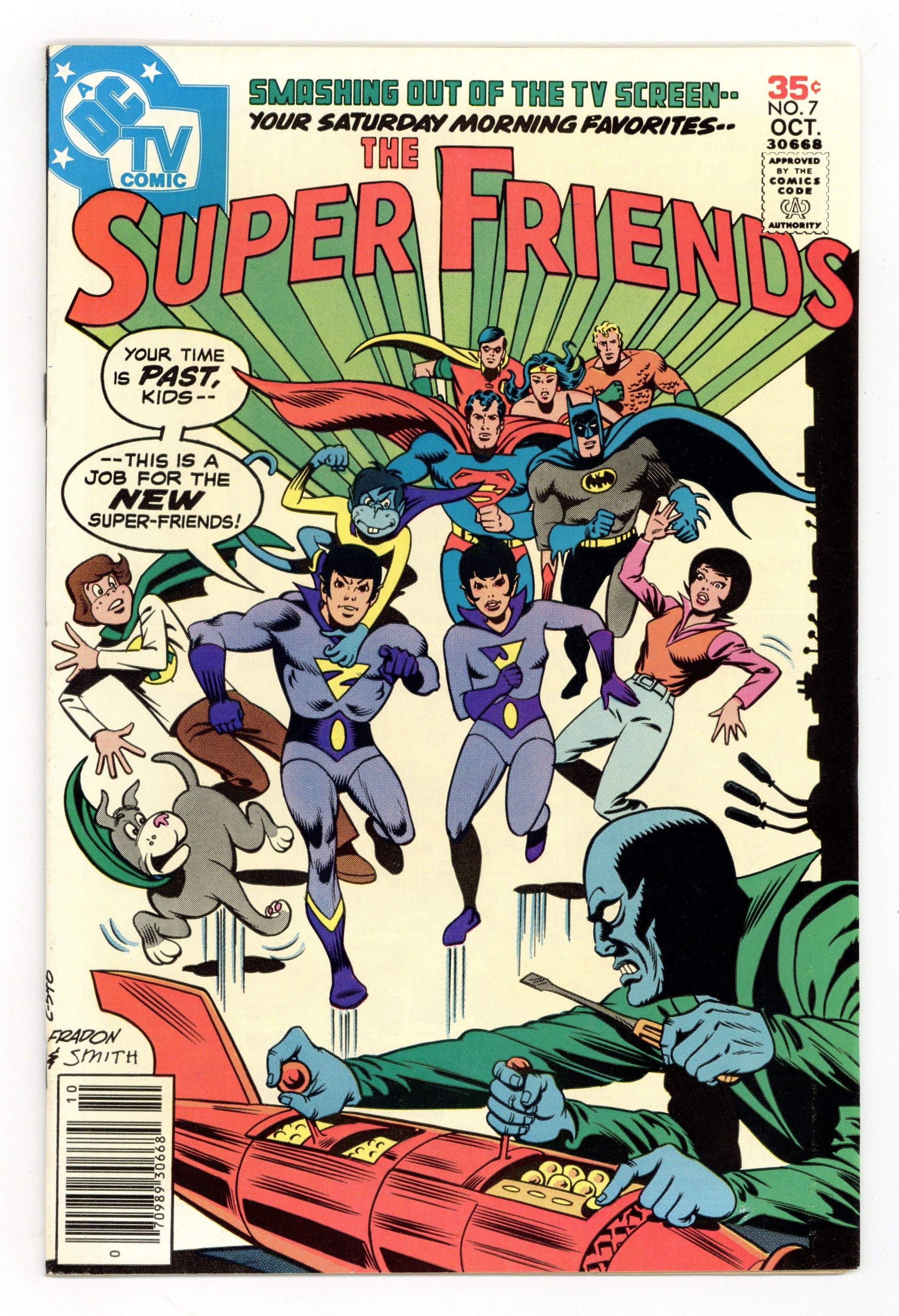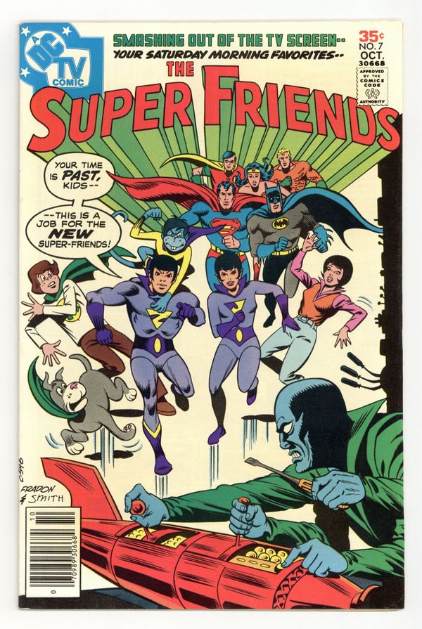 "The Warning of the Wonder Twins." Superman's old enemy Grax plants 12 bombs on Earth. Starring Aquaman, Batman, Robin, Superman, Wonder Woman, Wendy, Marvin, Wonderdog, the Wonder Twins and Gleek (making their first comic book appearance), Hawkman, Flash, and Green Arrow. Script by E. Nelson Bridwell, pencils by Ramona Fradon, inks by Bob Smith. Cover by Fradon and Smith. Cover price $0.35.