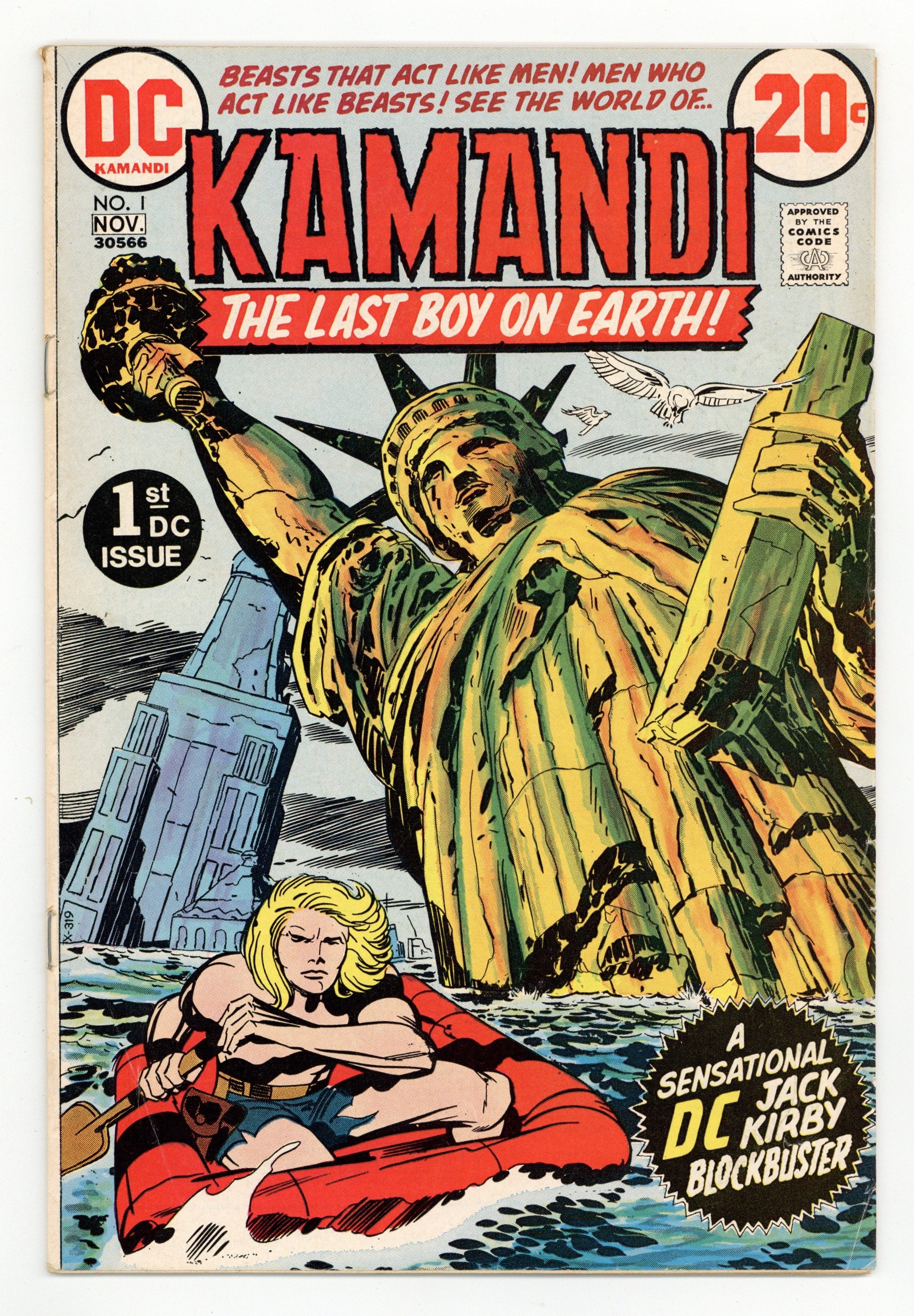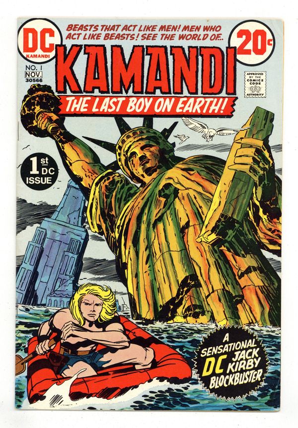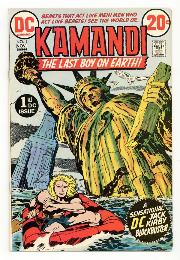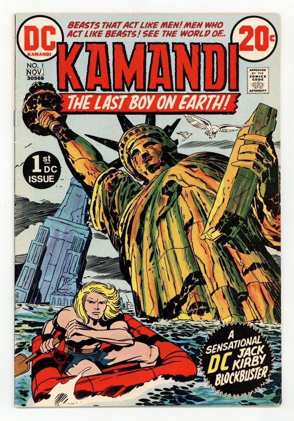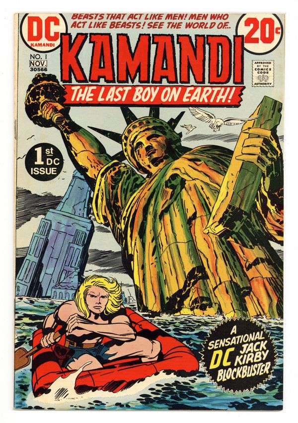 $9.601st appearance and origin of Kamandi. "The Last Boy on Earth." Script and pencils by Jack Kirby, inks by Mike Royer. Cover by Kirby and Royer. A series that borrows many concepts from Planet of the Apes, Kamandi takes place in an alternate future where animals have mutated into bipedal beings of intelligence and where humans are treated like savage beasts. Kamandi avenges the death of his grandfather, who was killed by wolves, but is then captured by a tiger named Caesar, who turns him over to dog-scientist Dr. Canus. Canus proceeds to help Kamandi, and this is where the so-called last boy on earth hooks up with Ben Boxer, a mutated human who can turn to living metal. Cover price $0.20.