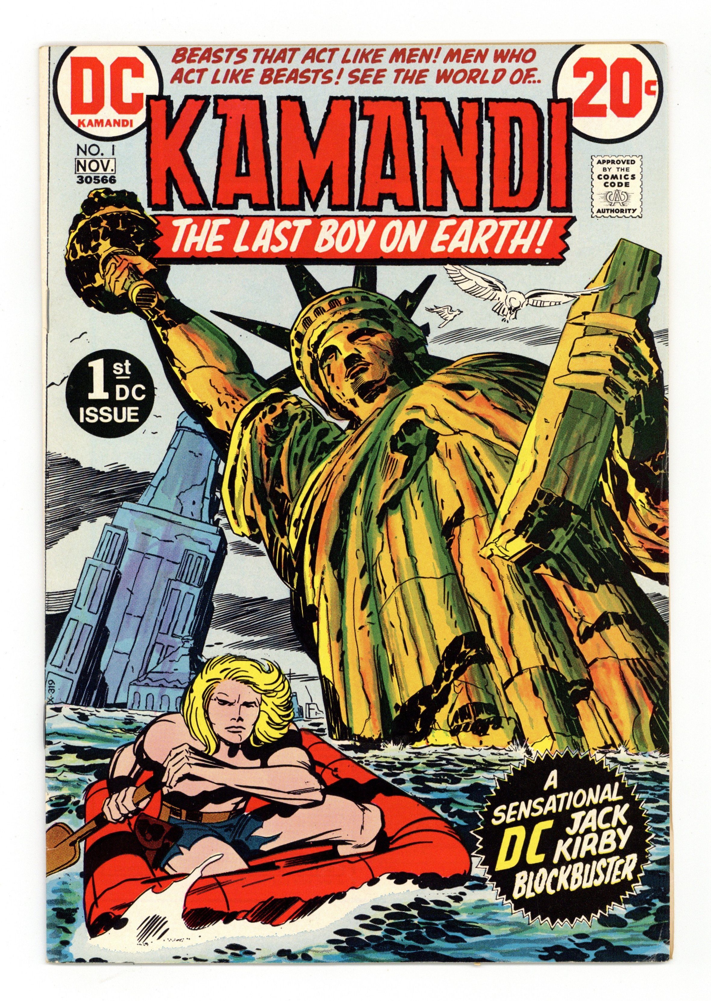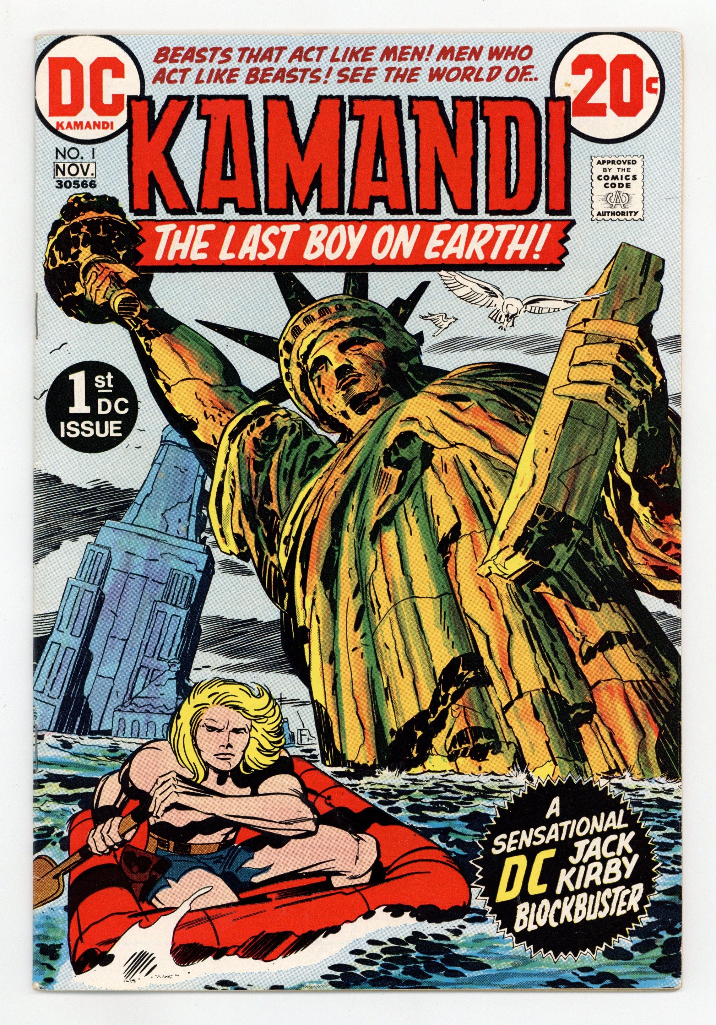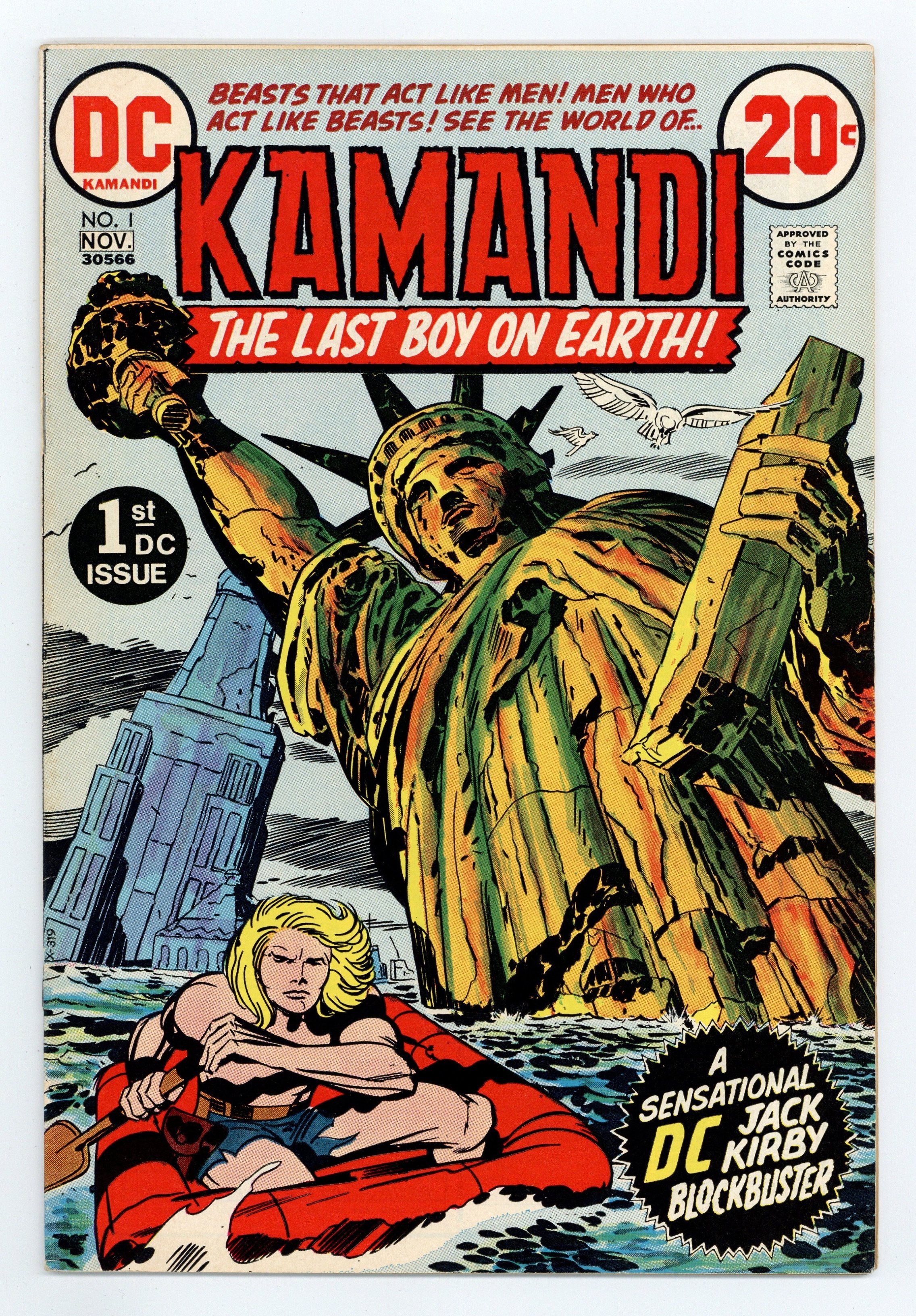 $9.601st appearance and origin of Kamandi. "The Last Boy on Earth." Script and pencils by Jack Kirby, inks by Mike Royer. Cover by Kirby and Royer. A series that borrows many concepts from Planet of the Apes, Kamandi takes place in an alternate future where animals have mutated into bipedal beings of intelligence and where humans are treated like savage beasts. Kamandi avenges the death of his grandfather, who was killed by wolves, but is then captured by a tiger named Caesar, who turns him over to dog-scientist Dr. Canus. Canus proceeds to help Kamandi, and this is where the so-called last boy on earth hooks up with Ben Boxer, a mutated human who can turn to living metal. Cover price $0.20.