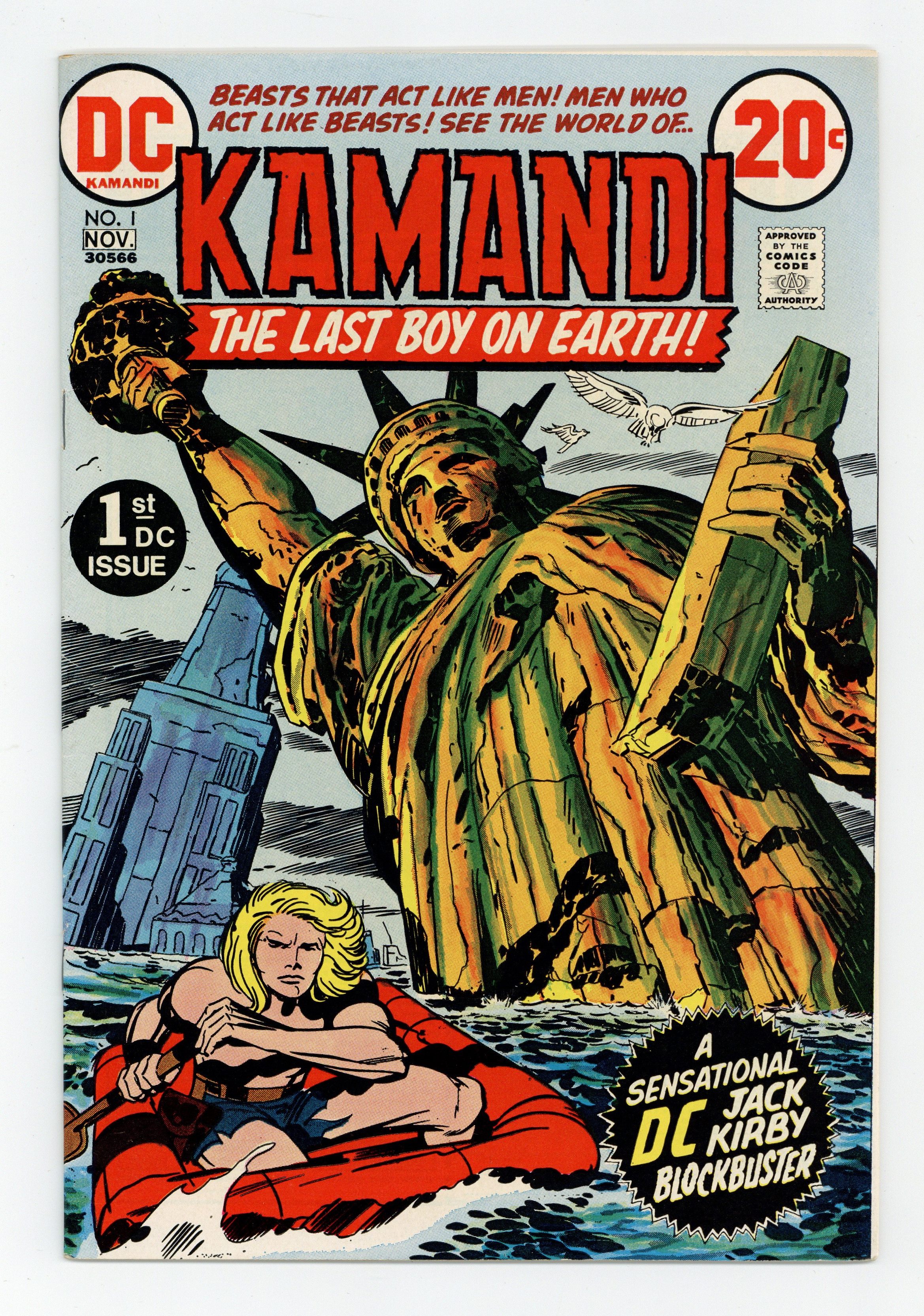 $16.001st appearance and origin of Kamandi. "The Last Boy on Earth." Script and pencils by Jack Kirby, inks by Mike Royer. Cover by Kirby and Royer. A series that borrows many concepts from Planet of the Apes, Kamandi takes place in an alternate future where animals have mutated into bipedal beings of intelligence and where humans are treated like savage beasts. Kamandi avenges the death of his grandfather, who was killed by wolves, but is then captured by a tiger named Caesar, who turns him over to dog-scientist Dr. Canus. Canus proceeds to help Kamandi, and this is where the so-called last boy on earth hooks up with Ben Boxer, a mutated human who can turn to living metal. Cover price $0.20.