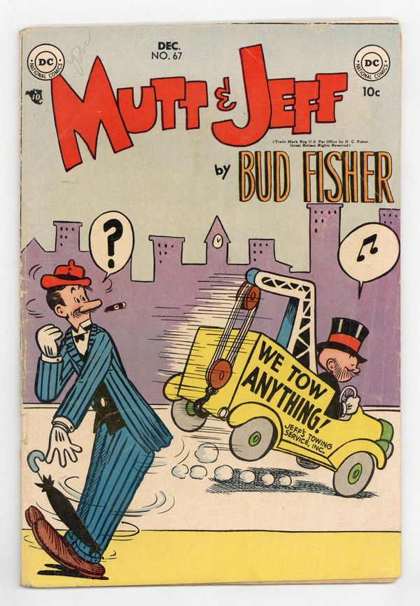 Cover by Sheldon Mayer (credited as Bud Fisher). Stories and art by Al Smith (credited as Bud Fisher), Jack Schiff, and Win Mortimer. DC reprints the comic strip that defined the comic strip, featuring the original tall-and-short comedy duo. Also featuring the "topper" strip Cicero's Cat. Mutt wants to enlist Jeff's pet duck Jack as a decoy for duck hunting. Jeff takes an inordinate interest when Mutt writes a will. Jeff's bed gets repossessed. Plus a PSA about urban renewal. Mutt & Jeff; Cicero's Cat; Binky Says: Know Your Community!; To the Rescue. 32 pages, Full Color. Cover price $0.10.