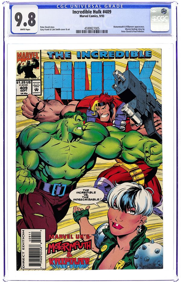 When the Hulk battles Madman high atop London's Big Ben, Marvel UK's Motormouth and Killpower lend a little muscle in "Royal Pain." Written by Peter David, with art by Gary Frank and Cam Smith. Plus: the Pantheon back-up tale "First Blood" by Peter David, Paul Pelletier and Cam Smith. 36 pgs. Cover price $1.25.