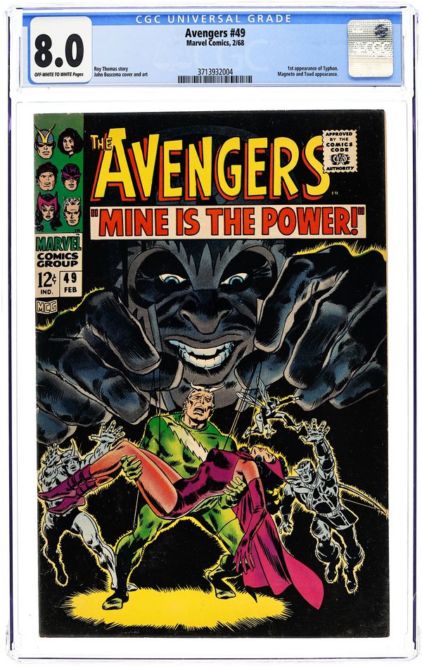 Tags: Marvel Legacy Numbering: Avengers (part 49), Avengers$23.50"Mine is the Power!" Script by Roy Thomas. Art by John Buscema. Cover by John Buscema. The Scarlet Witch and Quicksilver escort Magneto to the United Nations Building in New York! The Master of Magnetism wants to tell the world that he seeks peace with mankind. It sounds like such a noble endeavor! But as illustrated on the classic cover, Magneto is secretly pulling all the strings! When a mêlée breaks out inside the General Assembly Hall, Magneto directs a bullet to graze Wanda's head. And that causes Pietro to lash out at everyone...including Earth's Mightiest Heroes! This day has gone from bad to worse in a hurry! In the meantime, on Mount Olympus, Hercules comes face-to-face with the powerful titan that wrecked his homeland and dispatched the gods! First appearance of Typhon. Cameo appearance by the Toad. Flashback cameo by Zeus. Avengers Lineup: Hawkeye, Goliath (aka Hank Pym), Hercules, Quicksilver, Scarlet Witch, and the Wasp. (Notes: Wanda and Pietro's ordeal continues in Uncanny X-Men (1st series) #43. This story was reprinted in Marvel Triple Action #41.) 36 pages. Cover price $0.12.
