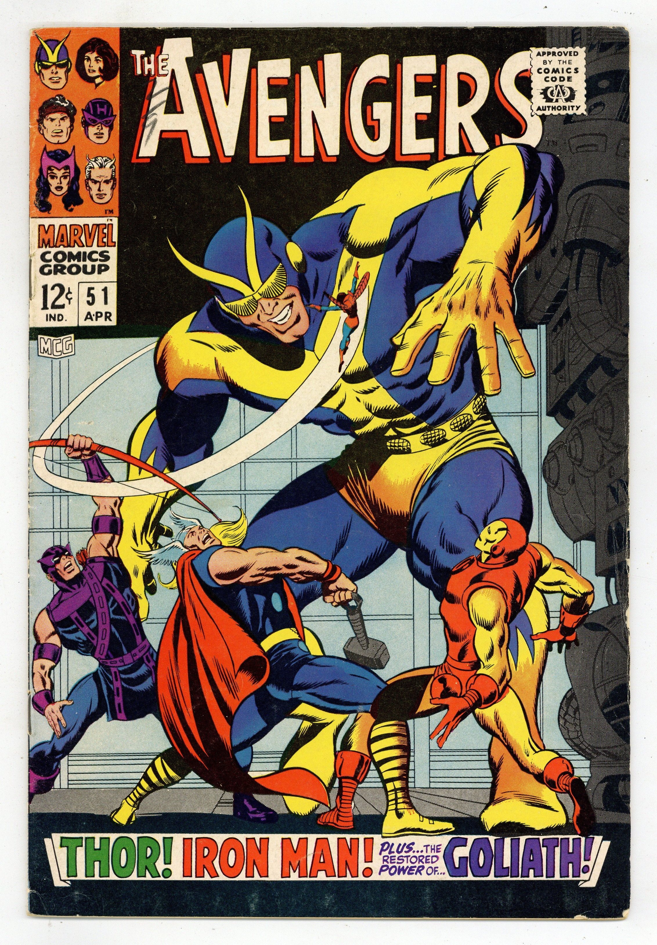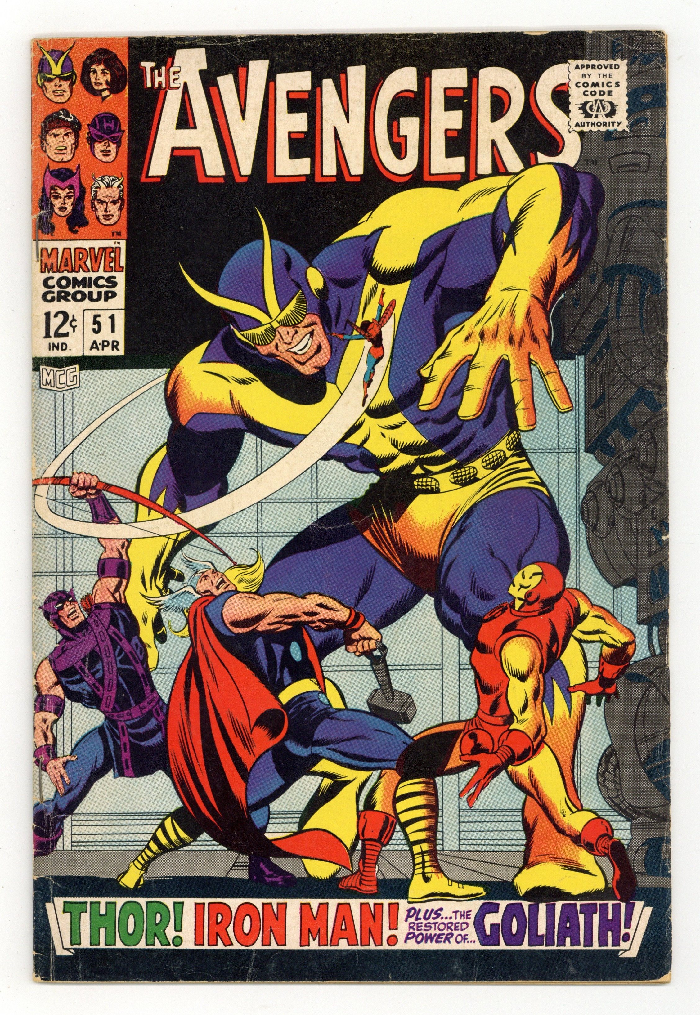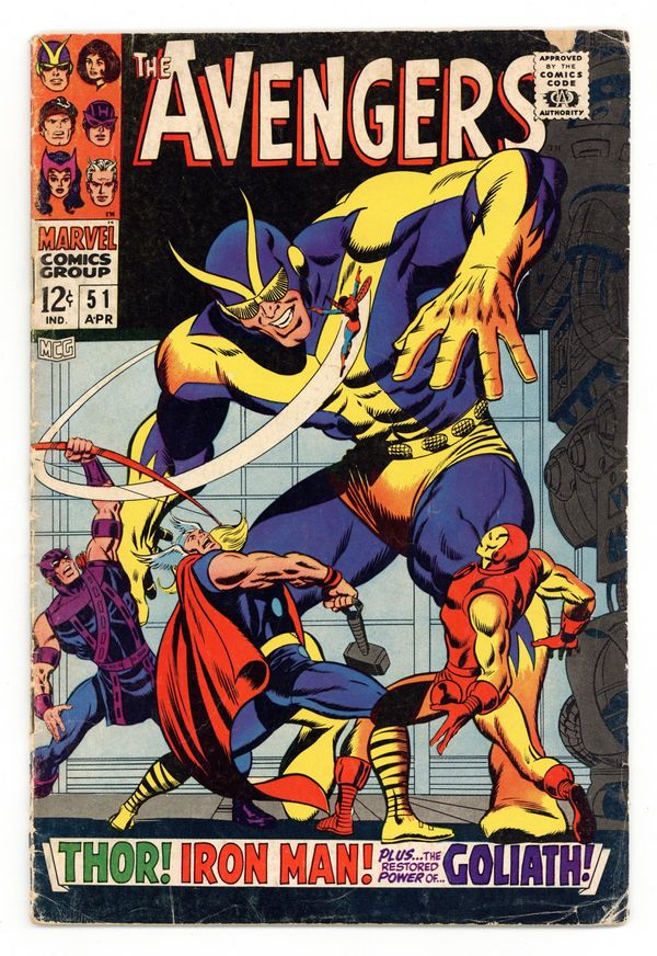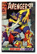Tags: Marvel Legacy Numbering: Avengers (part 51), Avengers$17.75"In the Clutches of the Collector!" Script by Roy Thomas. Pencils by John Buscema. Inks by George Tuska. Cover by John Buscema and Joe Sinnott.With the Avengers' roster down to three, Hank Pym tries desperately to restore his size-changing powers! But his first attempt fails! And before he can try again; the Collector abducts Hank and his two remaining teammates! The trio of avengers is shocked to be onboard the Collector's ship! And further shocked that the thunder god is working with the ancient elder of the universe! With four avengers (including Thor) already in his collection, the Collector sends the Prince of Asgard to add a fifth: the Invincible Iron Man! A weakened Shell-Head valiantly battles Thor, but tono avail! How can the Avengers turn the tables on the Collector? Maybe the Wasp has an idea! Cameo appearances by the Hulk, Captain America, and the Black Panther. Avengers Lineup: Goliath, Hawkeye, Iron Man, Thor, and the Wasp. (Notes: The Collector appears next in Iron Man #26 and will attempt to collect Earth's Mightiest Heroes again in Avengers 119. The letters page includes letters from comics writers Doug Moench and Tony Isabella, respectively. This issue was reprinted in Marvel Triple Action #43.) 36 pages. Cover price $0.12.