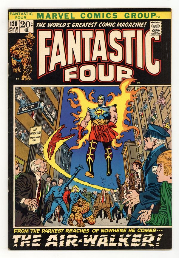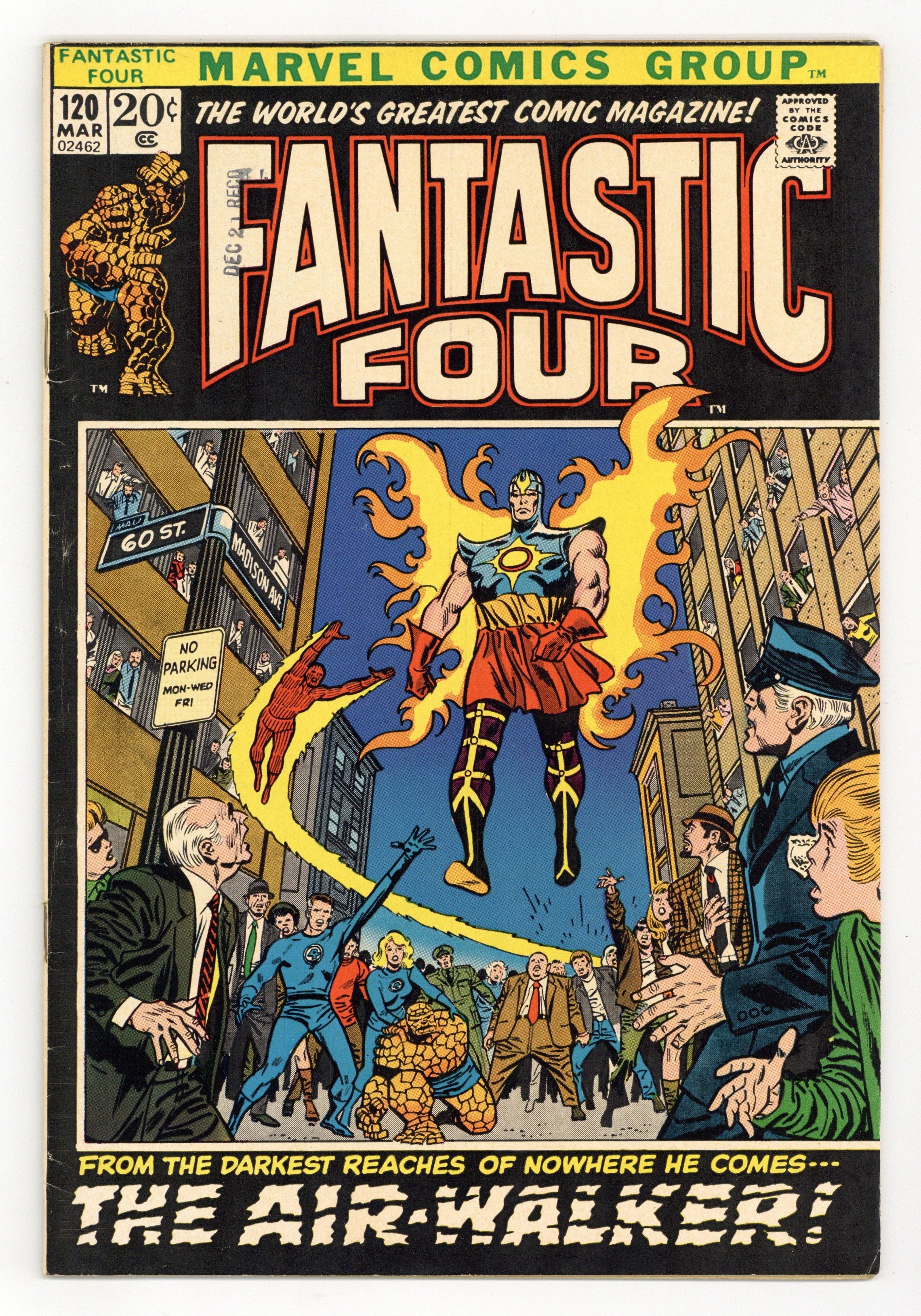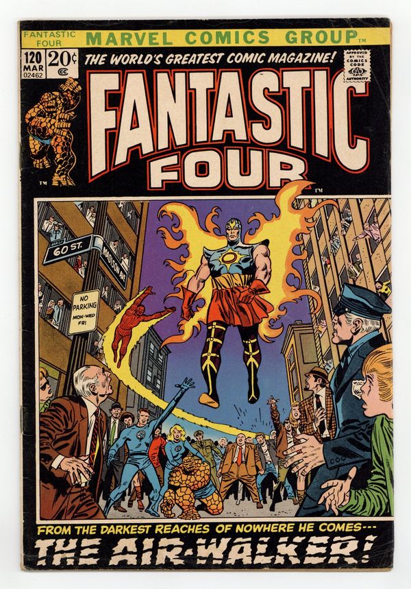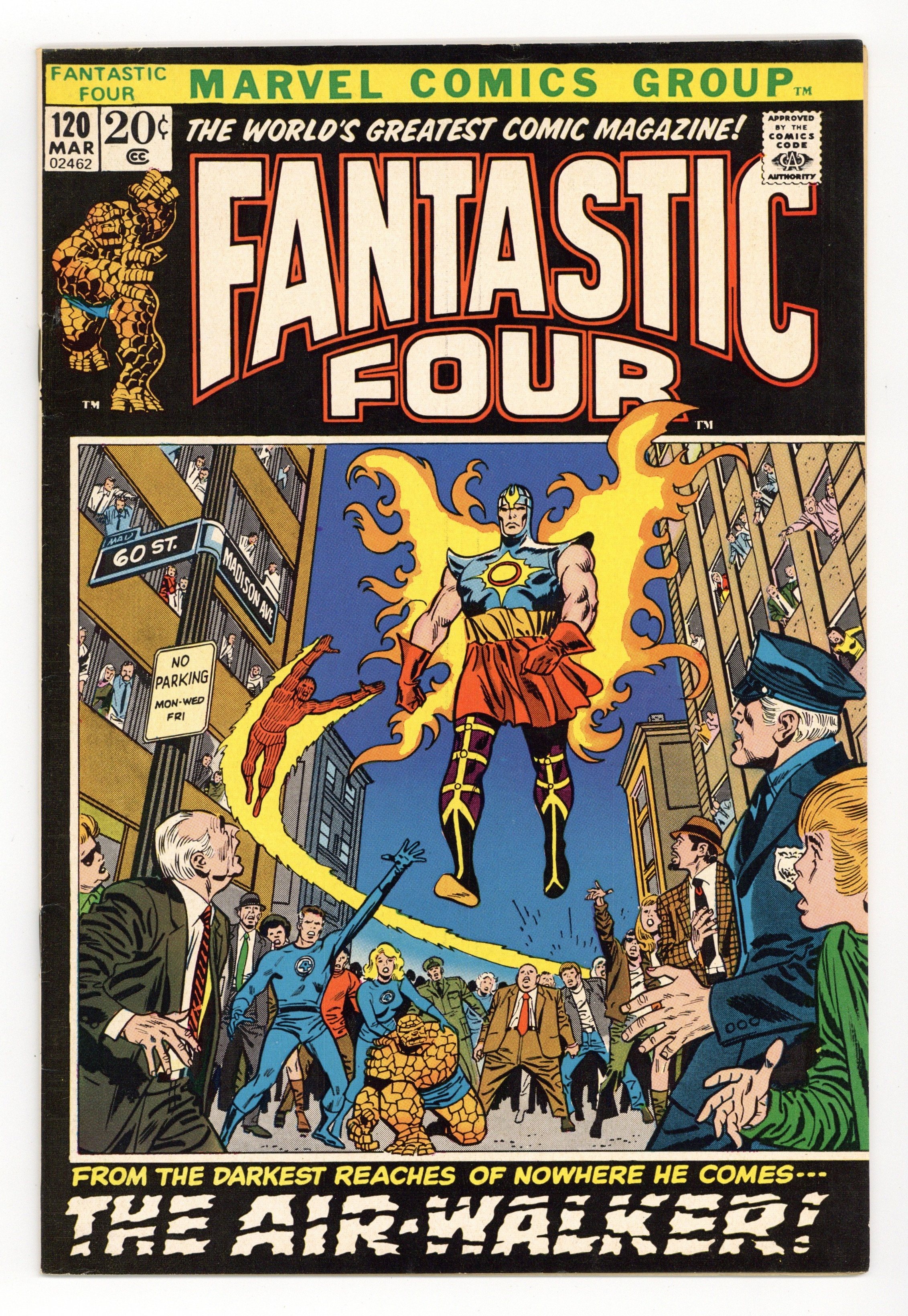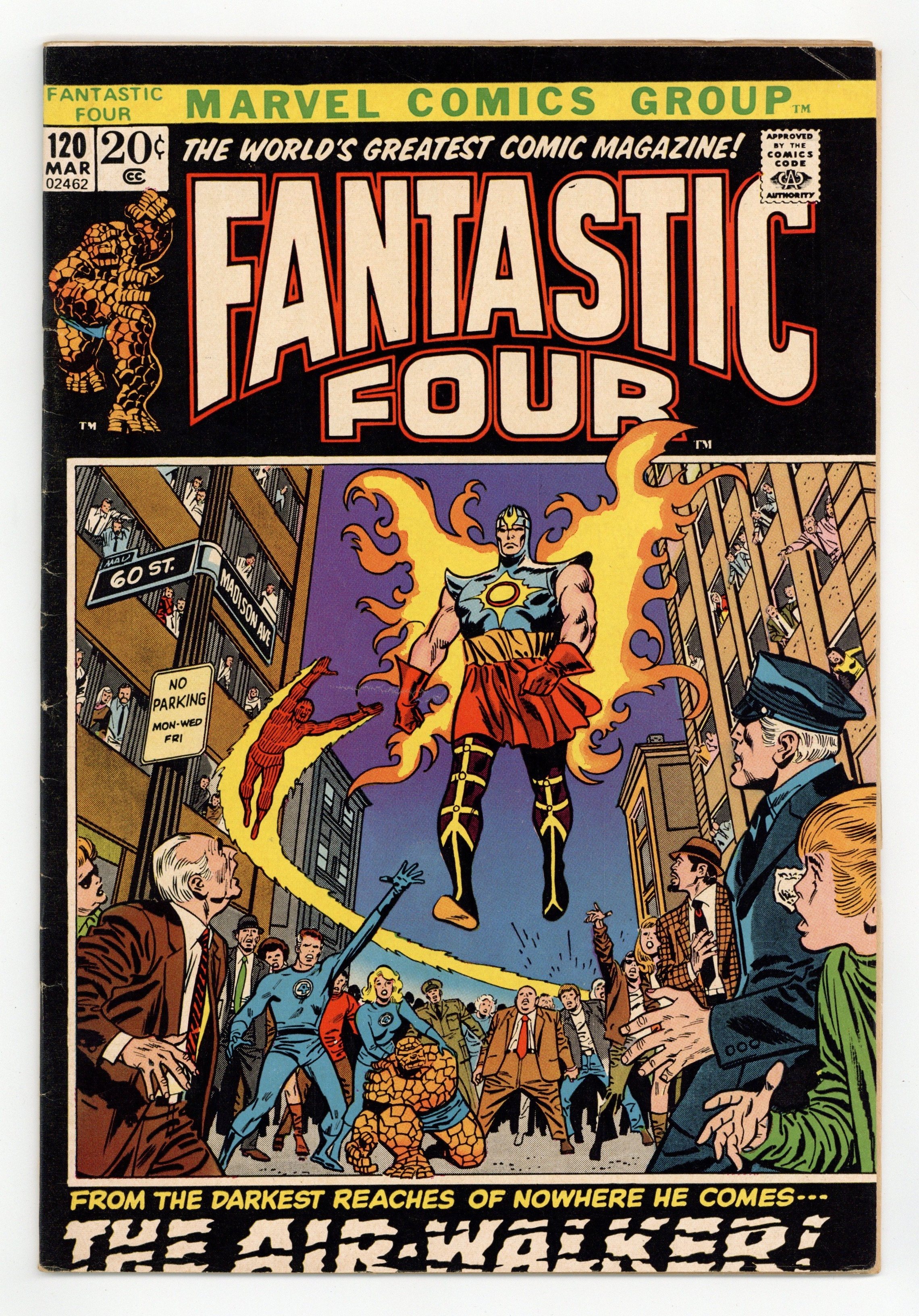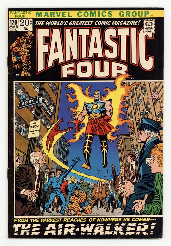 First appearance of the Air-Walker Automaton in "The Horror That Walks on Air!" Part 1 of 4. Script by Stan Lee. Pencils by John Buscema. Inks by Joe Sinnott. Cover by John Buscema and Frank Giacoia. The Air Walker has come to Earth! Is he friend or foe? The FF would like to know! So they lure the alien to the Baxter Building in order to study the mysterious visitor! But the U.S. military provokes the Air Walker into action, and the man who walks on air wipes out the soldiers with an awesome display of power! And then makes short work of the Fantastic Four too! This script seems eerily familiar...a mighty being wielding the power cosmic comes to Earth trumpeting the impending doom of the world. Could someone else, perhaps galactic in nature, be following in the Air Walker's wake? First appearance of the Air Walker automation. Cameo appearances by Mary Jane Watson , Agatha Harkness and General Thunderbolt Ross. (Note: This four-part story was reprinted in Marvel Treasury Edition 21.) 36 pages Cover price $0.20.
