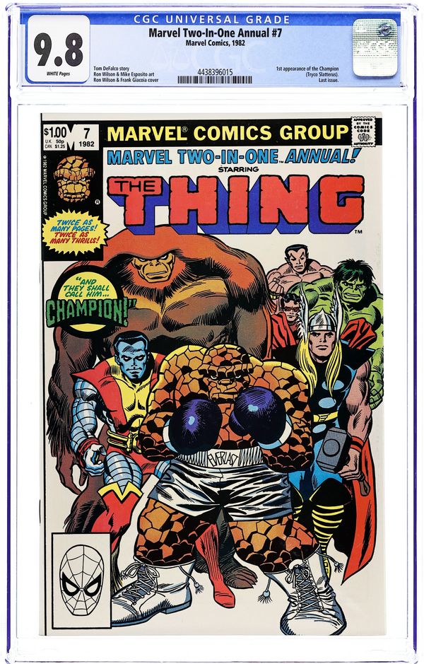 Direct Edition. "Champion!" Guest-starring Thor, Hulk, Sub-Mariner, Colossus, Sasquatch, Doc Samson, and Wonder Man. Cameos by the Fantastic Four, Avengers, and X-Men. Story by Tom DeFalco. Art by Ron Wilson, Camp Esposito, Giacoia, Dan Green, and Chic Stone. In arguably the best Thing story of all, a cosmic immortal known as the Champion, a being of nigh immeasurable strength whose existence is defined by physical contest, arrives on Earth and wishes to test his mettle against the mightiest heroes this planet has to offer. If they do not fight, this powerful being will destroy the Earth. After readily dispatching all contenders, the last man standing is Aunt Petunia's favorite nephew. But, can even the strongest member of the Fantastic Four hope to defeat an Elder of the Universe? 48 pages.