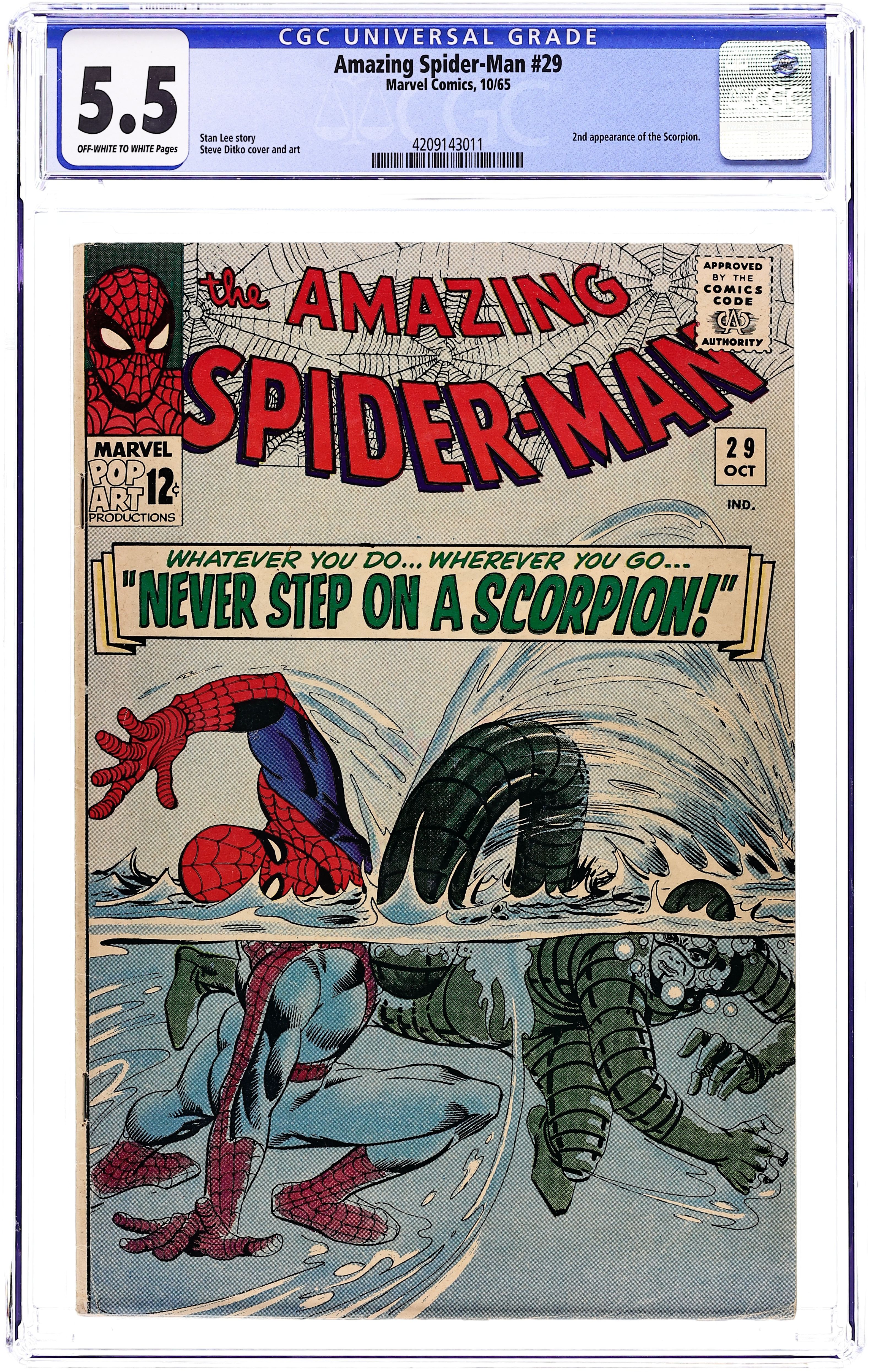 Cover by Steve Ditko. Never Step on a Scorpion!, script by Steve Ditko (plot) and Stan Lee (script), pencils by Steve Ditko, inks by Steve Ditko; Scorpion breaks free from jail and plans on killing both Spider-Man and J. Jonah Jameson. The Merry Marvel Bullpen Page; Ads for Spider-Man T-Shirt and MMMS fan club. Reprinted in Marvel Tales # 168. 36 pgs., full color. $0.12. Cover price $0.12.