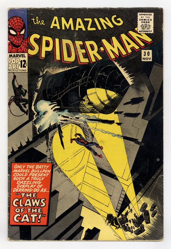 Cover by Steve Ditko. First appearance of the Cat (not the same character who would be introduced in "The Cat" # 1 from 1972 who would later become Tigra). The Claws of the Cat!, script by Steve Ditko (plot) and Stan Lee (script), art by Steve Ditko; Jameson offers a thousand dollar reward for catching The Cat, and Spider-Man plans to collect; Betty tells Peter that Ned has asked her to marry him. Ad for Marvel T-Shirts. A letter from Jack C. Harris. Reprinted in Marvel Tales # 23 and 169. 36 pgs., full color. $0.12. Cover price $0.12.