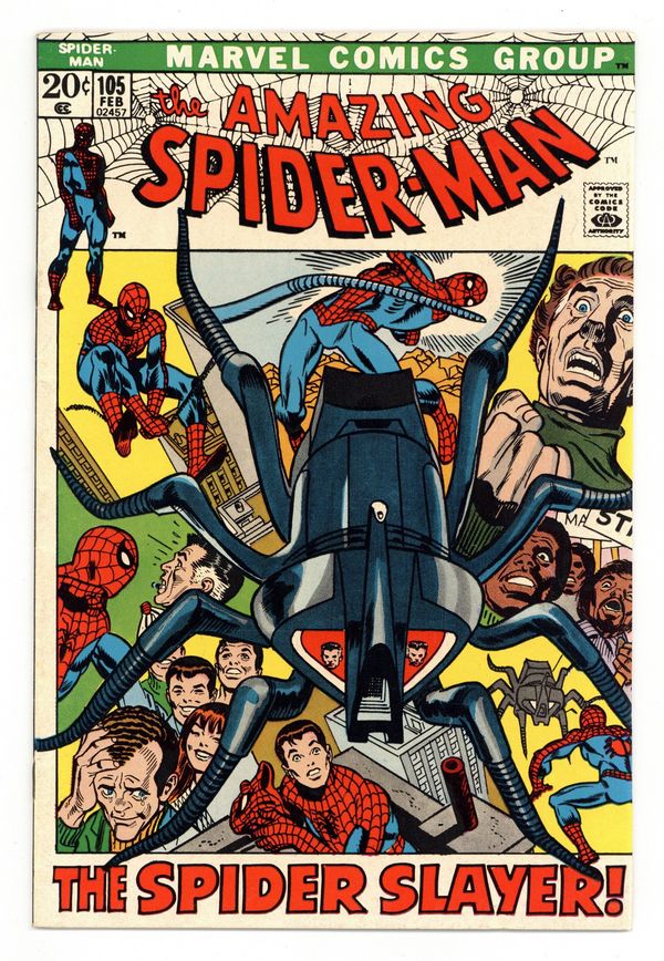Tags: Marvel Legacy Numbering: Amazing Spider-Man (part 105), Spider-Man$23.50"The Spider Slayer!" Part 1 of 3. Script by Stan Lee. Pencils by Gil Kane. Inks by Frank Giacoia. Cover by Gil Kane and Frank Giacoia. Harry Osborn is out of the hospital after receiving treatment for his drug addiction. And to welcome Harry back to his apartment, Peter and Aunt Maythrow a party for him! Many of Harry's friends attend including Gwen, Mary Jane, and Flash Thompson -- plus Harry's father Norman. Meanwhile, J. Jonah Jameson meets with Spencer Smythe across town. Is Professor Smythe cooking up another spider slayer? Yes he is! And right at dusk the new and improved spider slayer attacks the web-slinger! Will this spider slayer live up to its name? Cameo appearances by Joe Robertson and Randy Robertson. (Notes: This issue is the first appearance of the spider slayer robot (Mark III) -- shaped like an actual spider. Spencer Smythe previously appeared in Amazing Spider-Man #58. This story was reprinted in Marvel Tales #84.) 36 pages. Cover price $0.20.