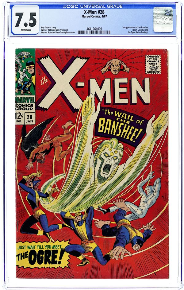 1st printing. Cover pencils by Werner Roth, inks by John Tartaglione. The Wail of the Banshee!, script by Roy Thomas, pencils by Werner Roth, inks by Dick Ayers; Banshee is apparently a villain working with Ogre and the Factor Three; Banshee steals imported tobacco and a painting called the Gaelic Landscape; the X-Men test Mimics powers; 1st appearance of the Banshee. 36 pgs. $0.12. NOTE: 1994 JC Penney reprint exists. Can be identified by having a Stridex ad on the back cover. Cover price $0.12.