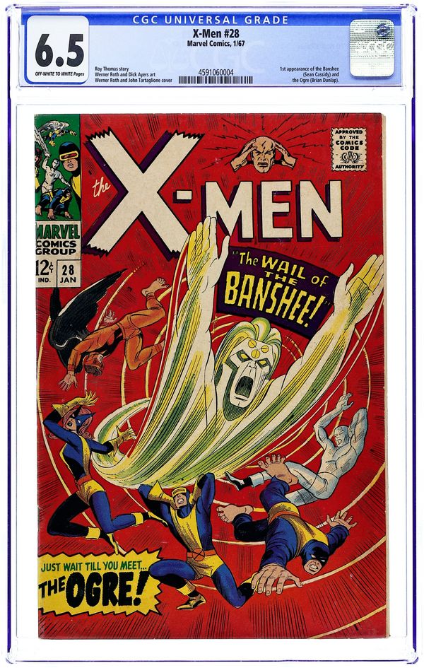 Starts Jan 3 1st printing. Cover pencils by Werner Roth, inks by John Tartaglione. The Wail of the Banshee!, script by Roy Thomas, pencils by Werner Roth, inks by Dick Ayers; Banshee is apparently a villain working with Ogre and the Factor Three; Banshee steals imported tobacco and a painting called the Gaelic Landscape; the X-Men test Mimics powers; 1st appearance of the Banshee. 36 pgs. $0.12. NOTE: 1994 JC Penney reprint exists. Can be identified by having a Stridex ad on the back cover. Cover price $0.12.