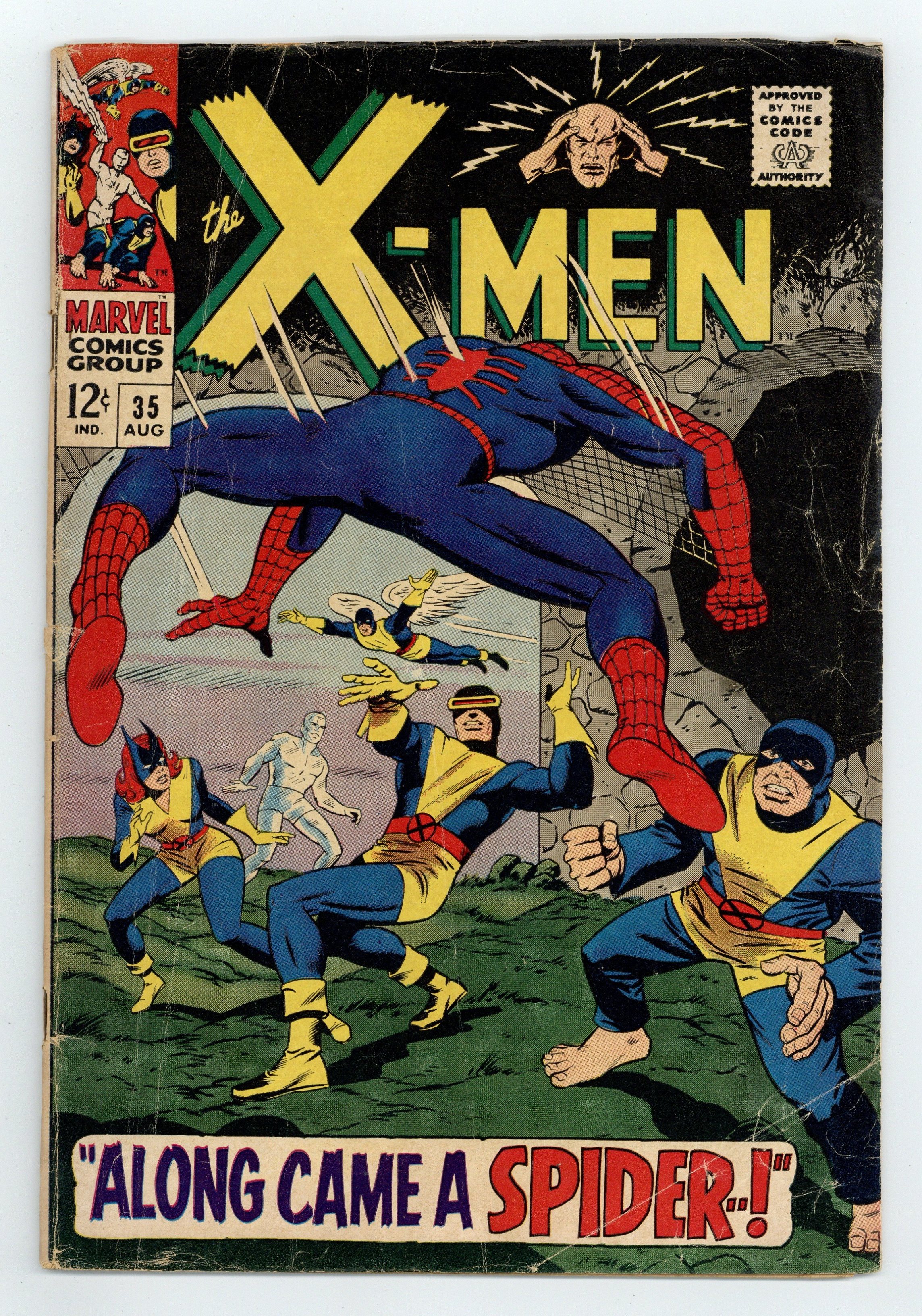 Starts Jul 4 Cover art by Dan Adkins. Along Came a Spider..., script by Roy Thomas, pencils by Werner Roth, inks by Dan Adkins; Banshee calls to the X-Men for help against a mysterious spider creature, and when the young mutants run across Spider-Man, they mistake him for their foe and a battle ensues. House ad for issue #2 of Not Brand Echh. Letter from future comics professional Mark Evanier, whose entry is in the form of a poem. Ad for The Merry Marvel Marching Society. 36 pgs. $0.12. Cover price $0.12.