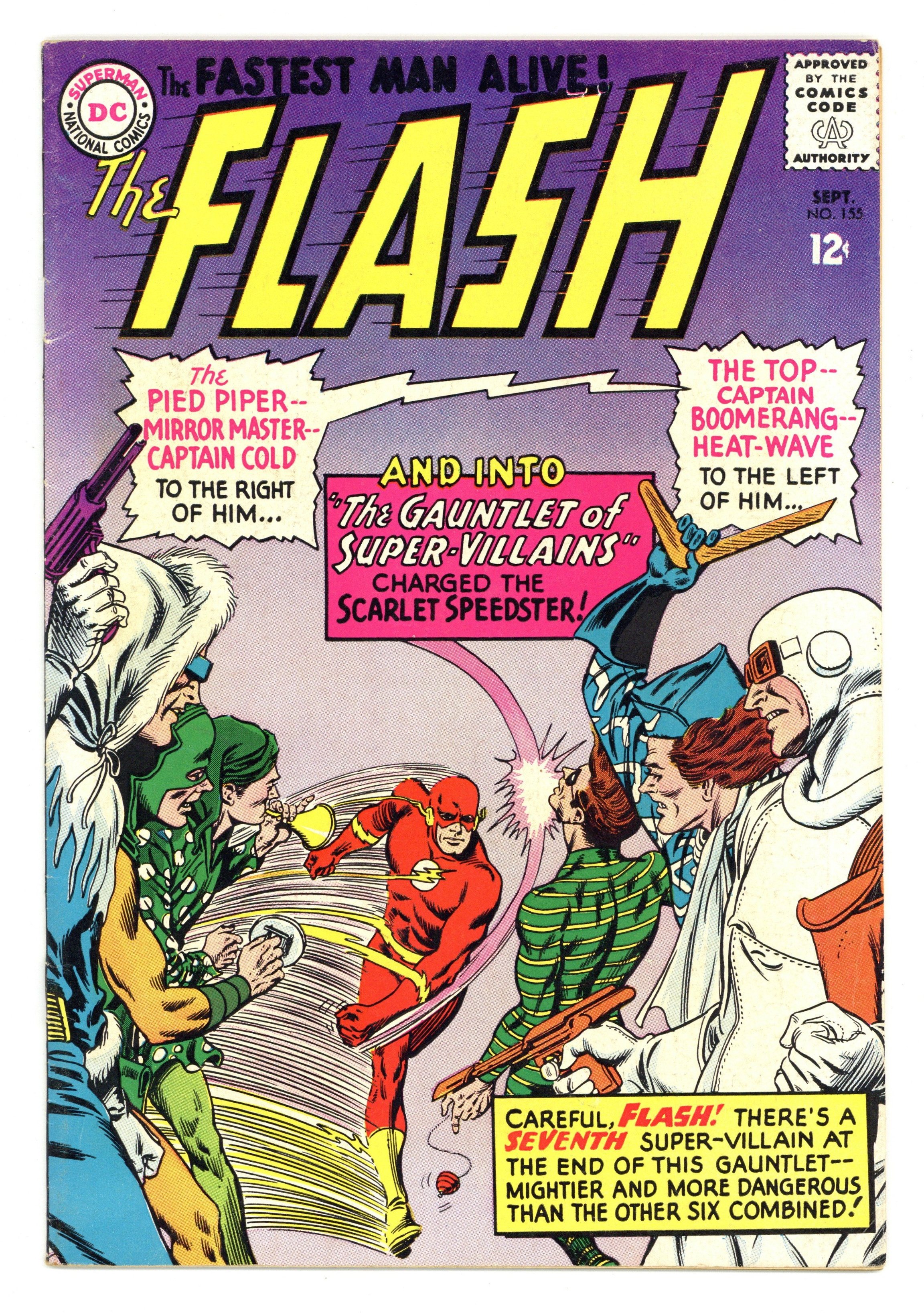 Cover pencils by Carmine Infantino, inks by Murphy Anderson. Gauntlet of Super-Villains, script by John Broome, pencils by Carmine Infantino, inks by Joe Giella; Gorilla Grodd uses his powers to switch bodies with a gorilla in the Central City zoo and from there he uses Flash's greatest foes to battle Flash until he can take control of Barry Allen's mind. G.I. Joe club ad. Little Pete half-page strip by Henry Boltinoff. Palisades Amusement Park ad with Superman. 80 pg. Giant Lois Lane ad. Showcase Presents Enemy Ace ad. Letter from noted letter hack Guy H. Lillian III. Whats the Difference Between Exercise, Drill, Practice filler half-page. 36 Pages, Full Color. Cover price $0.12.