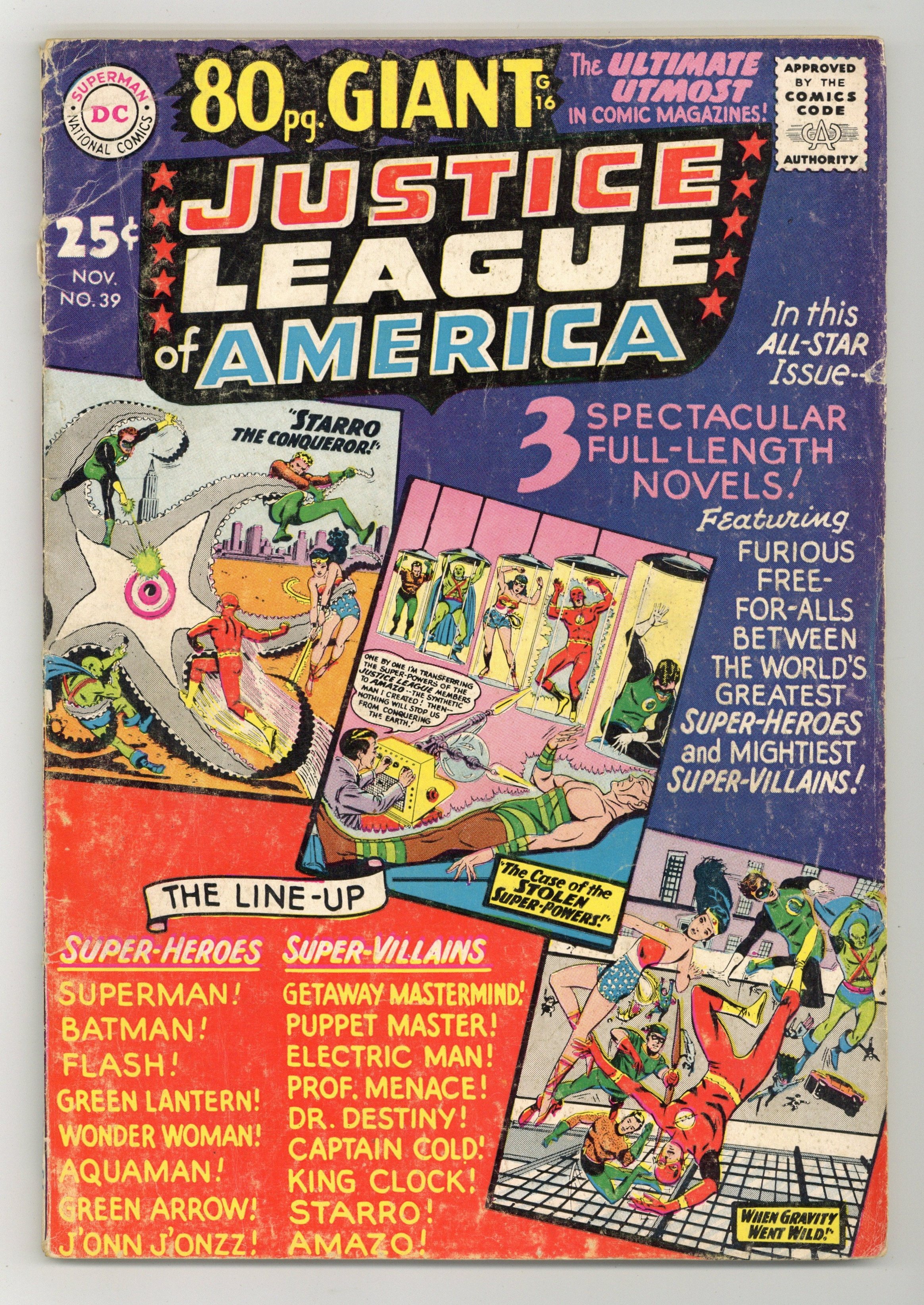 Cover pencils by Mike Sekowsky, inks by Murphy Anderson and Bernard Sachs. Reprints. Starro the Conqueror, script by Gardner Fox, pencils by Mike Sekowsky, inks by Bernard Sachs. Starro vs. Green Lantern, script by Gardner Fox, pencils by Mike Sekowsky, inks by Joe Giella. Starro vs. Wonder Woman and John Jones, Manhunter from Mars, script by Gardner Fox, pencils by Mike Sekowsky, inks by Bernard Sachs. Starro vs. the Flash!, script by Gardner Fox, pencils by Mike Sekowsky, inks by Murphy Anderson. Starro vs. Justice League of America, script by Gardner Fox, pencils by Mike Sekowsky, inks by Bernard Sachs. Case of the Stolen Super-Powers!, script by Gardner Fox, pencils by Mike Sekowsky, inks by Bernard Sachs. When Gravity Went Wild!, script by Gardner Fox, pencils by Mike Sekowsky, inks by Bernard Sachs. Half-page index of the first 39 issues. Rocky and Bullwinkle star in a one-page Cheerios ad. 84 pgs. $0.25. Cover price $0.25.