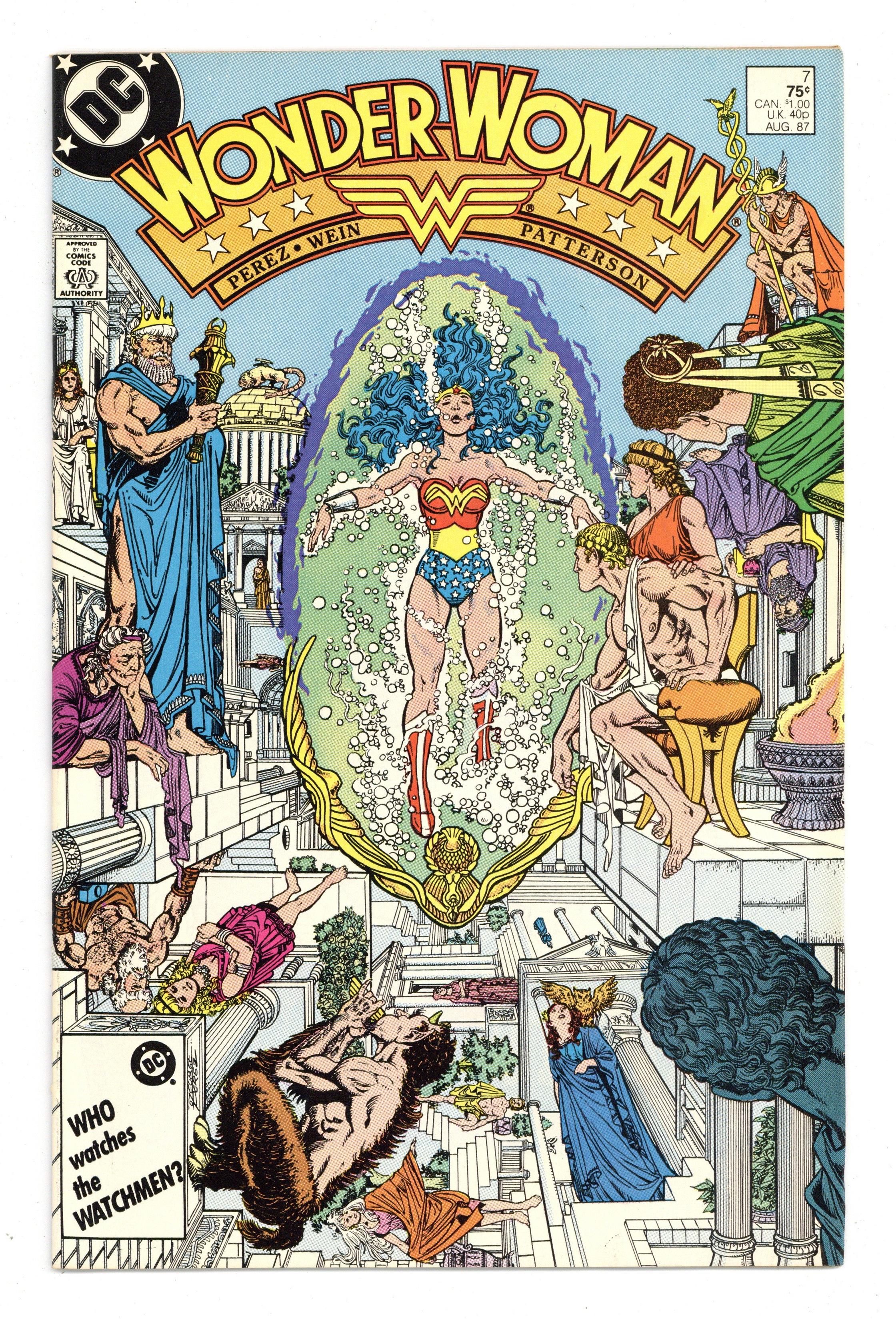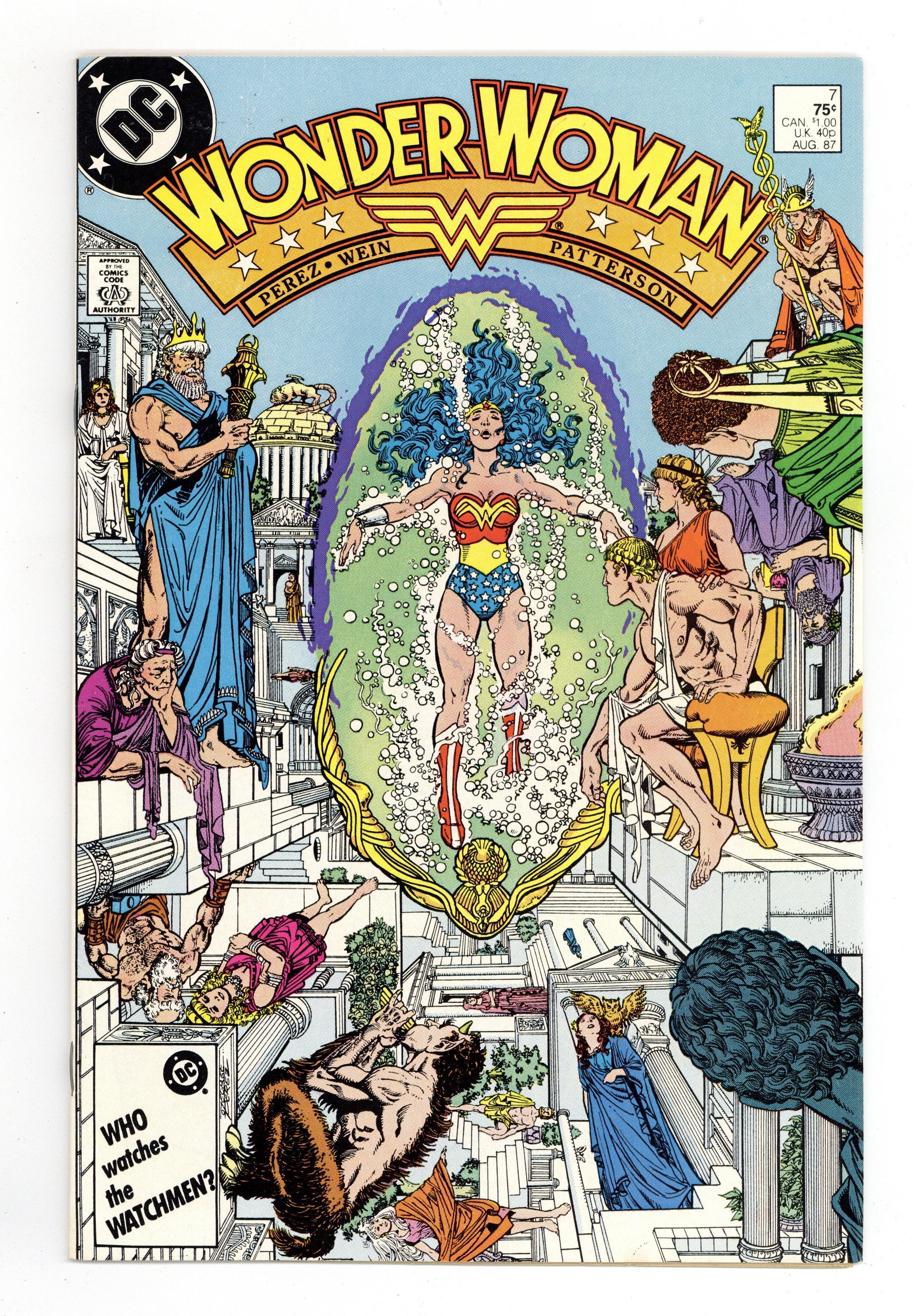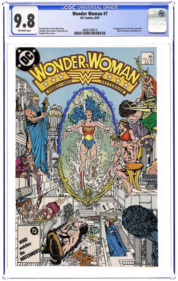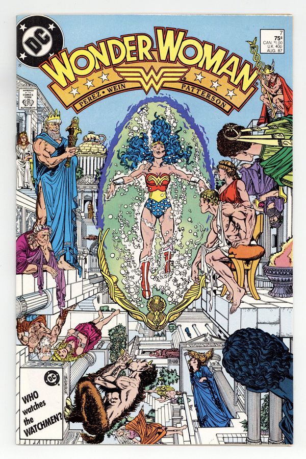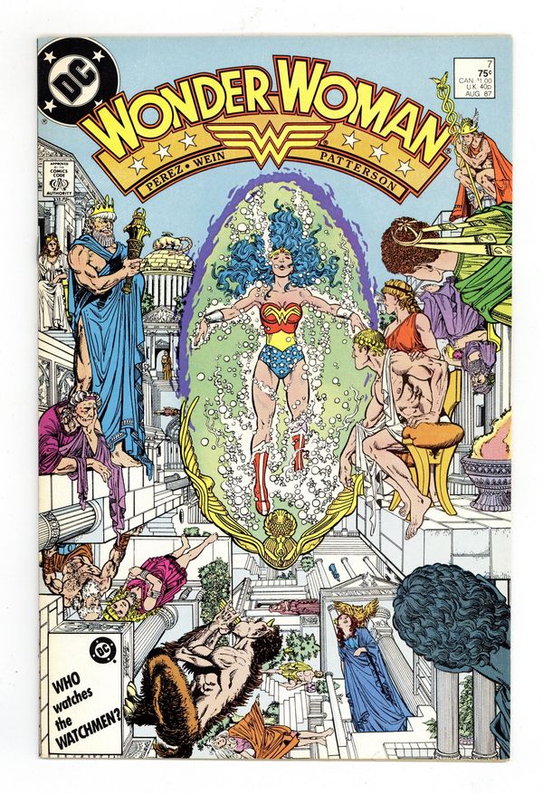 Tags: Wonder Woman$13.00Diana recovers on Paradise Island, Myndi Mayer courts Diana and Professor Kapatelis so she can be Wonder Woman's publicist, and the Cheetah covets a certain golden lasso in "Rebirth!" Script by Len Wein, plot and pencils by George Perez, inks by Bruce Patterson. Perez cover. 36 pgs. Cover price $0.75.
