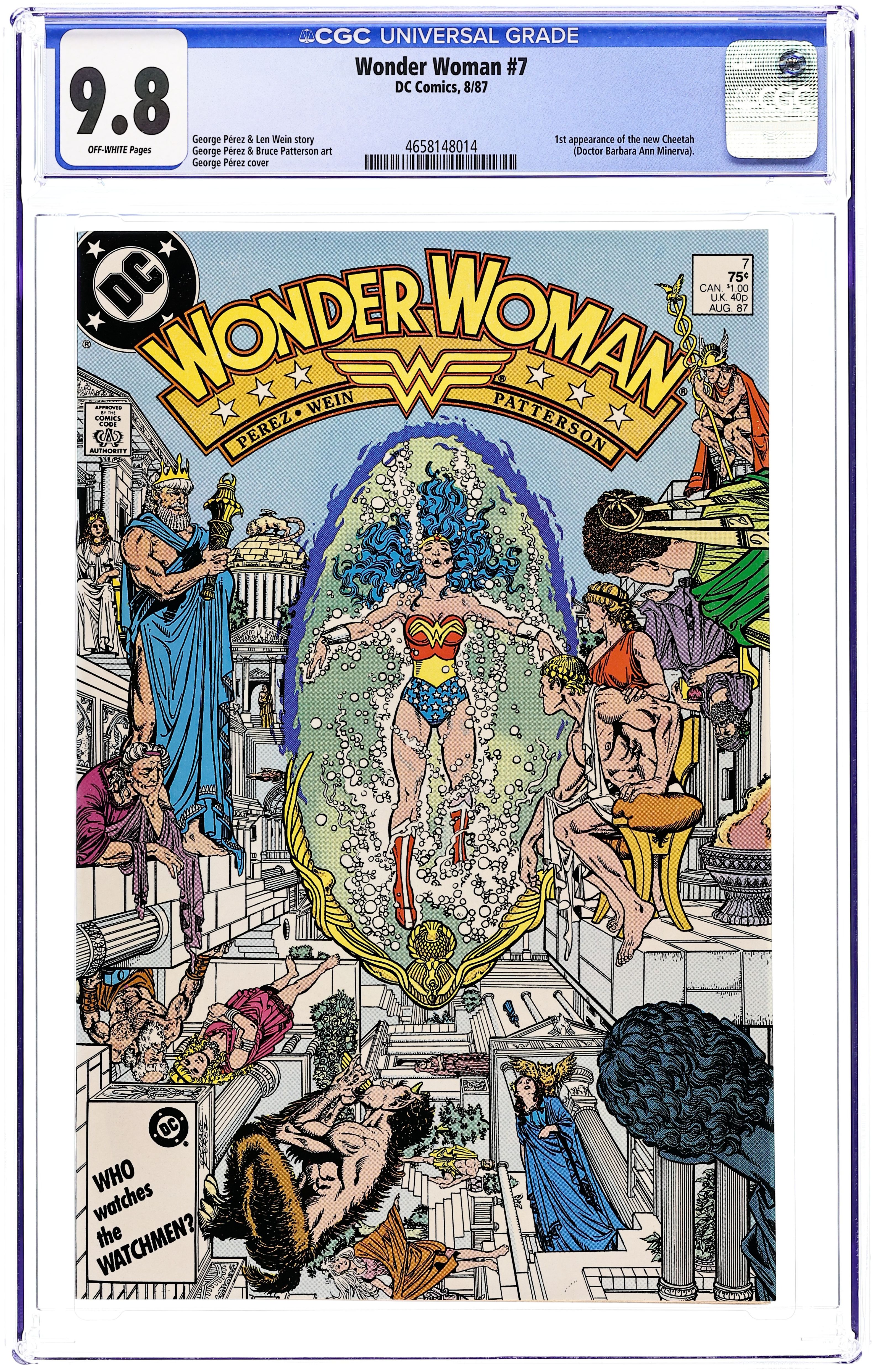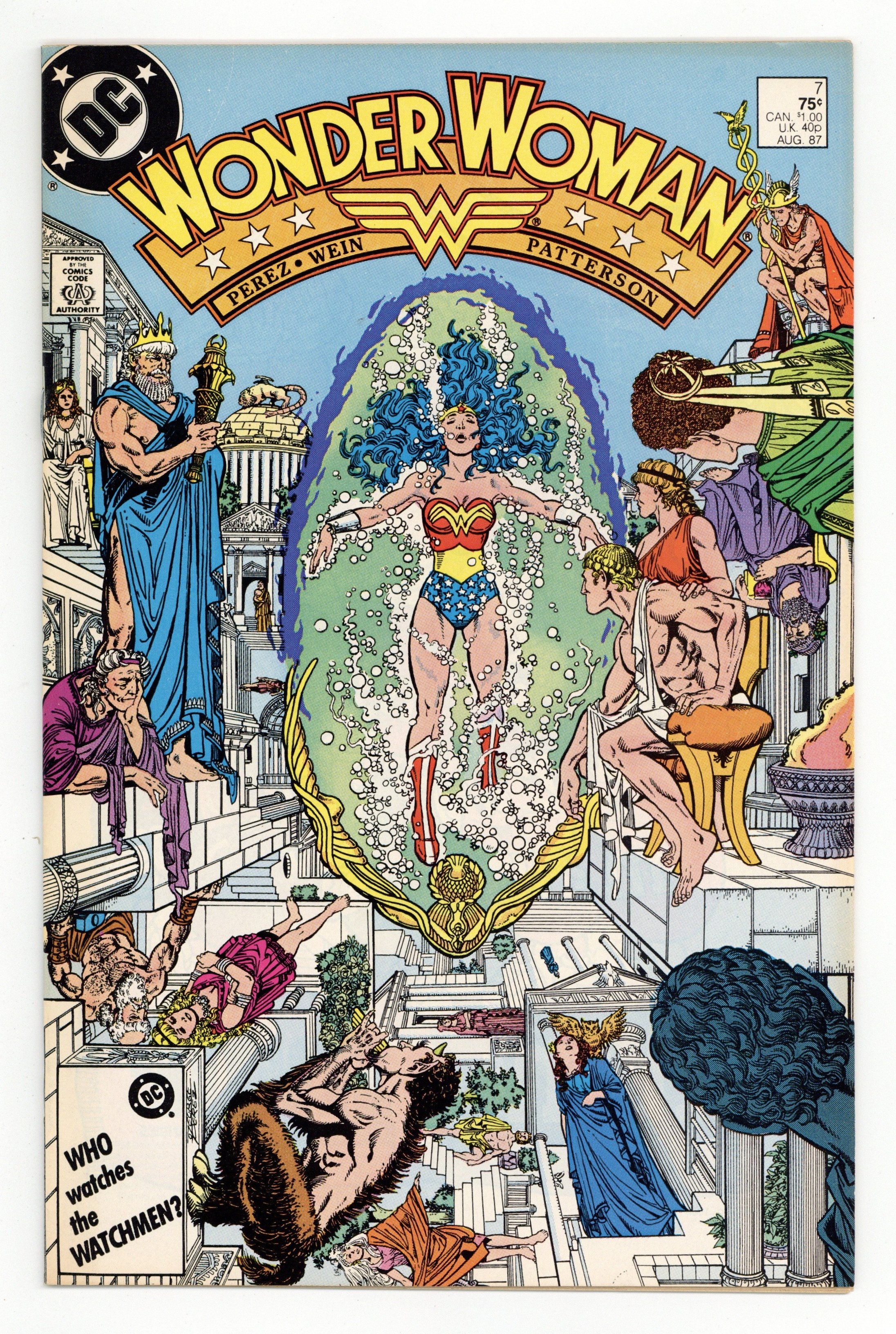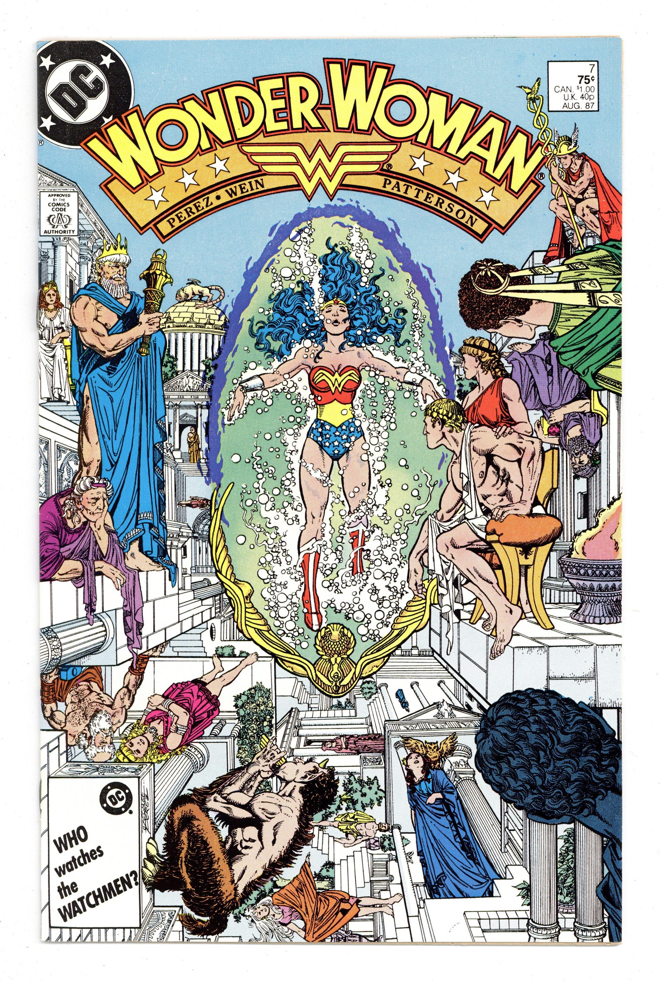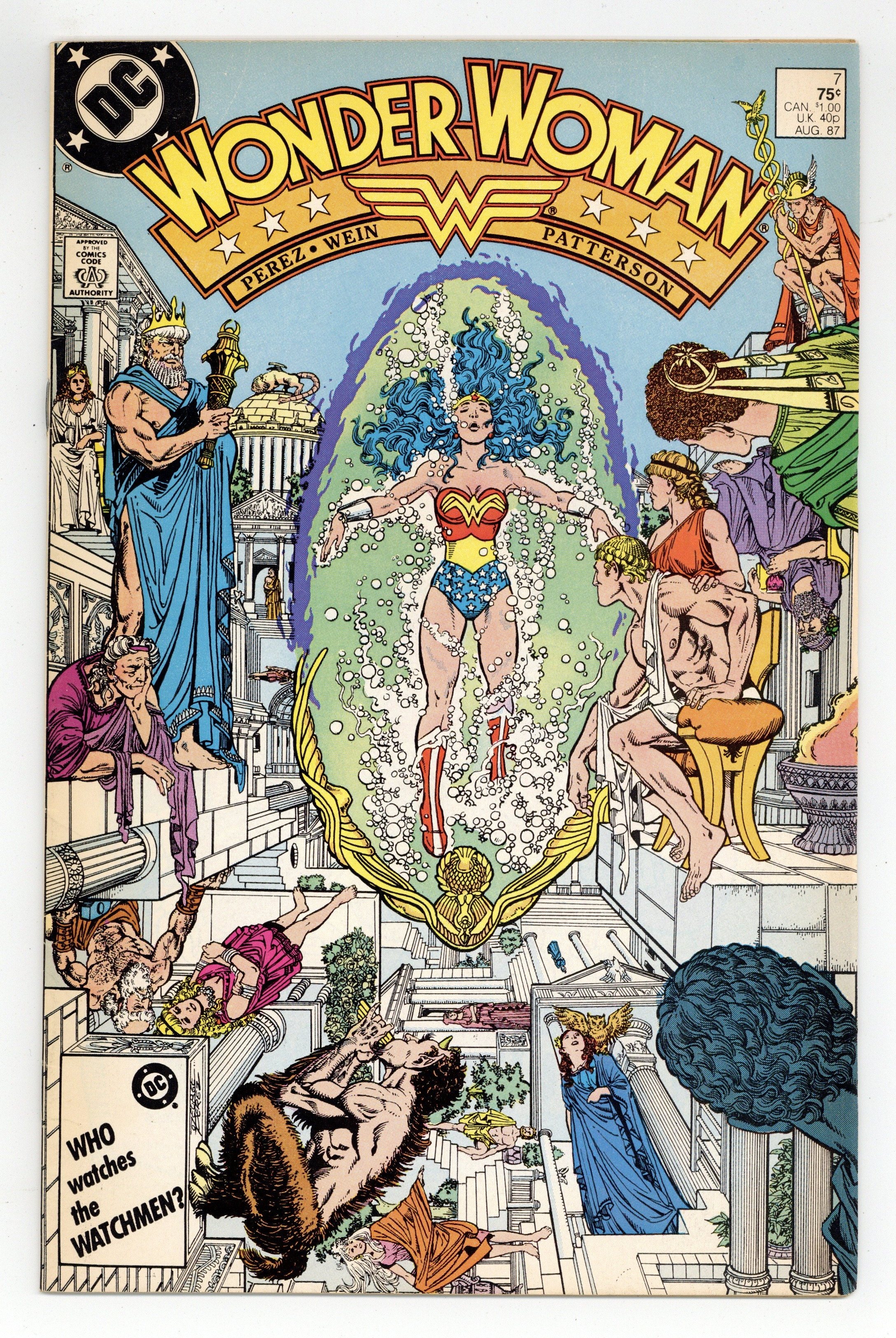 Tags: Wonder Woman$13.00Diana recovers on Paradise Island, Myndi Mayer courts Diana and Professor Kapatelis so she can be Wonder Woman's publicist, and the Cheetah covets a certain golden lasso in "Rebirth!" Script by Len Wein, plot and pencils by George Perez, inks by Bruce Patterson. Perez cover. 36 pgs. Cover price $0.75.