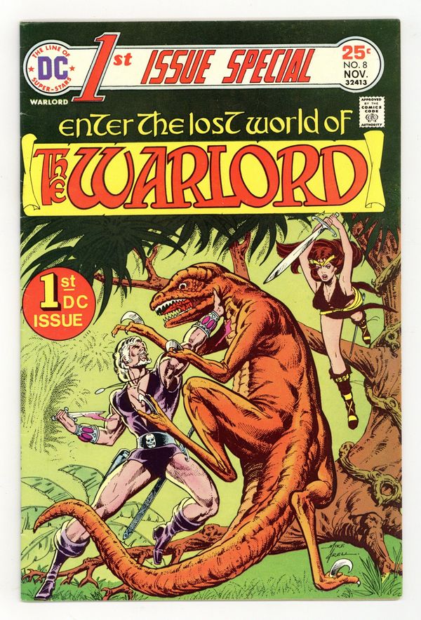 "Land of Fear!" A pilot finds himself in the subterranean world of Skartaris, where he rescues a girl and angers a high priest. 1st appearance of Travis "Warlord" Morgan. Script, art, and cover by Mike Grell. Cover price $0.25.