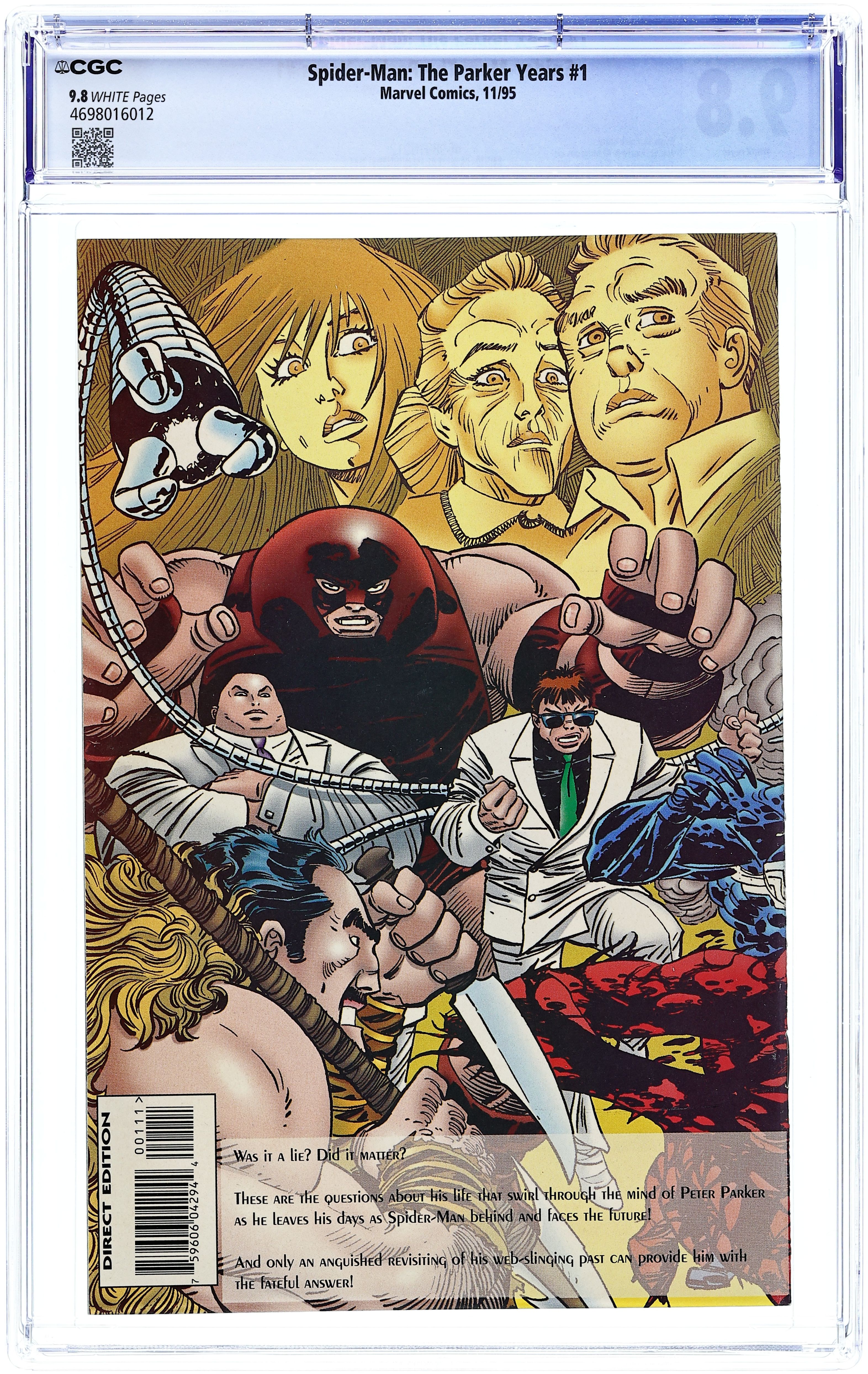 "The Parker Years" Script by Evan Skolnick. Pencils by Joe St. Pierre. Inks by Al Milgrom. Wraparound cover by John Romita Jr. and Andrew Wildman. Following the astonishing events of Spectacular Spider-Man 229, Peter and Mary Jane begin packing their belongings to leave New York City. But before they go, the Amazing Spider-Man and his wife take a walk down memory lane. Remembering the highlights and lowlights of the wall-crawler's career since the end of the original clone saga in Amazing Spider-Man 149. Flashback cameos by the Hobgoblin, Venom, Carnage, Kingpin, Dr. Octopus, Punisher, Black Cat, Scarlet Spider, and many other heroes and villains. (Notes: Peter and Mary Jane appear next in the four-issue Spider-Man The Final Adventure (1995) limited series. The back inside cover lists the cross references for all the flashbacks. This issue is printed on glossy paper. There are not any advertisements inside. The Parker Years one-shot was reprinted in 2011 in the trade paperback: Amazing Spider-Man The Complete Ben Reilly Epic #1.) 32 pages. Cover price $2.50.