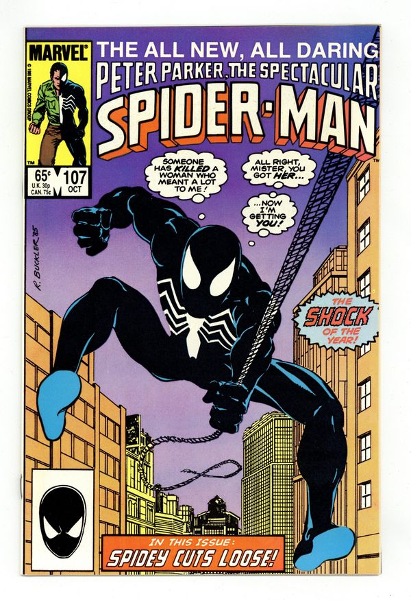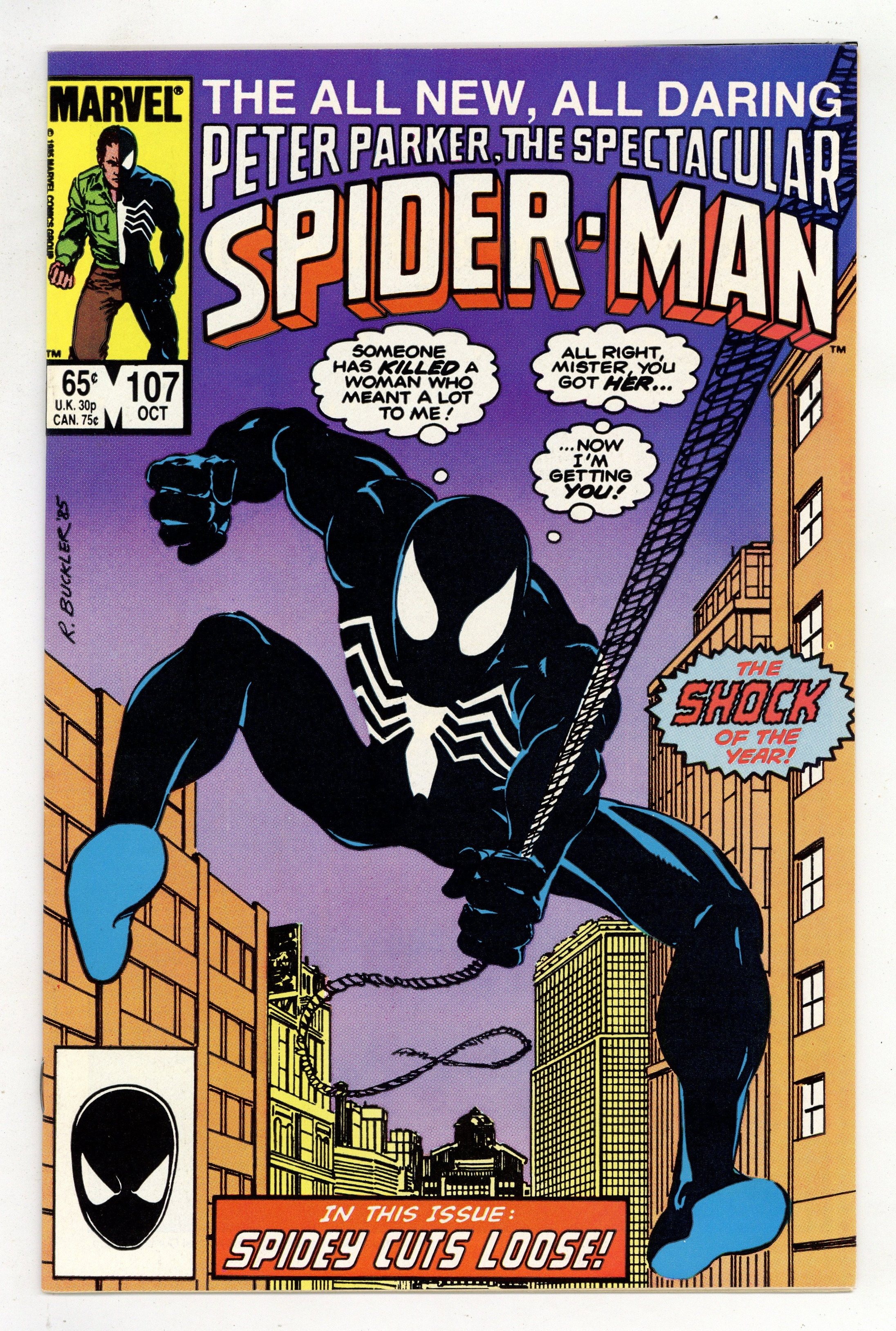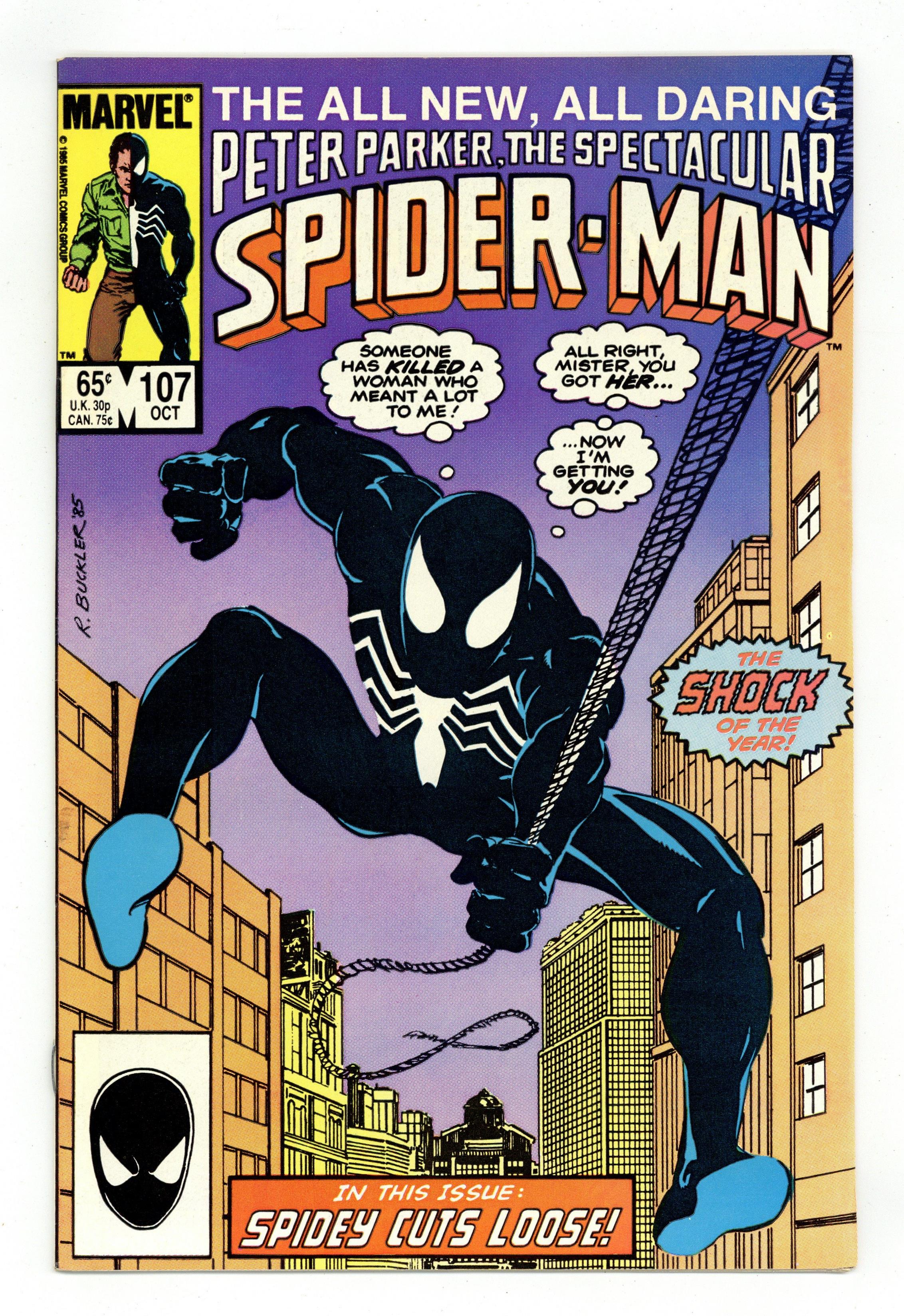 Tags: Marvel Legacy Numbering: Spectacular Spider-Man (part 107), Spider-Man$18.00Direct Edition. "Original Sin" Part 1 of 4. Guest-starring Daredevil. Script by Peter David. Pencils by Rich Buckler. Inks by Brett Breeding. Cover by Rich Buckler. The critically acclaimed Death of Jean DeWolff storyline begins with this issue. In a stunning development, police captain Jean DeWolff is found murdered in her apartment. The entire city is in a state of shock over the killing including the police department, the staff at the Daily Bugle, and the Amazing Spider-Man. The web-slinger (in his black costume) begins investigating the homicide by meeting with the detective assigned to the case, Stan Carter. However, another superhero, Daredevil, gets the first shot at stopping the murderous rampage of the Sin-Eater! First appearance of the Sin-Eater. 32 pages Cover price $0.65.
