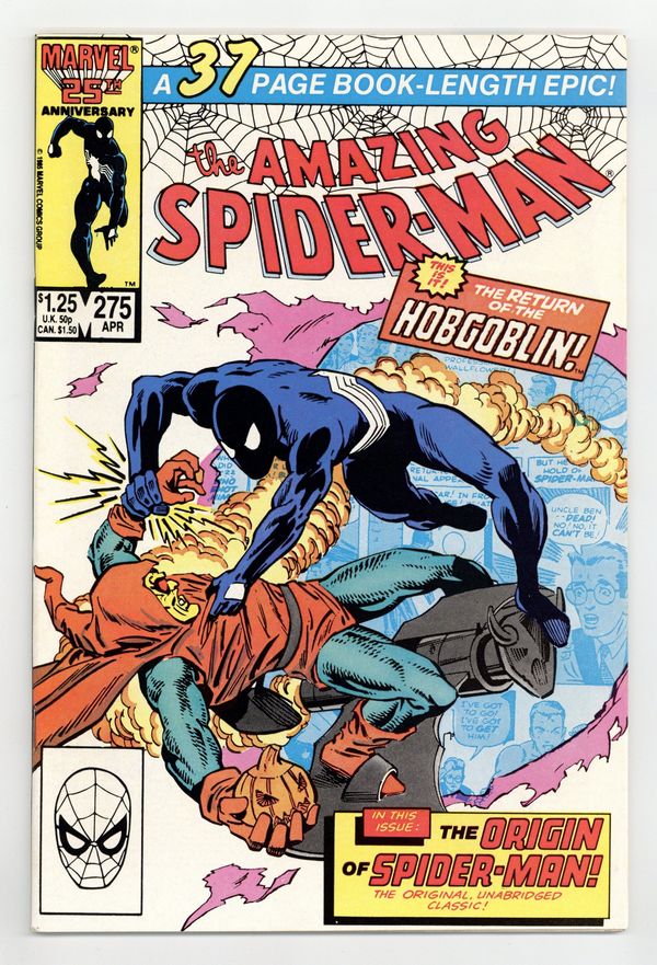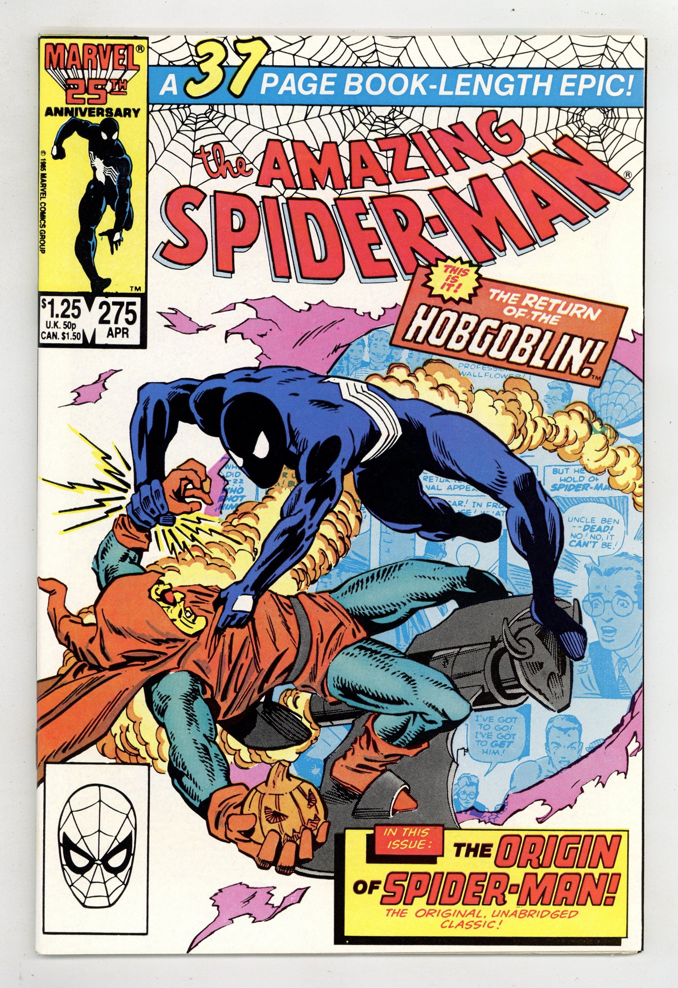 Tags: Marvel Legacy Numbering: Amazing Spider-Man (part 275), Spider-Man$17.75Direct Edition. "The Choice and the Challenge!" Part 1 of 2. Double-sized issue. Script by Tom DeFalco. Pencils by Ron Frenz. Inks by Joe Rubinstein. Cover by Ron Frenz and Joe Rubinstein. Affairs of the heart take center stage for Peter, Mary Jane, Betty, Ned, Flash, and Sha Shan as the long-time group of friends deal with a variety of relationship problems! But amid the soap opera-style drama, there is a super-villain on the prowl...the Hobgoblin! Armed with a new weapons system, the goblin circles the Port Authority Bus Terminal to draw out the web-slinger! Surprisingly the Hobgoblin's plan works! And then so does his new weapon! Is the goblin finally going to put Spidey down for the count? Cameo appearances by the Kingpin, Arranger, and Rose. Flashback cameos by the Green Goblin, Gwen Stacy, and the Sin-Eater. (Notes: Woven into the story are 11 (reprinted) pages of Spider-Man's origin from Amazing Fantasy 15. Script by Stan Lee. Art by Steve Ditko. On the cover the web-slinger and Hobgoblin break through a page from Amazing Fantasy 15. This issue was reprinted in Marvel Tales 283.)52 pgs. Cover price $1.25.