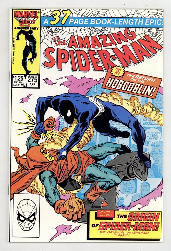 Tags: Marvel Legacy Numbering: Amazing Spider-Man (part 275), Spider-Man$14.25Direct Edition. "The Choice and the Challenge!" Part 1 of 2. Double-sized issue. Script by Tom DeFalco. Pencils by Ron Frenz. Inks by Joe Rubinstein. Cover by Ron Frenz and Joe Rubinstein. Affairs of the heart take center stage for Peter, Mary Jane, Betty, Ned, Flash, and Sha Shan as the long-time group of friends deal with a variety of relationship problems! But amid the soap opera-style drama, there is a super-villain on the prowl...the Hobgoblin! Armed with a new weapons system, the goblin circles the Port Authority Bus Terminal to draw out the web-slinger! Surprisingly the Hobgoblin's plan works! And then so does his new weapon! Is the goblin finally going to put Spidey down for the count? Cameo appearances by the Kingpin, Arranger, and Rose. Flashback cameos by the Green Goblin, Gwen Stacy, and the Sin-Eater. (Notes: Woven into the story are 11 (reprinted) pages of Spider-Man's origin from Amazing Fantasy 15. Script by Stan Lee. Art by Steve Ditko. On the cover the web-slinger and Hobgoblin break through a page from Amazing Fantasy 15. This issue was reprinted in Marvel Tales 283.)52 pgs. Cover price $1.25.