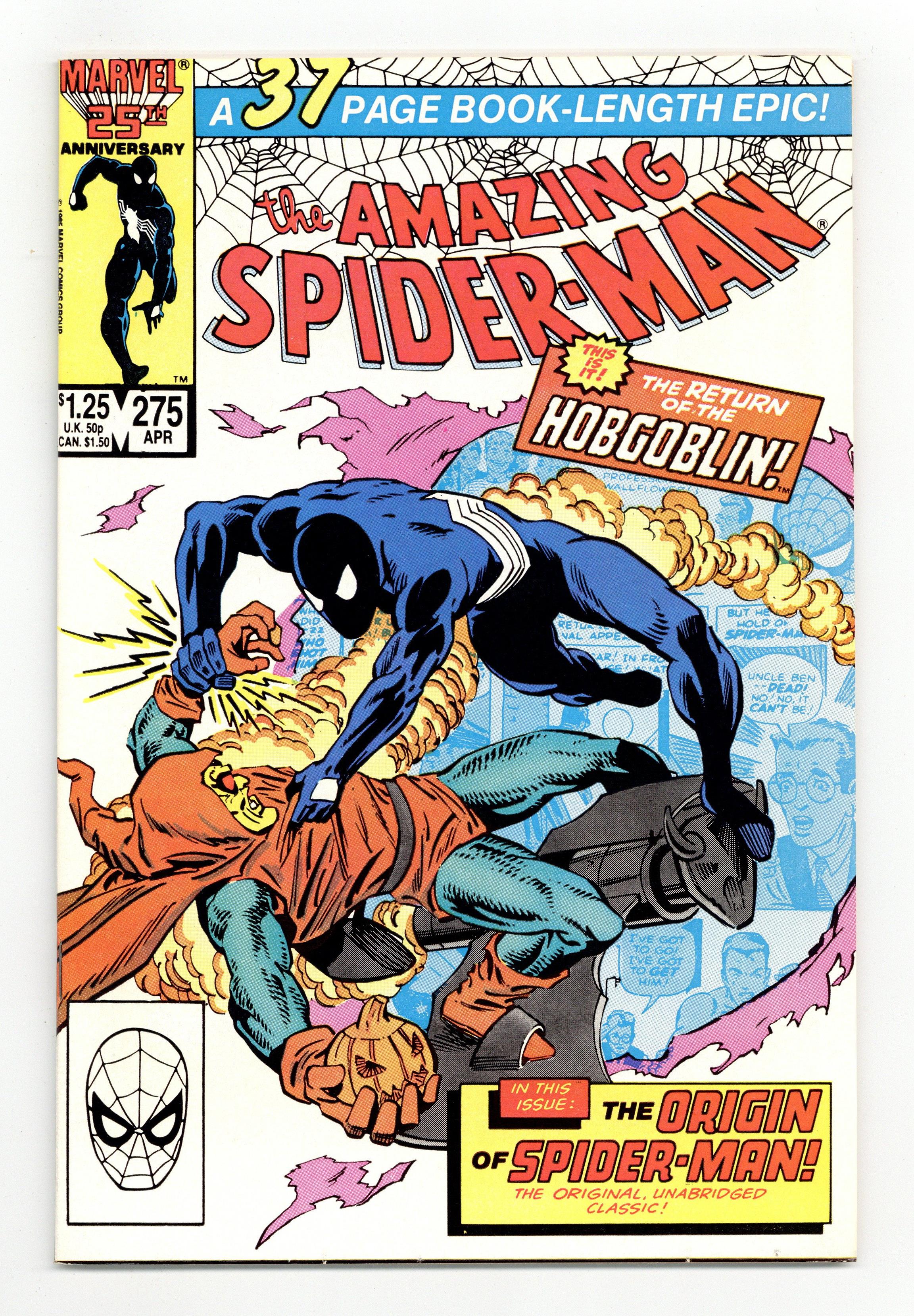 Tags: Marvel Legacy Numbering: Amazing Spider-Man (part 275), Spider-Man$13.50Direct Edition. "The Choice and the Challenge!" Part 1 of 2. Double-sized issue. Script by Tom DeFalco. Pencils by Ron Frenz. Inks by Joe Rubinstein. Cover by Ron Frenz and Joe Rubinstein. Affairs of the heart take center stage for Peter, Mary Jane, Betty, Ned, Flash, and Sha Shan as the long-time group of friends deal with a variety of relationship problems! But amid the soap opera-style drama, there is a super-villain on the prowl...the Hobgoblin! Armed with a new weapons system, the goblin circles the Port Authority Bus Terminal to draw out the web-slinger! Surprisingly the Hobgoblin's plan works! And then so does his new weapon! Is the goblin finally going to put Spidey down for the count? Cameo appearances by the Kingpin, Arranger, and Rose. Flashback cameos by the Green Goblin, Gwen Stacy, and the Sin-Eater. (Notes: Woven into the story are 11 (reprinted) pages of Spider-Man's origin from Amazing Fantasy 15. Script by Stan Lee. Art by Steve Ditko. On the cover the web-slinger and Hobgoblin break through a page from Amazing Fantasy 15. This issue was reprinted in Marvel Tales 283.)52 pgs. Cover price $1.25.