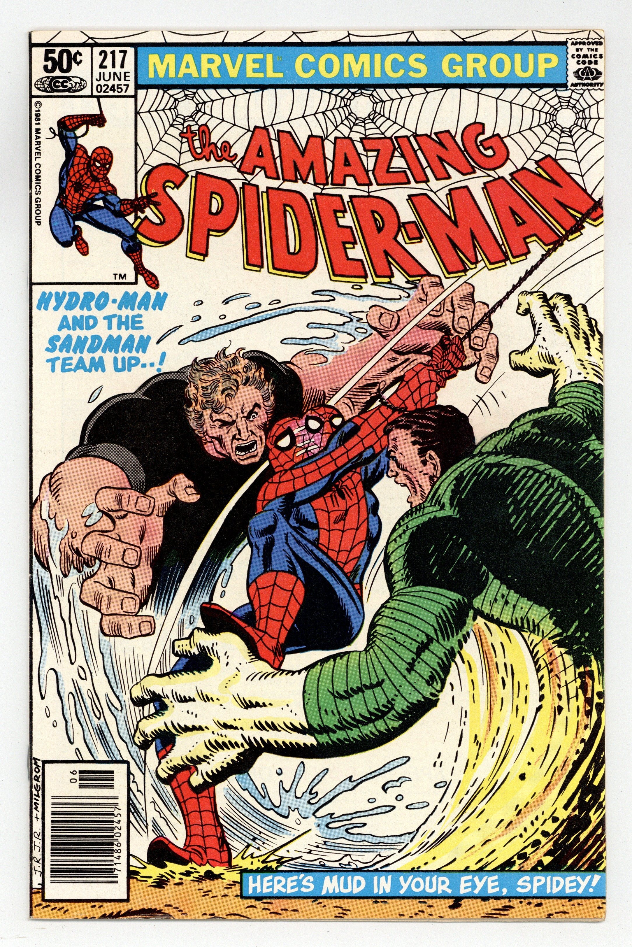 Tags: Marvel Legacy Numbering: Amazing Spider-Man (part 217), Spider-Man$15.00Newsstand Edition. "Here's Mud in Your Eye!" Part 1 of 2. Script by Denny O'Neil. Art by John Romita Jr. (breakdowns) and Jim Mooney (finishes). Cover by John Romita Jr. and Al Milgrom. At a shady west side bar, two super-villains bump into each other! The Sandman and Hydro-Man! Initially they fight one another over the affections of a sleazy barmaid, but eventually the duo decides to go after their mutual enemy...the wondrous wall-crawler! Typically sand and water is not a flammable mixture, but in this case, it could be a lethal combination for your friendly neighborhood Spider-Man! 36 pages. Cover price $0.50.