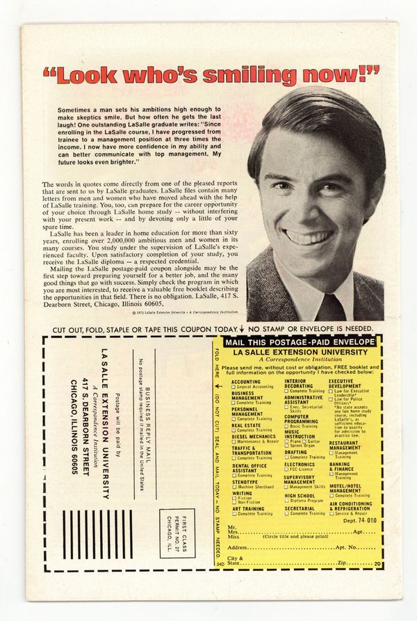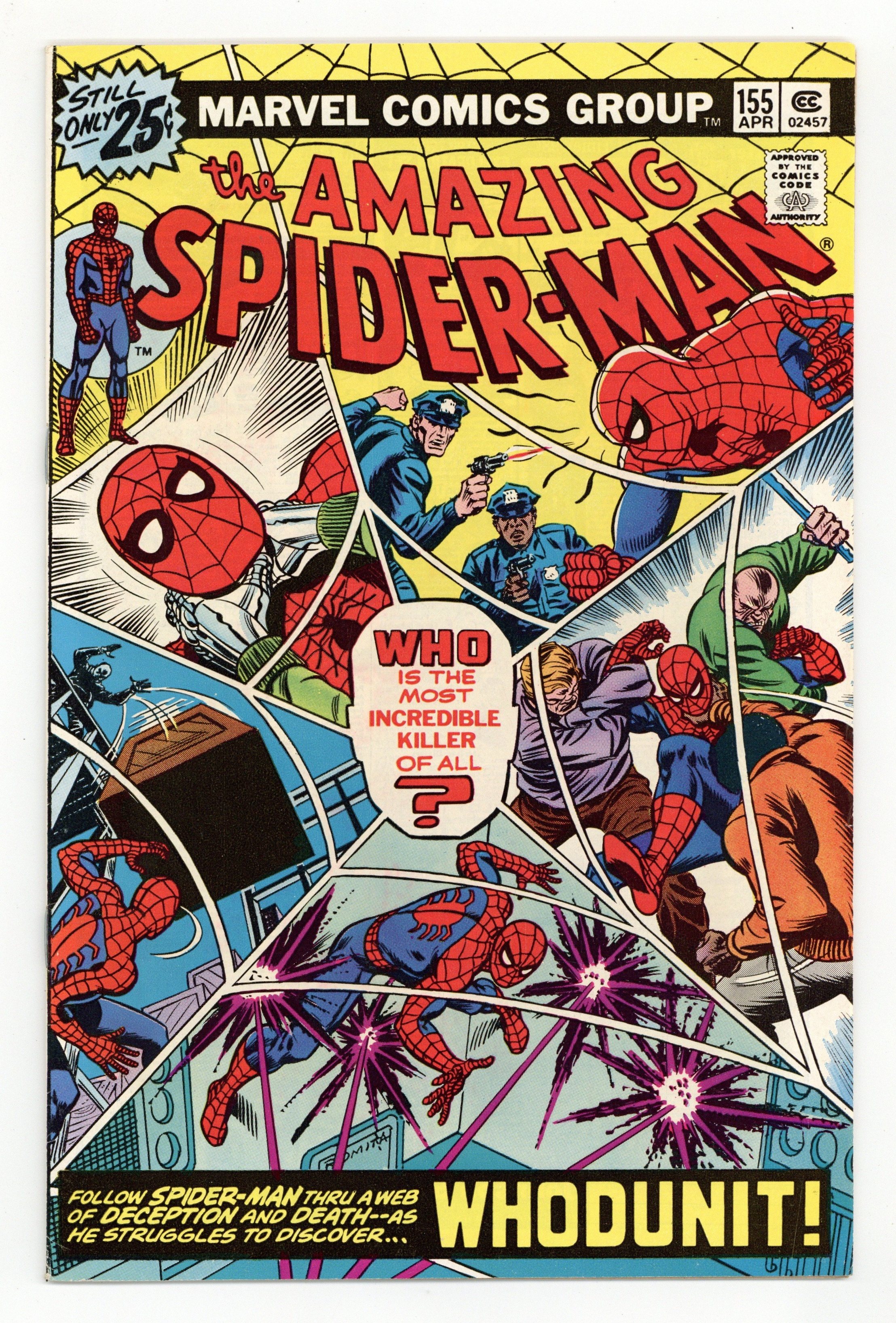 "Whodunit!" Script by Len Wein. Art by Sal Buscema (layouts) and Mike Esposito (finishes). Cover by John Romita. In shocking fashion the co-developer of the Worldwide Habitual Offender database is found murdered in his research lab! And the task of finding the killer falls to none other than your friendly neighborhood Spider-Man! The web-slinger scours the city searching for suspects! But the trail of clues leads back to the lab! Who is the killer? Who indeed! Cameo appearances by Joe Robertson and J. Jonah Jameson. (Notes: The letters page includes a statement of ownership: average print run 530,714; average paid circulation 273,773. This story was reprinted in Marvel Tales 132. A 30-cent cover price variant exists for this issue.) 36 pages. Cover price $0.25.