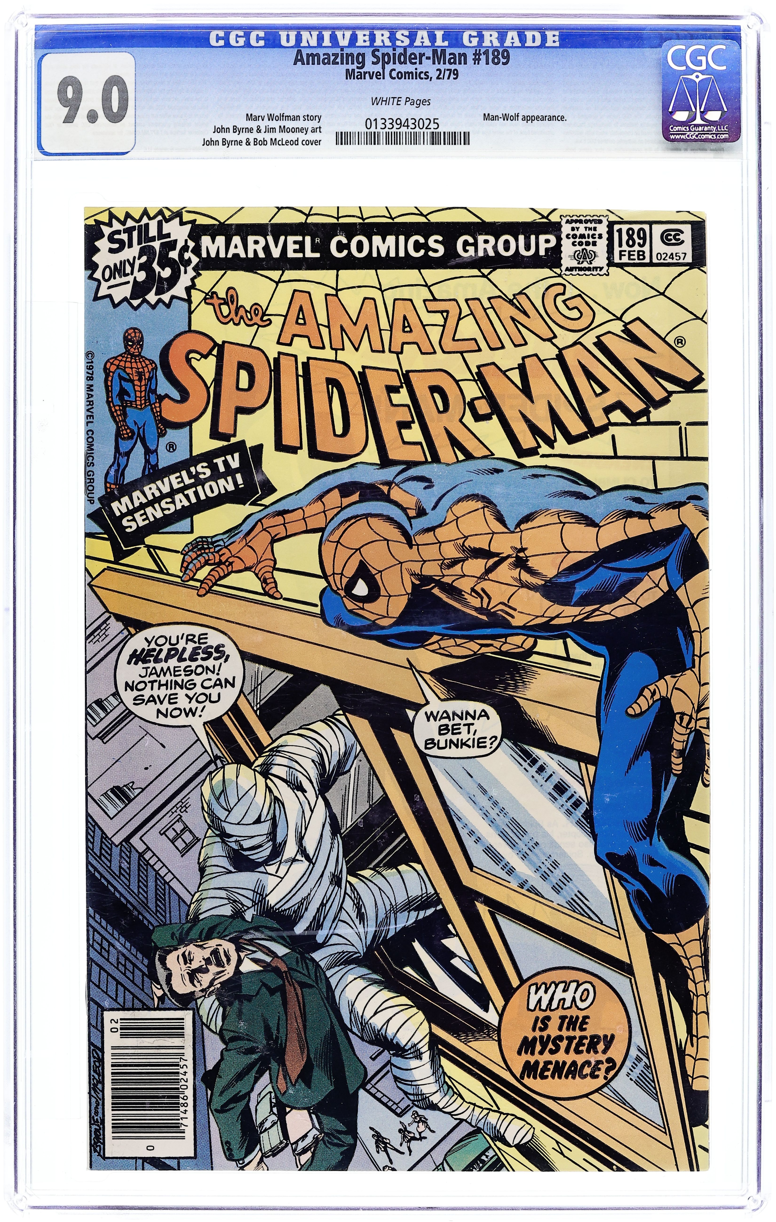 Tags: Marvel Legacy Numbering: Amazing Spider-Man (part 189), Spider-Man$16.50"Mayhem by Moonlight!" Part 1 of 2. Script by Marv Wolfman. Art by John Byrne (breakdowns) and Jim Mooney (finishes). Cover by John Byrne and Bob McLeod. J. Jonah Jameson desperately searches for clues in the kidnapping of his son John! Fearing the worst the stressed out publisher of the Daily Bugle brings every resource to bear! While studying the facts, Joe Robertson realizes that the mysterious kidnapper may have a vendetta against not only Jonah, but the web-slinger too! Jonah doesn't care about Spider-Man though, he only wants to see his son again! And as shown on the terrific cover, J. Jonah Jameson will be reunited with his son! But will it be John the man...or the Man-Wolf? Cameo appearances by Aunt May, Betty Brant, Dr. Marla Madison, and Professor Spencer Smythe. (Notes: The web-slinger previously battled the Man-Wolf in Marvel Team-Up 37. This is one of only three issues John Byrne drew for the Amazing Spider-Man title (1st series): issues 189, 190, and 206.) 36 pgs. Cover price $0.35.