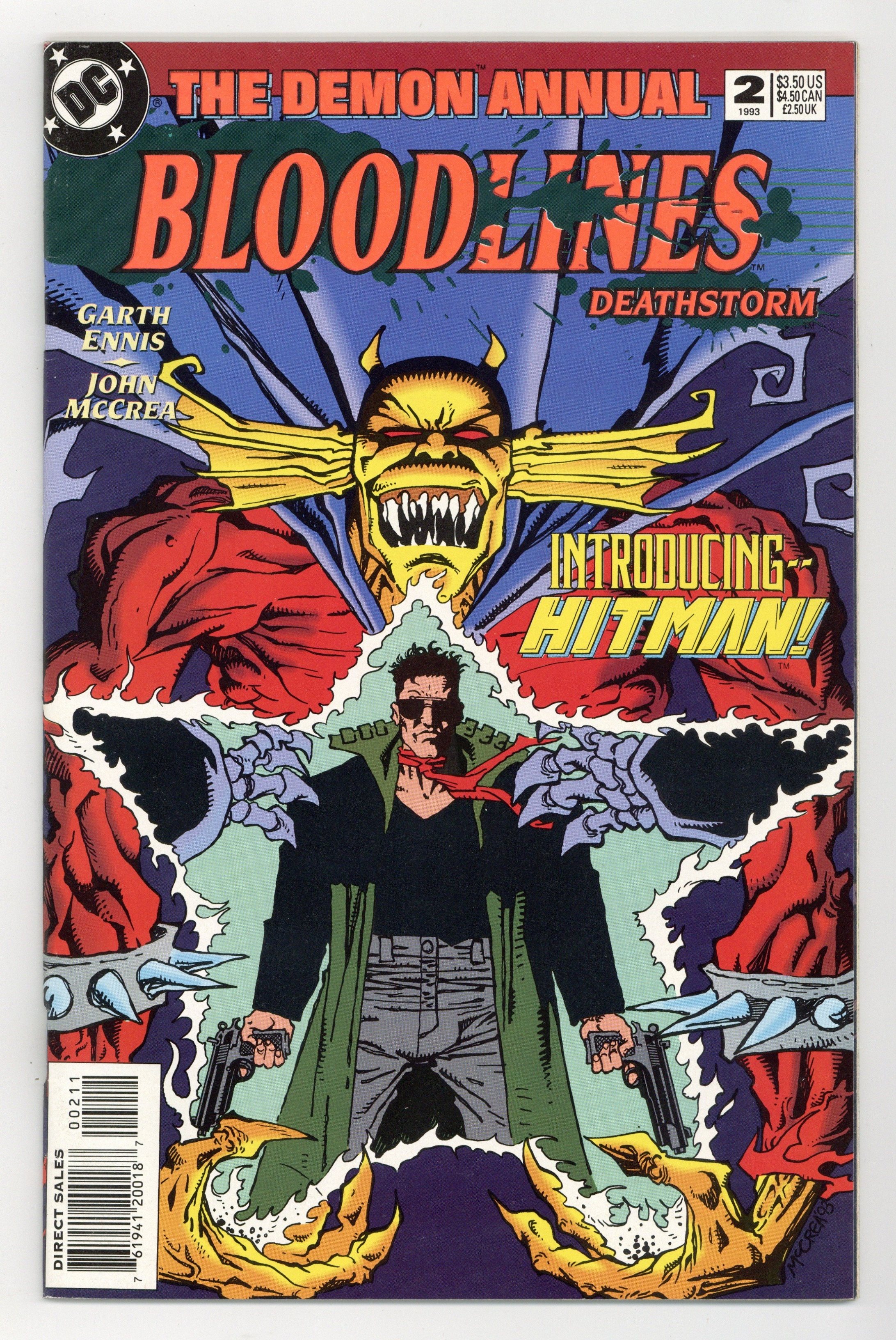 The BLOODLINES Summer Annual crossover event continues from Eclipso Annual (1992) #1. The Demon tastes New Blood when Gotham mob assassin Tommy Monaghan, en route to score a hit against a rival gang leader, is attacked by one of the alien parasites and becomes the well-armed Hitman (1st appearance), this Annual's infusion of New Blood in the DC Universe. BLOODLINES continues in Batman Legends of the Dark Knight Annual (1991) #3. Written by Garth Ennis, with art and cover by John McCrea. Cover price $3.50.